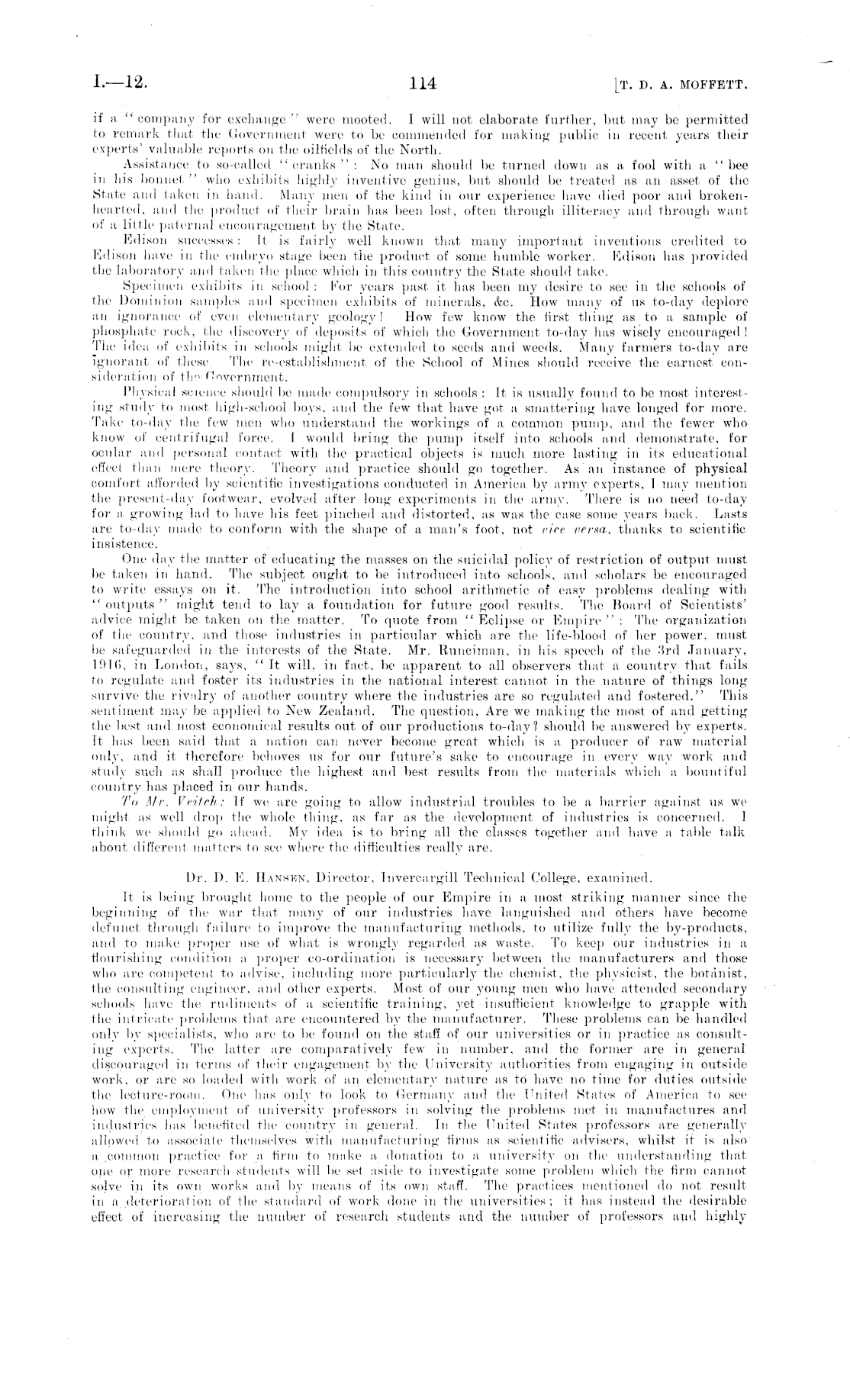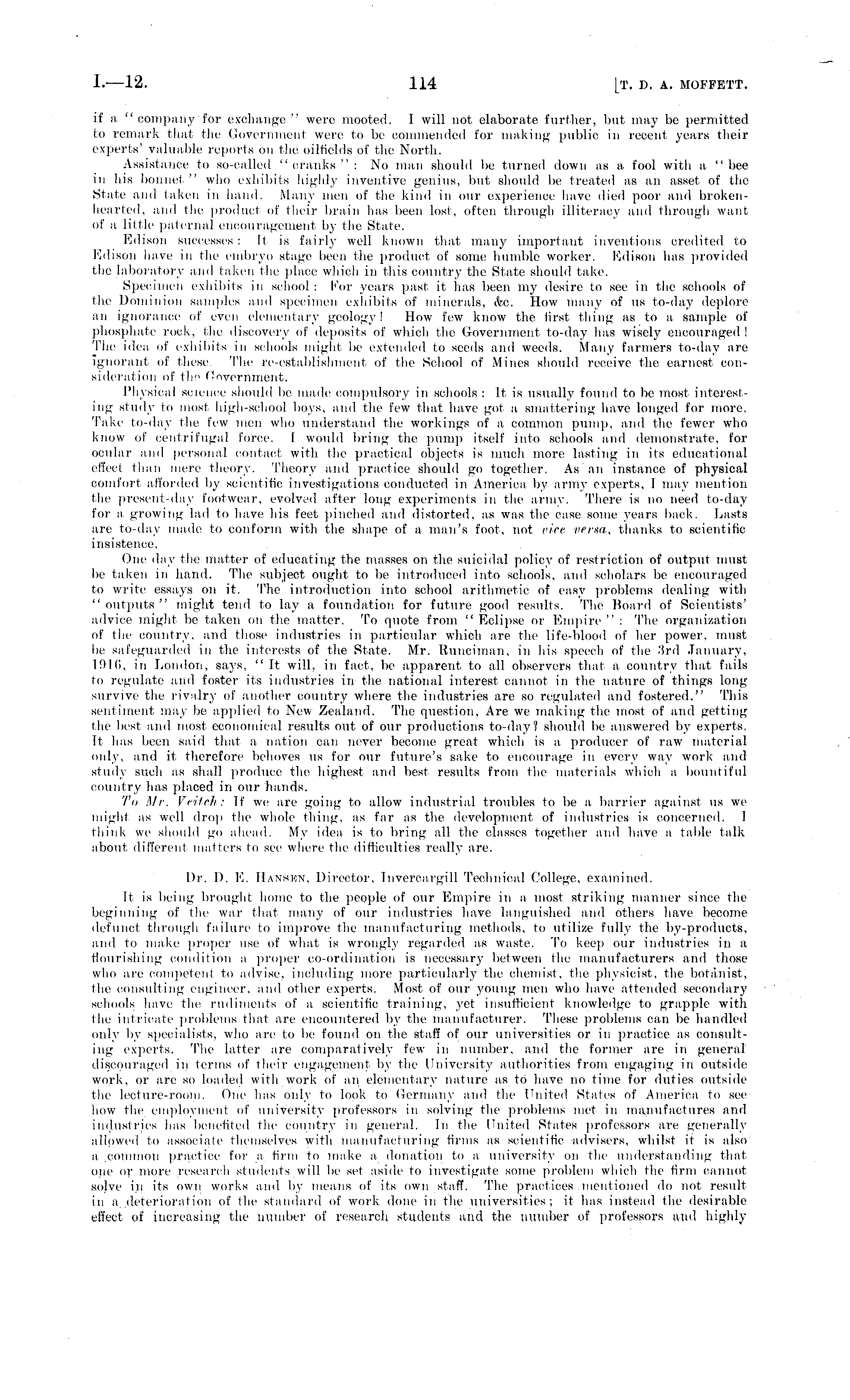 if a " company for exchange" were mooted. I will not elaborate further, but may be permitted to remark that the Government were to be commended for making public, in recent, years their experts' valuable reports on the oilfields of the North. Assistance to so-called "cranks": No man should be turned down as a fool with a "bee in his bonnet " who exhibits highly inventive genius, but should be treated as an asset of the State and taken in hand. Many men of the kind in our experience have died poor and brokenhearted, and the product of their brain has been lost, often through illiteracy and through want of a little paternal encouragement by the State. Edison successes: 11 is fairly well known that many important inventions credited to Edison have iii the embryo stage been the product of some humble worker. Edison has provided the laboratory and taken the place which in this country the State should take. Specimen exhibits in school: for years past, it, has been my desire to see in the schools of the Dominion samples and specimen exhibits of minerals, &0. How many of us to-day deplore an ignorance of even elementary geology! How few know the first thing as to a sample of phosphate rock, the discovery of deposits of which the Government to-day has wisely encouraged! The idea of exhibits in schools might be extended to seeds and weeds. Many farmers to-day are Ignorant of these. The re-eslablishmeiit of the Scliool of Mines should receive the earnest consideration of the Oovernmeiit. Physical science should be made compulsory in schools : It is usually found to be most interesting study to most high-school boys, and the few that have got a smattering have longed for more. Take to-day the few men who understand the workings of a common pump, and the fewer who know of centrifugal force. I would bring the pump itself into schools and demonstrate, for ocular and personal contact with the practical objects is much more lasting in its educational effect than mere theory. Theory and practice should go together. As an instance of physical comfort afforded by scientific investigations conducted in America by army experts, T may mention the present-day footwear, evolved after long experiments in the army. There is no need to-day for a growing lad to have his feet pinched and distorted, as was the case some years back. Lasts are to-day made to conform with the shape of a man's foot, not vice versa, thanks to scientific insistence. One day the matter of educating the masses on the suicidal policy of restriction of output must be taken in hand. The subject ought to be introduced into schools, and scholars be encouraged to write essays on it. The introduction into school arithmetic of easy problems dealing with "outputs" might tend to lay a foundation for future good results. The Board of Scientists' advice might be taken on the matter. To quote from "Eclipse or Empire" : The organization of the country, and those industries in particular which are the life-blood of her power, must be safeguarded in the interests of the State. Mr. Runciman, in his speech of the 3rd January. 1916, in London, says, "It will, in fact, be apparent to all observers that a country that fails to regulate and foster its industries in the national interest cannot in the nature of things long survive the rivalry of another country where the industries are so regulated and fostered." This sentiment may be applied to New Zealand. The question. Are we making the most of and getting the best and most economical results out of our productions to-day? should he answered by experts. It has been said that a nation can never become great which is a producer of raw material only, and it therefore behoves us for our future's sake to encourage, in every way work and study such as shall produce the highest and best results from the materials which a bountiful country has pdaced in our hands. To Mr. Veitch: If we are going to allow industrial troubles to lie a barrier against us we might as well drop the whole thing, as far as the development of industries is concerned, 1 think we should go ahead. My idea is to bring all the classes together and have a table talk about different matters to see where the difficulties really are. Dr. D. E. Hansen, Director, Invercargill Technical College, examined. It is being brought home to the people of our Empire in a most striking manner since the beginning of the war that many of our industries have languished and others have become defunct through failure to improve the manufacturing methods, to utilize fully the by-products, and to make proper use of what is wrongly regarded as waste. To keep our industries in a flourishing condition a proper co-ordination is necessary between (he manufacturers and those who are competent to advise, including more particularly the chemist, the physicist, the botanist, the consulting engineer, and other experts. Most of our young men who have attended secondary schools have the rudiments of a scientific training, yet insufficient knowledge to grapple with the intricate problems that are encountered by the manufacturer. These problems can be handled only by specialists, who are to be found on the staff of our universities or in practice as consulting experts. The latter are comparatively few in number, and the former are in general discouraged in terms of their engagement by the University authorities from engaging in outside work, or arc so loaded with work of an elementary nature as to have no lime for duties outside the lecture-room. One has only Io look to Germany and Hie United Stales of America to see how the employment of university professors in solving the problems met in manufactures and industries has benefited the country in general. In the United .States professors are generally allowed to associate themselves with manufacturing firms as scientific advisers, whilst it is also a .common practice for a firm to make a donation to a university on the understanding tha