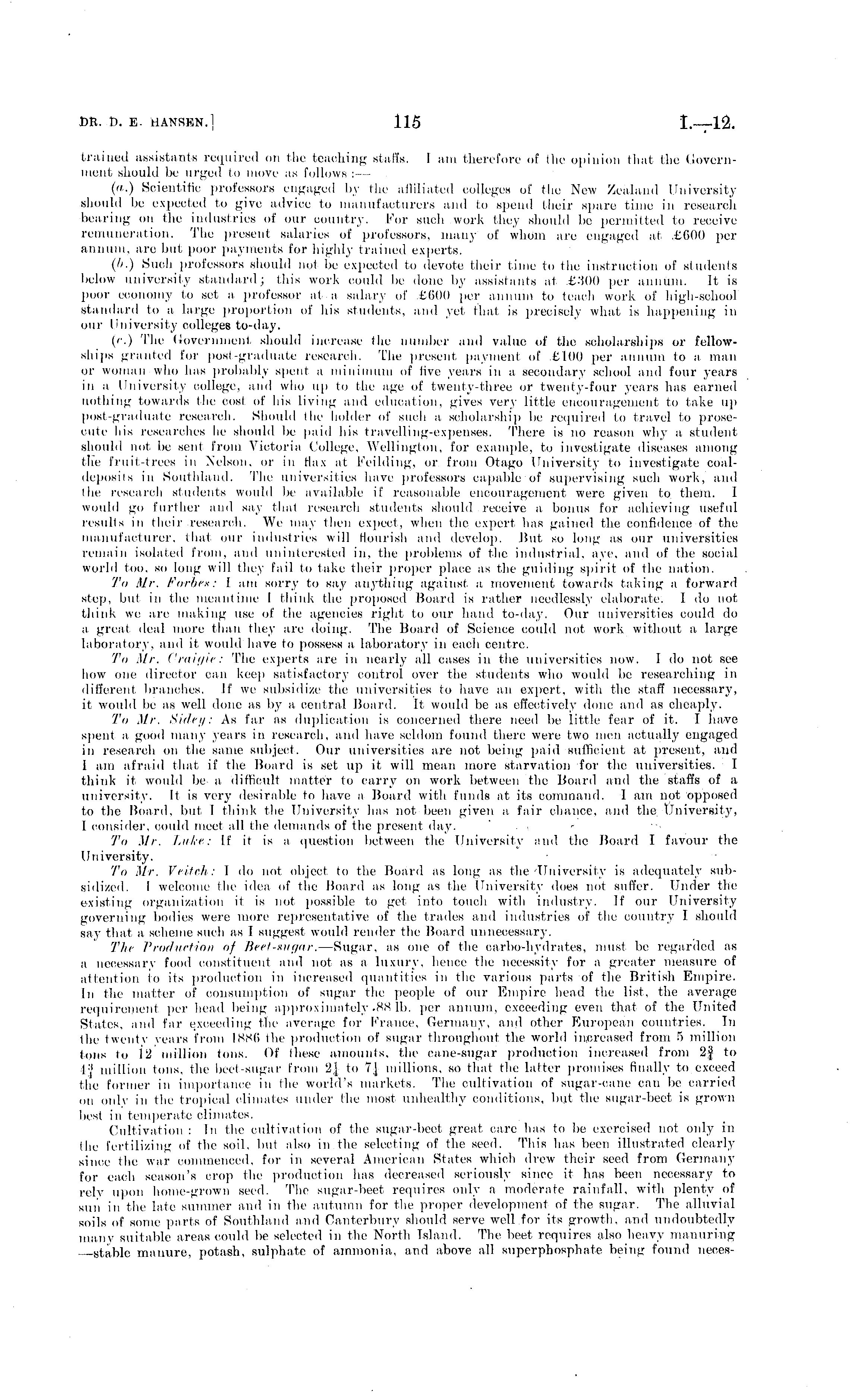 trained assistants required on the leaching staffs. I am therefore of the opinion that the Government should be urged to move as follows : - (a.) Scientific professors engaged by the affiliated colleges of the New Zealand University should be expected to give advice Io manufacturers and lo spend their spare time in research bearing on the industries of our country. For such work they should be permitted to receive remuneration, The present salaries of professors, many of whom are engaged at £600 per annum, are but poor payments for highly trained experts. (I>.) Such professors should tiol be expected to devote (heir time to the instruction of students below university standard; this work could be done by assistants al £300 per annum. It is poor economy to set a professor al a salary of £600 per annuiii to teach work of high-school standard to a large proportion of his students, ami yet thai is precisely what is happening in our University colleges to-day. (c.) The Government should increase Ihe number and value of the scholarships or fellowships granted for post-graduate research. The present payment of £100 per annum to a man or woman who has probably spent a minimum of live years in a secondary school and four years in a University college, and who up to the age of twenty-three or twenty-four years has earned nothing towards the cost of his living anil education, gives very little encouragement to take up post-graduate research. Should Hie holder of such a scholarship be required to travel to prosecute his researches he should be paid his travelling-expenses. There is no reason why a student should not be sen! from Victoria College. Wellington, for example, to investigate diseases among tile fruit-trees in Nelson, or in llax al feilding, or from Otago University to investigate coaldeposits in Southland. The universities have professors capable of supervising such work, and the research students would be available if reasonable encouragement were given to them. I would go further and say thai research students should receive a bonus for achieving useful results in their research. We may then expect, when the expert has gained the confidence of the manufacturer, thai our industries will flourish and develop. Bui so long as our universities remain isolated from, and uninterested in, the problems of the industrial, aye, and of the social world too. so long will they fail lo take their proper plaoe as the guiding spirit of the nation. To Mr. Forbes: I am sorry to say anything against a movement towards taking a forward step, but in the meantime I think the proposed Board is rather needlessly elaborate. I do not think we arc making use of Ihe agencies right to our hand to-day. Our universities could do a great deal more than they arc doing. The Board of Science could not work without a large laboratory, and it would have to possess a laboratory in each centre, To Mr. Graigie: The experts are in nearly all eases in Ihe universities now. I do not see how one director can keep satisfactory control over Ihe students who would be researching in different branches. If we subsidize the universities to have an expert, with Hie staff necessary, it would be as well done as by a central Board. It would be as effectively done and as cheaply, To Mr. Sidey: As far as duplication is concerned there need be little fear of it, I have spent a good many years in research, and have seldom found there were two men actually engaged in research on the same subject. Our universities are not being paid sufficient at present, and I am afraid that if the Board is set, up it will mean more starvation for the universities. I think it would be a difficult matter lo carry on work between the Hoard and (he staffs of a university. It is very desirable to have a Board with funds at its command. 1 am not opposed to the Board, but I think the University has not been given a fair chance, and the University, I consider, could meet all (he demands of the present day. To Mr. Luke: If it is a question between the University and the Board I favour Ihe University. To Mr. Veitch: I do not object to the Board as long as the' University is adequately subsidized. I welcome Hie idea of the Board as long as Ihe University does not suffer. Under the existing organization it is not possible lo get into touch with industry. If our University governing bodies were more representative of the trades and industries of the country 1 should say that a scheme such as I suggest would render the Board unnecessary. The Production of Beet-sugar. —Sugar, as one of the carbo-hydrates, must be regarded as a noeossarv food constituent and not as a luxury, hence the necessity for a greater measure of attention to its production in increased quantities in tin' various parts of the British Empire. In Hie matter of consumption of sugar the people of our Umpire head the lis! , the average requirement per head being approximately .88 lb. per annum, exceeding even that of the United States, and far exceeding the average for franco, Germany, and other European countries. In the twenty years from 1886 the production of sugar throughout Hie world increased from 5 million tons to 12 million tons. Of these amounts, the cane-sugar production increased from 2J to 1? million lons, the beet-sugar from 21 to 7} millions, so that the latter promises finally to exceed the former in importance in Ihe world's markets. The cultivation of sugar-cane can be carried no only in the tropical climates under Hie most unhealthy conditions, but Ihe sugar-beet is grown best in temperate climates. Cultivation : In the cultivation of the sugar-beet great care has to be exercised not only in the fertilizing of the soil, but also in the selecting of the seed. This has been illustrated clearly since the war commenced, for in several American States which drew (heir seed from Germany for each season's crop Ihe production has decreased seriously since it has been necessary to rely upon hom