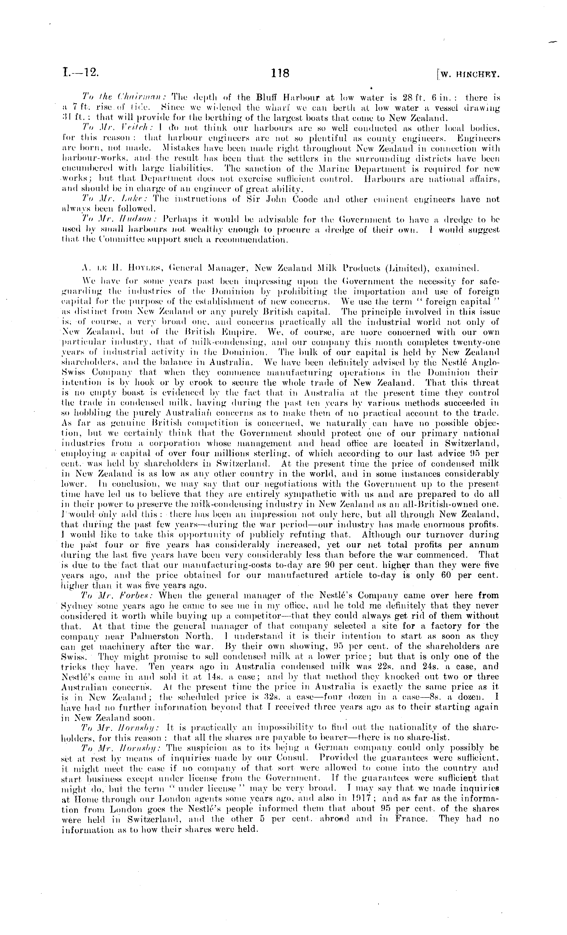 To the Chairman: The depth of Ihe Bluff Harbour at low water is 28 ft. 6 in.: there is a 7ft l rise of tide. Since we widened the wharf we can berth at. low water a vessel drawing 31 ft. : that will provide for the berthing of the largest boats that come to New Zealand. To Mr. Veitch: I do not think our harbours arc so well oonducted as other local bodies, for this reason: that harbour engineers are mil so plentiful as county engineers. Engineers are born, not made. Mistakes have been made right throughout New Zealand in connection with harbour-works, and the result has been thai the settlers in the surrounding districts have been encumbered with large liabilities. The sanction of the Marine Depa I'tmciil is required for new works; but that Department does no! exercise sufficient control. Harbours are national affairs, and should be in charge of an engineer of great ability. To Mr. Luke: The instructions of Sir John Coode and other eminent engineers have not always been followed. 7'< i Mr. Hudson: Perhaps it would be advisable for Hie Government lo have a dredge lo be used by small harbours not wealthy enough lo procure a dredge of their own. I would suggest thai the Committee support such a recommendation. A. i.i-: 11. HOYLES, General Manager. New Zealand Milk Products (Limited), examined. We have for sonic years past been impressing upon the Government the necessity for safeguarding the industries of ihe Dominion by prohibiting the importation and use of foreign capilal for Ihe purpose of (he establishment of new concerns. We use the term " foreign capital " as distinct from New Zealand or any purely British capital, The principle involved in this issue is, of course, a very broad one. and concerns practically all the industrial world not only of New Zealand, but of Ihe British Umpire. We, of course, are more concerned with our own particular industry, thai of milk-condensing, and our company this month completes twenty-one years of industrial activity in the Dominion. The bulk of our capital is held by New Zealand shareholders, and the balance in Australia. We have been definitely advised by the Nestle AngloSwiss Company that when they commence manufacturing operations in the Dominion their intention is by hook or by crook to secure the whole trade of New Zealand. That this threat is no empty boast is evidenced by the fact that in Australia at the present time they control the trade in condensed milk, having during the past len years by various methods succeeded in so hobbling (he purely Australian concerns as to make them of no practical account to Hie trade. As far as genuine British competition is concerned, we naturally can have no possible objection, but we certainly think that the Government should protect one of our primary national industries from a corporation whose management and head ollice are located in Switzerland, employing a capital of over four millions sterling, of which according to our last advice 95 per cent, was held by shareholders in Switzerland. At the present time the price of condensed milk in New Zealand is as low as any other country in the world, and in some instances considerably lower. In conclusion, we may say that our negotiations with Ihe Government up to the present time have led us to believe that they are entirely sympathetic with us and are prepared to do all in their power to preserve the milk-condensing industry in New Zealand as an all-British-owned one. 1 would only add (his: there has been an impression mil only here, but all through New Zealand, (hat during the past few years —during the war period —our industry has made enormous profits. I would like to take this'opportunity of publicly refuting that, Although our turnover during the past four or five years has considerably increased, yet our net total profits per annum during the last five years have been very considerably less than before the war commenced. That is due to the fact that our manufacturing-costs to-day are 90 per cent, higher than they were five years ago, and the price obtained for our manufactured article to-day is only 60 per cent, higher than it was five years ago. To Mr. Forbes: When the general manager of the Nestles Company came over here from Sydney some years ago he came to sec me in my office, and he told me definitely that they never considered it worth while buying up a competitor—that they could always get rid of them without that. At that time the general manager of thai company selected a site for a factory for the company near Palmerston North. I understand it is their intention to star! as soon as they can gel machinery after the war. By their own showing, 95 per cent, of the shareholders are Swiss. They might promise to sell condensed milk al a lower price; but that is only one of the tricks they have. Ten years ago in Australia condensed milk was 225. and 245. a case, and Nestles came in and sold il at I Is. a case; and by that method they knocked out two or three Australian concerns. At the present time the price in Australia is exactly Ihe same price as it is in New Zealand ; the scheduled price is 325. a case —four dozen in a case —Bs. a dozen. I have had no further information beyond that 1 received three years ago as to their starting again in New Zealand soon. To Mr. Hornsby: It is practically an impossibility to find out Ihe nationality of the shareholders, for this reason : that all Hie shares are payable to bearer—there is no share-list, To Mr. Hornsby: The suspicion as lo ils being a German company could only possibly be set at rest by means of inquiries made by our Consul. Provided Ihe guarantees were sufficient, it might meet the case if no company of that sort were allowed to conic into the country and start business except under license from the Government, If the guarantees were sufficient that might do, but the term " under license" may lie xery broad. I may say that we made inquiries at Home through our London agents some year