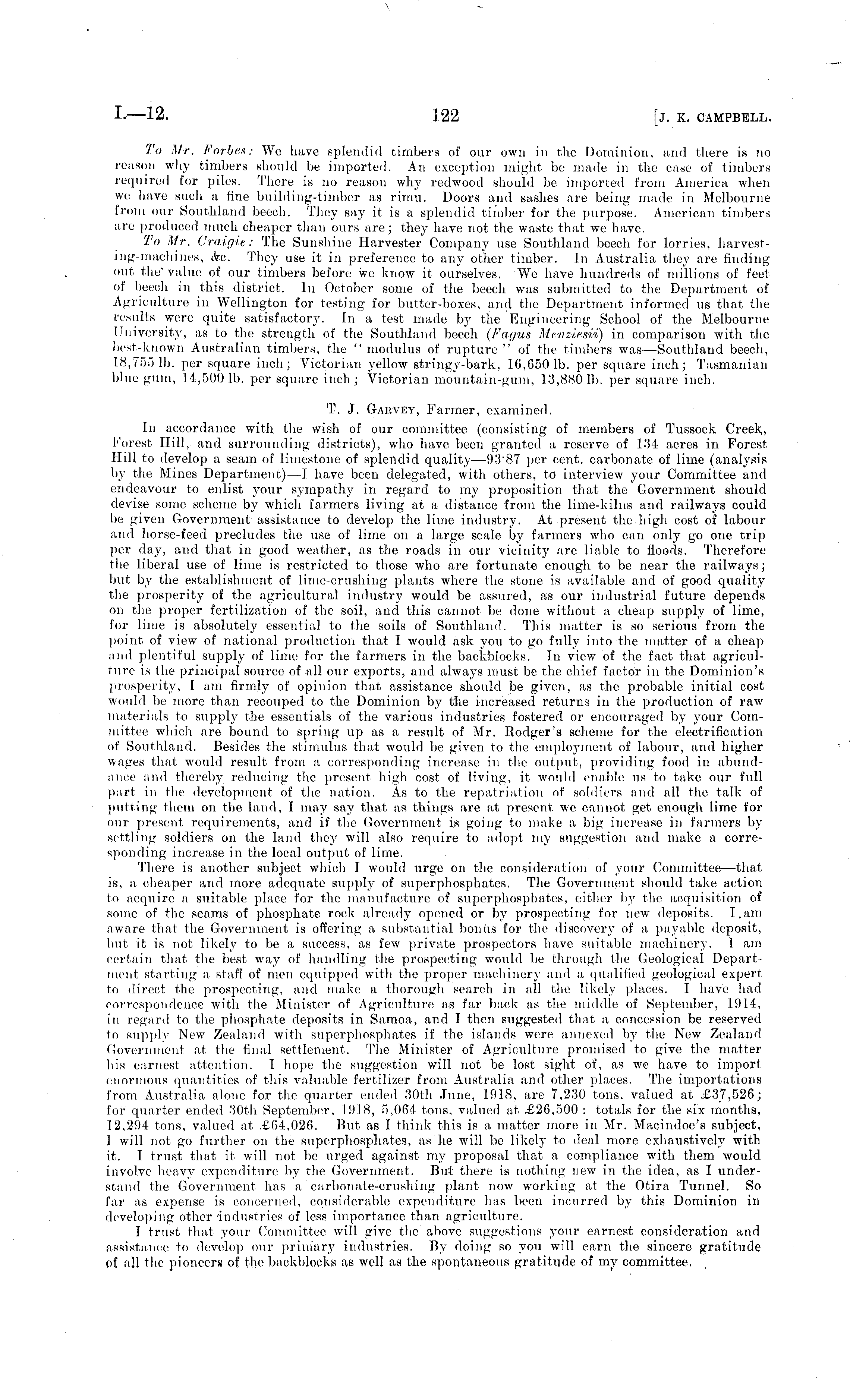 To Mr. Forbes: We have splendid timbers of our own in the Dominion, and there is no reason why timbers should be imported. An exception might be made in the case of timbers required for piles. There is no reason why redwood should be imported from America when we have such a fine building-timber as rimu. Doors and sashes are being made in Melbourne from our Southland beech. They say it is a splendid timber for the purpose. American timbers are produced much cheaper than ours are; they have not the waste that, we have. To Mr. Graigie: The Sunshine Harvester Company use Southland beech for lorries, harvest-ing-machines, tvc. They use it in preference to any other timber. In Australia, they are finding out the'value of our timbers before we know it ourselves. We have hundreds of millions of feel of beech in this district. In October some of the beech was submitted to the Department of Agriculture in Wellington for testing for butter-boxes, and (he Department informed us that, the results were quite satisfactory. In a test made by the 'Engineering School of the Melbourne University, as to the strength of the Southland beech (Fagus Menziesii) in comparison with the best-known Australian timbers, the " modulus of rupture " of the timbers was —Southland beech, 18,755 Ib. per square inch; Victorian yellow stringy-bark, 16,6501b. per square inch; Tasmanian blue gum, 14,500 Ib. per square inch; Victorian mountain-gum, 13,880 lb, per square inch. T. J. Gahvey, Farmer, examined. In accordance with the wish of our committee (consisting of members of Tussock Creek, forest Hill, and surrounding districts), who have been granted a reserve of 134 acres in Forest Hill to develop a seam of limestone of splendid quality —9387 per cent, carbonate of lime (analysis by the Mines Department)—l have been delegated, with others, to interview your Committee and endeavour to enlist your sympathy in regard to my proposition that the Government should devise some scheme by which farmers living at a distance from the lime-kilns and railways could be given Government assistance to develop the lime industry. At present the.high cost of labour and horse-feed precludes the use of lime on a large scale by farmers who can only go one trip per day, and that in good weather, as the roads in our vicinity are liable to floods. Therefore the liberal use of lime is restricted to those who are fortunate enough to be near the railways; but by the establishment of lime-crushing plants where the stone is available and of good quality the prosperity of the agricultural industry would be assured, as our industrial future depends on the proper fertilization of the soil, and this cannot be done without a cheap supply of lime, for lime is absolutely essential to the soils of Southland. This matter is so serious from the point of view of national production that I would ask you to go fully into the matter of a cheap and plentiful supply of lime for the farmers in the backblocks. In view of the fact that agriculture is the principal source of all our exports, and always must be the chief factor in the Dominion's prosperity, I am firmly of opinion that assistance should be given, as the probable initial cost would be more than recouped to the Dominion by the increased returns in the production of raw materials to supply the essentials of the various industries fostered or encouraged by your Committee which are bound to spring up as a result of Mr. Rodger's scheme for the electrification of Southland. Besides the stimulus that would be given to the employment of labour, and higher wages that would result from a corresponding increase in the output, providing food in abundance and thereby reducing the present high cost of living, it, would enable us to take our full part in the development of the nation. As to the repatriation of soldiers and all the talk of putting them on the land, I may say that as things are at present we cannot get enough lime for our present requirements, and if the Government is going to make a big increase in farmers by settling soldiers on the land they will also require to adopt my suggestion and make a corresponding increase in the local output of lime. There is another subject which I would urge on the consideration of your Committee —that is, a cheaper and more adequate supply of superphosphates. The Government should take action to acquire a suitable place for the manufacture of superphosphates, either by Hie acquisition of some of the seams of phosphate rock already opened or by prospecting for new deposits, lain aware that the Government is offering a, substantial bonus for the discovery of a payable deposit, but it is not likely to be a success, as few private prospectors have suitable machinery. 1 am certain that the best way of handling the prospecting would be through the Geological Department starting a staff of men equipped with the proper machinery and a qualified geological expert lo direct the prospecting, and make a thorough search in all the likely places. I have had correspondence with the Minister of Agriculture as far back as the middle of September, 1914, in regard to the phosphate deposits in Samoa, and I then suggested (hat a concession be reserved to supply New Zealand with superphosphates if the islands were annexed by the New Zealand Government at the final settlement. The Minister of Agriculture promised to give the matter his earnest, attention. I hope the suggestion will not be lost sight of, as we have to import enormous quantities of this valuable fertilizer from Australia and other places. The importations from Australia alone for the quarter ended 30th June, 1918, are 7,230 tons, valued at, £37,526; for quarter ended 30th September, 1918, 5,064 tons, valued at £26,500 : totals for the six months, 12,294 tons, valued at £64,026. But as I think this is a matter more in Mr. Macindoe's subject, 1 will not, go further on the superphosphates, as he will be likely to deal more exh