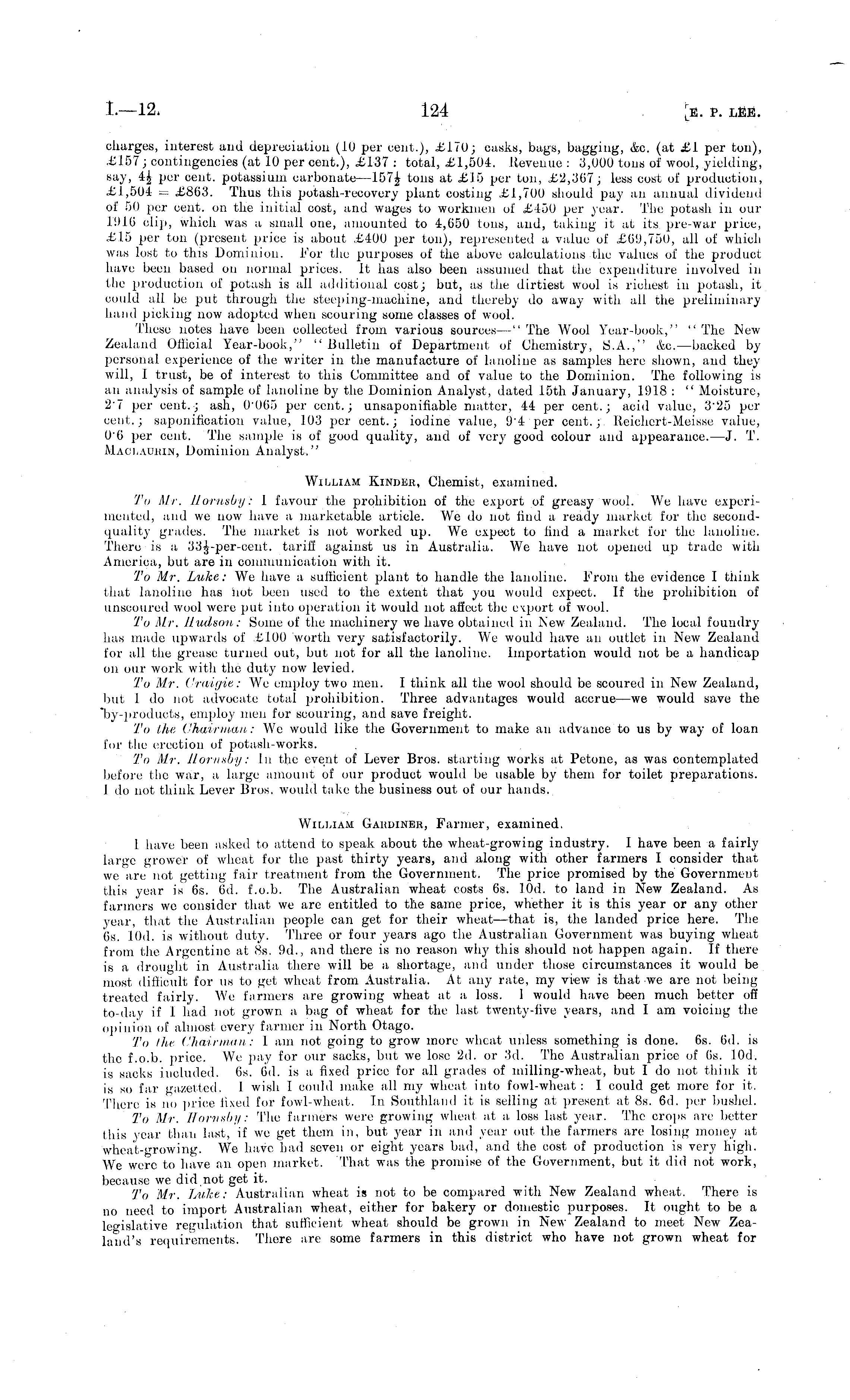 charges, interest and depreciation (10 per cent.), £170; casks, bags, bagging, &c. (at £1 per ton), £157; contingencies (at 10 per cent.), £137 : total, £1,504. Revenue : 3,000 tons of wool, yielding, say, 4£ per cent, potassium carbonate —157£ tons at £15 per ton, £2,367; less cost of production, £1,504 = £863. Thus this potash-recovery plant costing £1,700 should pay an annual dividend of 50 per cent, on the initial cost, and wages to workmen of £450 per year. The potash in our 1916 clip, which was a small one, amounted to 4,650 lons, and, taking it at its pre-war price, £15 per ton (present price is about £400 per ton), represented a value of £69,750, all of which was lost to this Dominion. For the purposes of the above calculations the values of the product have been based on normal prices. It has also been assumed that the expenditure involved in the production of potash is all additional cost; but, as the dirtiest wool is richest in potash, it could all be put through the steeping-machine, and thereby do away with all the preliminary hand picking now adopted when scouring some classes of wool. These notes have been collected from various sources —"The Wool Year-book," "The New Zealand Official Year-book," "Bulletin of Department, of Chemistry, 5.A.," etc.—backed by personal experience of the writer in the manufacture of lanoline as samples here shown, and they will, I trust, be of interest to this Committee and of value to the Dominion. The following is an analysis of sample of lanoline by the Dominion Analyst, dated 15th January, 1918 : " Moisture, 27 per cent.-; ash, 0065 per cent.; unsaponifiable matter, 44 per cent.; acid value, 325 per cent.; saponification value, 103 per cent.; iodine value, 94 per cent.; Reichert-Meisse value, o'6 per cent. The sample is of good quality, and of very good colour and appearance. —J. T. Maclaukin, Dominion Analyst." William Kinder, Chemist, examined. To Mr. Hornsby: I favour the prohibition of the export of greasy wool. We have experimented, and we now have a marketable article. We do not find a ready market for the secondquality grades. The market is not worked up. We expect to find a market for the lanoline. There is a tariff against us in Australia. We have not opened up trade with America, but are in communication with it. To Mr. Luke: We have a sufficient plant to handle the lanoline. From the evidence I think that lanoline has hot been used to the extent that you would expect. If the prohibition of unsecured wool were put into operation it would not affect the export of wool. To Mr. Hudson: Some of the machinery we have obtained in New Zealand. The local foundry has made upwards of £100 worth very satisfactorily. We would have an outlet in New Zealand for all the grease turned out, but not for all the lanoline. Importation would not be a handicap on our work with the duty now levied. To Mr. Graigie: We employ two men. I think all the wool should be scoured in New Zealand, but I do not advocate total prohibition. Three advantages would accrue —we would save the "by-products, empiloy men for scouring, and save freight. To the Chairman: We would like the Government to make an advance to us by way of loan for the erection of potash-works. To Mr. Hornsby: In the event of Lever Bros, starting works at Petone, as was contemplated before the war, a large amount of our product would be usable by them for toilet preparations. I do not think Lever Bros, would take the business out of our hands. William Gardiner, Farmer, examined. 1 have been asked to attend to speak about the wheat-growing industry. I have been a fairly large grower of wheat for the past thirty years, and along with other farmers I consider that we are not getting fair treatment from the Government. The price promised by the Government this year is 6s. 6d. f.o.b. The Australian wheat costs 6s. lOd. to land in New Zealand. As farmers we consider that we are entitled to the same price, whether it is this year or any other year, that the Australian people can get for their wheat—that is, the landed price here. The 6s. lOd. is without duty. Three or four years ago the Australian Government was buying wheat from the Argentine at Bs. 9d., and there is no reason why this should not happen again. If there is a drought in Australia there will be a shortage, and under those circumstances it would be most difficult for us to get wheat from Australia. At any rate, my view is that we are not being treated fairly. We farmers are growing wheat at a loss. 1 would have been much better off to-day if I had not grown a bag of wheat for the last twenty-five years, and I am voicing the opinion of almost every farmer in North Otago. To the Chairman: lam not going to grow more wheat unless something is done. 6s. 6d. is the f.o.b. price. We pay for our sacks, but we lose 2d. or 3d. The Australian price, of (is. lOd. is sacks included. 6s. 6d. is a fixed price for all grades of milling-wheat, but Ido not think it is so far gazetted. I wish I could make all my wheat into fowl-wheat : I could get more for it. There is no price fixed for fowl-wheat. In Southland it is selling at present at Bs. 6d. per bushel. To Mr. Hornsby: The farmers were growing wheat at a loss last year. The crops are better this year than last, if we get them in, but year in and year out the farmers are losing money at wheat-growing! We have had seven or eight years bad, and the cost of production is very high. We were to have an open market, That was the promise of the Government, but it did not work, because we did,not get it. To Mr. Luke: Australian wheat is not to be compared with New Zealand wheat. There is no need to import Australian wheat, either for bakery or domestic purposes. It ought to be a legislative regulation that sufficient wheat should be grown in New Zealand to meet New Zealand's requirements. There are some farmers in this district who have not grown wheat for
