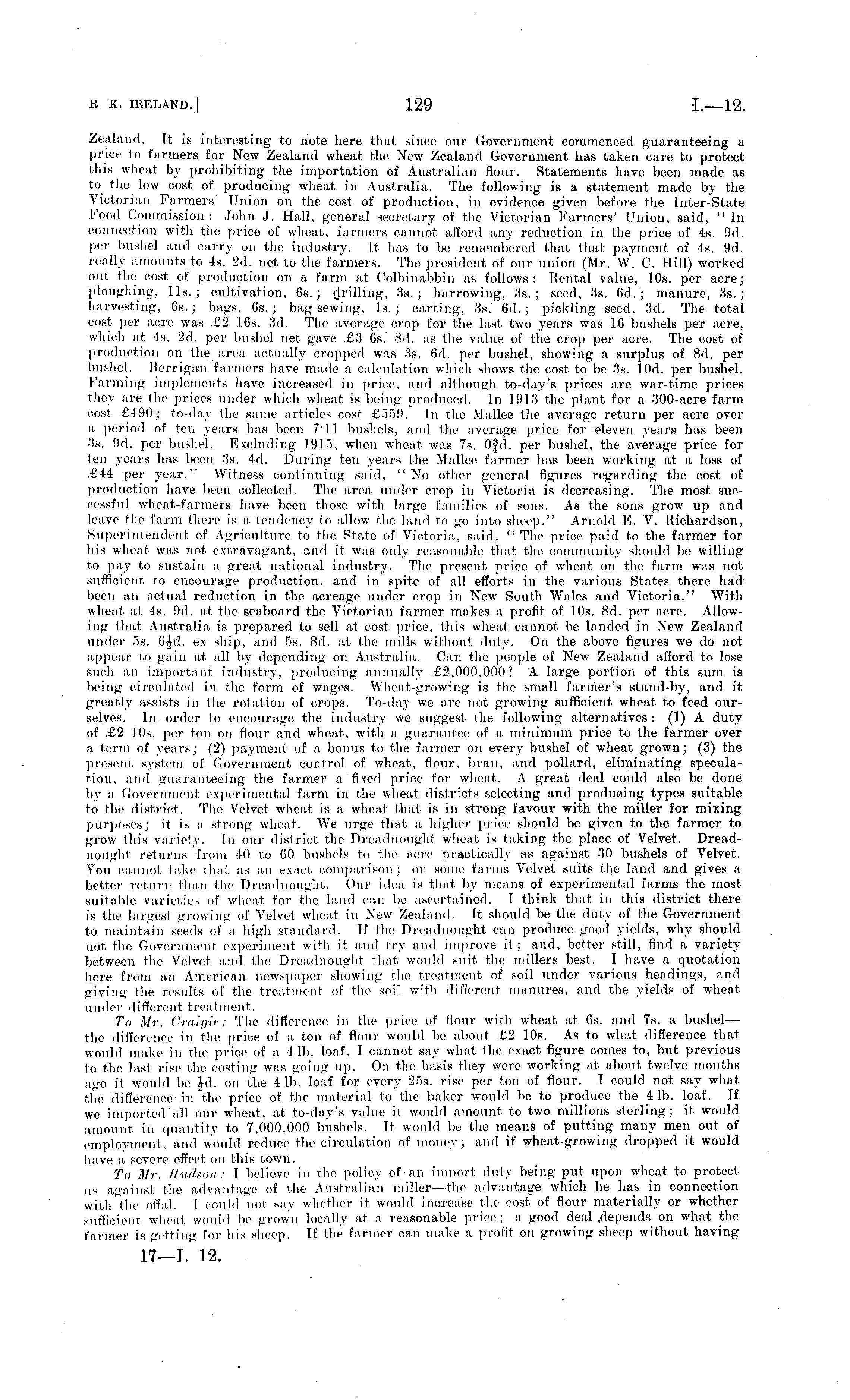 Zealand. It is interesting to note here that since our Government commenced guaranteeing a price to farmers for New Zealand wheat the New Zealand Government has taken care to protect this wheat by prohibiting the importation of Australian flour. Statements have been made as to the low cost of producing wheat in Australia. The following is a statement made by the Victorian Farmers' Union on the cost of production, in evidence given before the Inter-State Food Commission : John J. Hall, general secretary of the Victorian Farmers' Union, said, " In connection with the price of wheat, farmers cannot afford any reduction in the price of 4s. !)d. per bushel and carry on the industry. It has to be. remembered that that payment of 4s. 9d. really amounts to 4s. 2d. net to the farmers. The president of our union (Mi-. W"'. C. Hill) worked out the cost of production on a farm at Colbinabbin as follows: Rental value, 10s. per acre; ploughing, lis.; cultivation, 65.; drilling, 35.; harrowing, 35.; seed, 3s. 6d. ; manure, 35.; harvesting, 65.; bags, 65.; bag-sewing, Is.; carting, 3s. 6d. ; pickling seed, 3d. The total cost per acre was £2 I6s. 3d. The average crop for the last two years was 16 bushels per acre, which at 4s. 2d. per bushel net gave £3 6s. Bd. as the value of the crop per acre. The cost of production on the area actually cropped was 3s. 6d. per bushel, showing a surplus of Bd. per bushel. Berrigan farmers have made a calculation which shows the cost to be 3s. lOd. per bushel. Farming implements have increased in price, and although to-day's prices are war-time prices they are the prices under which wheat is being produced. In 1913 the plant for a 300-acre farm cost £490; to-day the same articles cost £559. In the Malice the average return per acre over a period of ten years has been 7'll bushels, and the average price for eleven years has been 3s. 9d. per bushel. Excluding 1915, when wheat was 7s. Ofd. per bushel, the average price for ten years has been 3s. 4d. During ten years the Mallee farmer has been working at a loss of £44 per year." Witness continuing said, "No other general figures regarding the cost of production have been collected. The area under crop in Victoria is decreasing. The most successful wheat-farmers have been those with large families of sons. As the sons grow up and leave the farm there is a tendency to allow the land to go into sheep." Arnold E. V. Richardson, Superintendent of Agriculture to the State of Victoria, said, "The price paid to the farmer for his wheat was not extravagant, and it was only reasonable that the community should be willing to pay to sustain a great national industry. The present price of wheat on the farm was not sufficient to encourage production, and in spite of all efforts in the various States there had been an actual reduction in the acreage under crop in New South Wales and Victoria," With wheat at 4s. 9d. at the seaboard the Victorian farmer makes a profit of 10s. Bd. per acre. Allowing that Australia is prepared to sell at cost price, this wheat cannot be landed in New Zealand under ss. 6|d. ex ship, and ss. Bd. at the mills without duty. On the above figures we do not appear to gain at all by depending on Australia. Can the people of New Zealand afford to lose such an important industry, producing annually £2,000,000? A large portion of this sum is being circulated in the form of wages. Wheat-growing is the small farmer's stand-by, and it greatly assists in the rotation of crops. To-day we are not growing sufficient wheat to feed ourselves. In order to encourage the industry we suggest the following alternatives : (1) A duty of £2 10s. per ton on flour and wheat, with a guarantee of a minimum price to the farmer over a ternl of years; (2) payment of a bonus to the farmer on every bushel of wheat grown; (3) the present, system of Government control of wheat, flour, bran, and pollard, eliminating speculation, and guaranteeing the farmer a fixed price for wheat. A great deal could also be done by a Government experimental farm in the wheat districts selecting and producing types suitable to the district, The Velvet wheat is a wheat that is in strong favour with the miller for mixing purposes; it is a strong wheat, We urge that a higher price should be given to the farmer to grow this variety. In our district the Dreadnought wheat is taking the place of Velvet. Dreadnought returns from 40 to 60 bushels to the acre practically as against 30 bushels of Velvet, You cannot, take that as an exact comparison ; on some farms Velvet suits the land and gives a better return than the Dreadnought, Our idea is that by means of experimental farms the most suitable varieties of wheat for the land can be ascertained. T think that in this district there is the largest growing of Velvet wheat in New Zealand. It should be the duty of the Government to maintain seeds of a high standard. If the Dreadnought can produce good yields, why should not the Government experiment with it and try and improve it; and, better still, find a variety between the Velvet and Hie Dreadnought thai would suit the millers best. I have a quotation here from an American newspaper showing Hie treatment of soil under various headings, and giving the results of the treatment of the soil with different manures, and the yields of wheat under different treatment. To Mr. Graigie: The difference in the price of Hour with wheat at 6s. and 7s. a bushel— the difference in the price of a ton of flour would be about £2 10s. As to what difference that would make in the price of a 41b. loaf, I cannot say what Hie exact figure comes to, but previous to the last rise the costing was going up. On the basis they were working at, about twelve months ago it would be J-d. on the 41b. loaf for every 255. rise per ton of flour. I could not say what the difference in "the price of the material to the baker would be to produce the 41b. loaf. Tf we imported'all our wheat, at to-day's value 