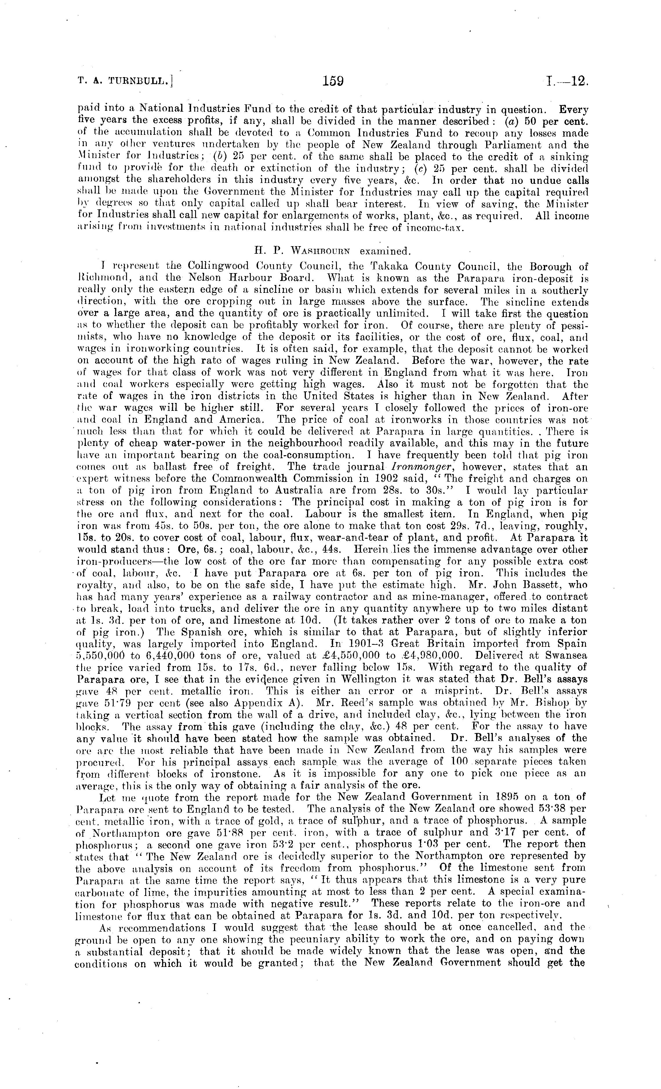 paid into a National Industries Fund to the credit of that particular industry in question. Every five years the excess profits, if any, shall be divided in the manner described : (a) 50 per cent, of the accumulation shall be devoted to a Common Industries Fund to recoup any losses made in any other ventures undertaken by the people of New Zealand through Parliament and the Minister for Industries; (b) 25 per cent, of the same shall be placed to the credit of a sinking fund to provide for the death or extinction of the industry; (c) 25 per cent, shall be divided amongst the shareholders in this industry every five years, &c. In order that no undue calls shall be made upon the Government the Minister for Industries may call up the capital required by degrees so that only capital called up shall bear interest. In view of saving, the Minister for Industries shall cajl new capital for enlargements of works, plant, &c, as required. All income arising from investments in national industries shall be free of income-tax. H. P. Washbourn examined. I represent the Collingwood County Council, the Takaka County Council, the Borough of Richmond, and the Nelson Harbour Board. What is known as the Parapara iron-deposit is really only the eastern edge of a sincline or basin which extends for several miles in a southerly direction, with the ore cropping out in large masses above the surface. The sincline extends over a large area, and the quantity of ore is practically unlimited. I will take first the question as to whether the deposit can be profitably worked for iron. Of course, there are plenty of pessimists, who have no knowledge of the deposit or its facilities, or the cost of ore, flux, coal, and wages in ironworking countries. It is often said, for example, that the deposit cannot be worked on account of the high rate of wages ruling in New Zealand. Before the war, however, the rate of wages for that class of work was not very different in England from what it was here. Iron and coal workers especially were getting high wages. Also it must not be forgotten that the rate of wages in the iron districts in the United States is higher than in New Zealand. After the war wages will be higher still. For several years I closely followed the prices of iron-ore and coal in England and America. The price of coal at ironworks in those countries was not ' much less than that for which it could be delivered at Parapara in large quantities. . There is plenty of cheap water-power in the neighbourhood readily available, and this may in the future have an important bearing on the coal-consumption. I have frequently been told that pig iron comes out as ballast free of freight, The trade journal Ironmonger, however, states that an expert witness before the Commonwealth Commission in 1902 said, "The freight and charges on a ton of pig iron from England to Australia are from 28s. to 305." I would lay particular stress on the following considerations : The principal cost in making a ton of pig iron is for the ore and flux, and next for the coal. Labour is the smallest item. In England, when pig iron was from 455. to 50s. per ton, the ore alone to make that ton cost 295. 7d., leaving, roughly, 15s. to 20s. to cover cost of coal, labour, flux, wear-and-tear of plant, and profit. At Parapara it would stand thus : Ore, 65.; coal, labour, &c, 445. Herein lies the immense advantage over other iron-producers—the low cost of the ore far more than compensating for any possible extra cost -of coal, labour, &c. I have put Parapara ore at 6s. per ton of pig iron. This includes the royalty, and also, to be on the safe side, I have put the estimate high. Mr. John Bassett, who has had many years' experience as a railway contractor and as mine-manager, offered to contract ■to break, load into trucks, and deliver the ore in any quantity anywhere up to two miles distant at Is. 3d. per ton of ore, and limestone at lOd. (It takes rather over 2 tons of ore to make a ton of pig iron.) The Spanish ore, which is similar to that at Parapara, but of slightly inferior quality, was largely imported into England. In 1901-3 Great Britain imported from Spain 5,550,000 to 6,440,000 tons of ore, valued at £4,550,000 to £4,980,000. Delivered at Swansea the price varied from 15s. to 17s. 6d., never falling below 15s. With regard to the quality of Parapara ore, I see that in the evio-ence given in Wellington it was stated that Dr. Bell's assays gave 48 per cent, metallic iron. This is either an error or a, misprint. Dr. Bell's assays gave 5L79 per cent (see also Appendix A). Mr. Reed's sample, was obtained by Mr. Bishop by taking a vertical section from the wall of a drive, and included clay, &c, lying between the iron blocks. The assay from this gave (including the clay, &c.) 48 per cent. For the assay to have any value it should have been stated how the sample was obtained. Dr. Bell's analyses of the ore are the most reliable that have been made in New Zealand from the way his samples were procured. For his principal assays each sample was the average of 100 separate pieces taken from different blocks of ironstone. As it is impossible for any one to pick one piece as an average, this is the only way of obtaining a fair analysis of the ore. Let me quote from the report made for the New Zealand Government in 1895 on a ton of Parapara ore sent to England to be tested. The analysis of the New Zealand ore showed 5.T38 per cent, metallic iron, with a trace of gold, a trace of sulphur, and a trace of phosphorus. A sample of Northampton ore gave 51*88 per cent, iron, with a trace of sulphur and 317 per cent, of phosphorus; a second one gave iron 53:2 per cent., phosphorus LO3 per cent. The report then states that " The New Zealand ore is decidedly superior to the Northampton ore represented by the above analysis on account of its freedom from phosphorus." Of the limestone sent from Parapara at the same time the report says, " It thus appears that this lim