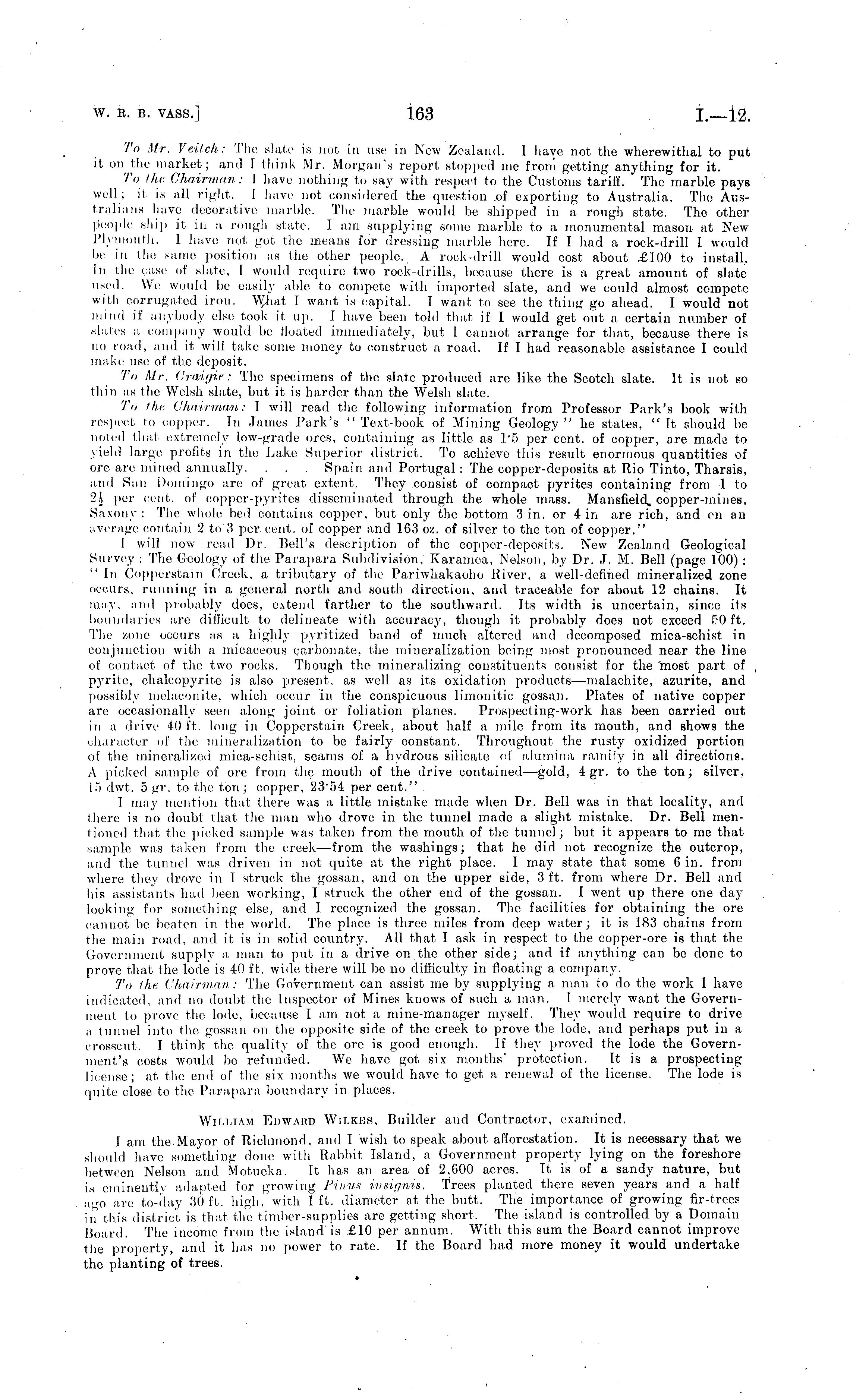 To Mr. Veitch: The slate is not in use in New Zealand. I have not the wherewithal to put it on the market; and I think Mr. Morgan's report stopped me from getting anything for it. To the Chairman: I have nothing to say with respect lo the Customs tariff. The marble pays well; it is all right. I have not considered the question .of exporting to Australia. The Australians have decorative marble. The marble would be shipped in a rough state. The other people ship it in a rough state. 1 am supplying some marble to a monumental mason at New Plymouth. 1 have not got Ihe means for dressing marble here. If I had a rock-drill I would be in Ihe same position as the other people. A rock-drill would cost about £100 to install. In the ease of slate, I would require two rock-drills, because there is a great amount of slate used. We would be easily able to compete with imported slate, and we could almost compete with corrugated iron. Wjiat I want is capital. I want to see the thing go ahead. I would not mind if anybody else took it up. I have been told that if I would get out a certain number of slates a company would be Moated immediately, but J cannot arrange for that, because there is no road, and it will take some money to construct a road. If I had reasonable assistance I could make use of the deposit. To Mr. Graigie: The specimens of the slate produced are like the Scotch slate. It is not so thin as the Welsh slate, but it is harder than the Welsh slate. To the Chairman: I will read the following information from Professor Park's book with respect to copper. In James Park's "Text-book of Mining Geology" ho states, "It should be noted thai extremely low-grade ores, containing as little as I*s per cent, of copper, are mad,' to yield large profits in the Lake Superior district, To achieve Ibis result enormous quantities of ore are mined annually. . . . Spain and Portugal : The copper-deposits at Rio Tinto, Tharsis, and San Domingo are of great extent, They consist of compact pyrites containing from 1 to 2A per cent, of copper-pyrites disseminated through the whole mass. Mansfield, copper-mines. Saxony: The whole bed contains copper, but only the bottom 3 in. or 4in are rich, and en an average contain 2 to 3 per. cent, of copper and 163 oz. of silver to the ton of copper." I will now read Dr. Bell's description of the copper-deposits, New Zealand Geological Survey : The Geology of the Parapara Subdivision, Karamea, Nelson, by Dr. J. M. Bell (page 100) : " In Copperstain Creek, a tributary of the Pariwhakaoho River, a well-defined mineralized zone occurs, running in a general north and south direction, and traceable for about 12 chains. It may. and probably does, extend farther to the southward. Its width is uncertain, since its boundaries are difficult to delineate with accuracy, though it probably does not exceed 50 ft. The zone occurs as a highly pyritized band of much altered and decomposed mica-schist in conjunction with a micaceous carbonate, the mineralization being most pronounced near the line of contact of the two rocks. Though the mineralizing constituents consist for the 'most part of pyrite, chalcopyrite is also present, as well as its oxidation products—malachite, azurite, and possibly melaconite, which occur in the conspicuous limonitic gossan. Plates of native copper are occasionally seen along joint or foliation planes. Prospecting-work has been carried out in a drive 40 ft. long in Copperstain Creek, about half a mile from its mouth, and shows the character of the mineralization to be fairly constant. Throughout the rusty oxidized portion of the mineralized mica-schist, seams of a hydrous silicate of alumina ramify in all directions. A picked sample of ore from the mouth of the drive contained —gold, 4gr. to the ton; silver. 15 dwt. 5 gr. to the ton; copper, 2354 per cent." . I may mention that (here was a little mistake made when Dr. Bell was in that locality, and there is no doubt that the man who drove in the tunnel made a slight mistake. Dr. Bell meniioned that the picked sample was taken from the mouth of the tunnel; but, it appears to me that sample was taken from the creek —from the washings; that he did not recognize the outcrop, and the tunnel was driven in not quite at the right place. I may state that some 6 in. from where they drove in I struck the gossan, and on the upper side, 3 ft. from where Dr. Bell and his assistants had been working, I struck the other end of the gossan. I went up there one day looking for something else, and I recognized the gossan. The facilities for obtaining the ore cannot be beaten in the world. The place is three miles from deep water; it is 183 chains from the main road, and it is in solid country. All that I ask in respect to the copper-ore is that the Government supply a man to put in a drive on the other side; and if anything can be done to prove that the lode is 40 ft. wide there will be no difficulty in floating a company. To the Chairman : The Government can assist me by supplying a man to do the work I have indicated, and no doubt the Inspector of Mines knows of such a man. I merely want the Government to prove the lode, because I am not. a mine-manager myself. They would require to drive a tunnel into the gossan on the opposite side of the creek to prove the.lode, and perhaps put in a crosscut. I think the quality of the ore is good enough. If they proved the lode the Government's costs would be refunded. We have got six months' protection. It is a prospecting license; at the end of the six months we would have to get a renewal of the license. The lode is quite close to the Parapara boundary in places. William Edward WILKBS, Builder and Contractor, examined. lam the.Mayor of Richmond, and I wish to speak about afforestation. It is necessary that we should have something done with Rabbit Island, a Government property lying on the foreshore between Nelson and Motueka. It lias an area of 2,600 acres. It is of a sandy nature, but 