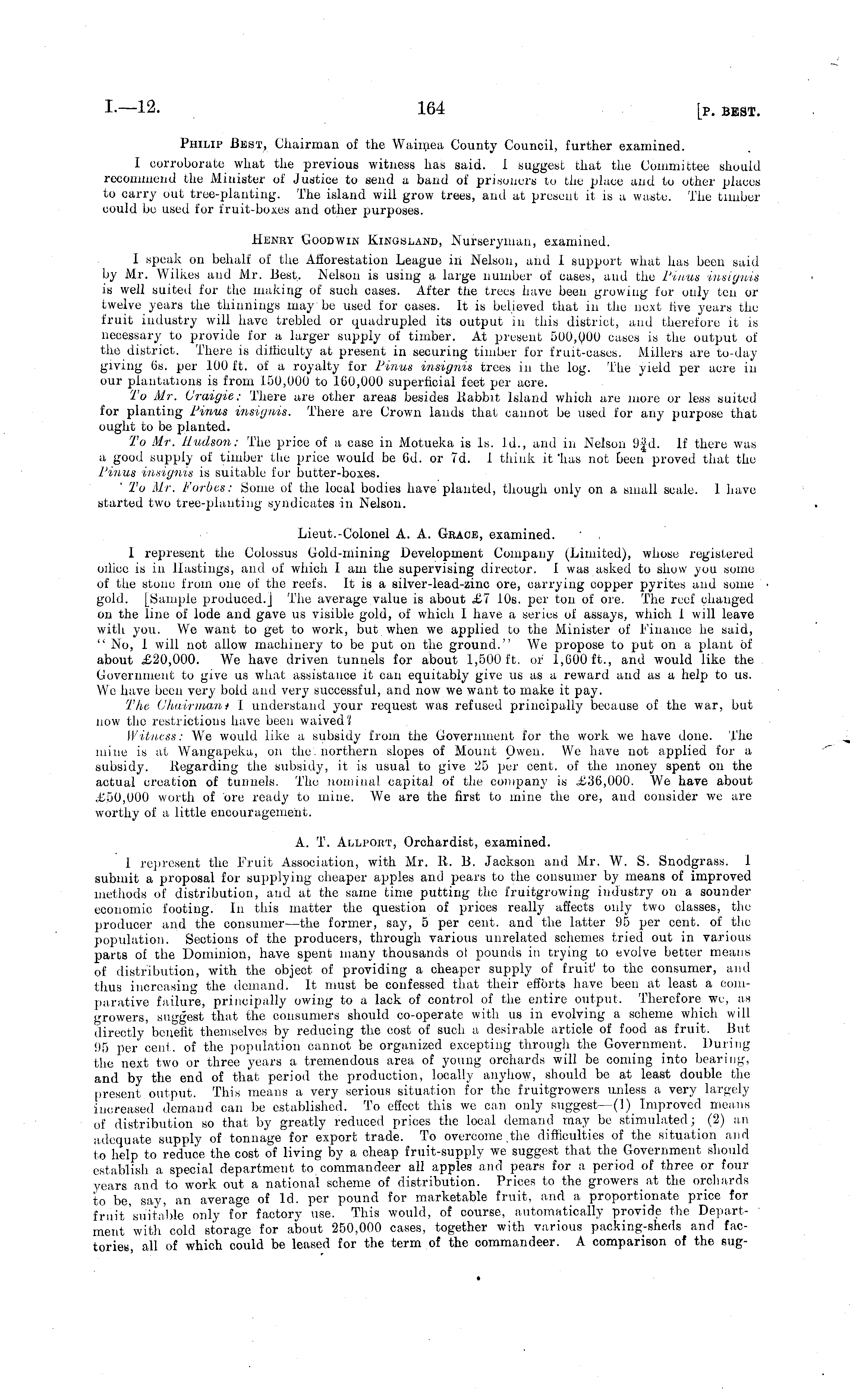 Philip Best, Chairman of the Waiinea County Council, further examined. I corroborate what the previous witness has said. I suggest that the Committee should recommend the Minister of Justice to send a band of prisoners to the place and to other places to carry out tree-planting. The island will grow trees, and at present it is a waste. The timber could be used for fruit-boxes and other purposes. Henry Goodwin Kingsland, Nurseryman, examined. I speak on behalf of the Afforestation League in Nelson, and I support what has been said by Mr. Wilkes and Mr. Best. Nelson is using a large number of cases, and the PinUs insignis is well suited for the making of such cases. After the trees have been growing for only ten or twelve years the thinnings may be used for cases. It is believed that in the next five years the fruit industry will have trebled or quadrupled its output in this district, ami therefore it is necessary to provide for a larger supply of timber. At present 500,000 cases is the output of the district. There is difficulty at present in securing timber for fruit-cases. Millers are to-day giving 6s. per 100 ft. of a royalty for Pinus insignis trees in the log. The yield per acre in our plantations is from 150,000 to 160,000 superficial feet per acre. To Mr. Graigie: There are other areas besides Rabbit Island which are more or less suited for planting Pinus insignis. There are Crown lands that cannot be used for any purpose that ought to be planted. To Air. Hudson: The price of a case in Motueka is Is. Id., and in Nelson 9|d. If there was a good supply of timber the price would be fid. or 7d. 1 think it has not been proved that the Pinus insignis is suitable for butter-boxes. To Mr. Forbes: Some of the local bodies have planted, though only on a small scale. 1 have started two tree-planting syndicates in Nelson. Lieut.-Colonel A. A. Grace, examined. ' , I represent the Colossus Gold-mining Development Company (Limited), whose registered office is in Hastings, and of which 1 am the supervising director. 1 was asked to show you some of the stone from one of the reefs. It is a silver-lead-zinc ore, carrying copper pyrites and some gold. [Sample produced.] The average value is about £7 10s. per ton of ore. The reef changed on the line of lode and gave us visible gold, of which I have a series of assays, which 1 will leave with you. We want to get to work, but when we applied to the Minister of Finance he said, " No, I will not allow machinery to be put on the ground." We propose to put on a plant of about £20,000. We have driven tunnels for about 1,500 ft. or 1,600 ft., and would like the Government to give us what assistance it can equitably give us as a reward and as a help to us. We have been very bold and very successful, and now we want to make it pay. The Chairman* I understand your request was refused principally because of the war, but now the restrictions have been waived 1 Witness: We would like a subsidy from the Government for the work we have done. The mine is at Wangapeka, on the. northern slopes of Mount Owen. We have not applied for a subsidy. Regarding the subsidy, it is usual to give 25 per cent, of the money spent on the actual creation of tunnels. The nominal capital of the company is £36,000. We have about £50,000 worth of ore ready to mine. We are the first to mine the ore, and consider we are worthy of a little encouragement. A. T. Allport, Orchardist, examined. 1 represent the Fruit Association, with Mr. R. B. Jackson and Mr. W. S. Snodgrass. 1 submit a proposal for supplying cheaper apples and pears to the consumer by means of improved methods of distribution, and at the same time putting the fruitgrowing industry on a sounder economic footing. In this matter the question of prices really affects only two classes, the producer and the consumer —the former, say, 5 per cent, and the latter 95 per cent, of the population. Sections of the producers, through various unrelated schemes tried out in various parts of the Dominion, have spent many thousands ol pounds in trying to evolve better means of distribution, with the object of providing a cheaper supply of fruit' to the consumer, and thus increasing the demand.' It must be confessed that their efforts have been at least a comparative failure, principally owing to a lack of control of the entire output. Therefore we, as growers, suggest that the consumers should co-operate with us in evolving a scheme which will directly benefit themselves by reducing the cost of such a, desirable article of food as fruit. But 95 per cent, of the population cannot be organized excepting through the Government. During the next two or three years a tremendous area of young orchards will be coming into bearing, and by the end of that period the production, locally anyhow, should be at least double the present output. This means a very serious situation for the fruitgrowers unless a very largely increased demand can be established. To effect this we can only suggest—(l) Improved means of distribution so that by greatly reduced prices the local demand may be stimulated; (2) an adequate supply of tonnage for export trade. To overcome.the difficulties of the situation and to help to reduce the cost of living by a cheap fruit-supply we suggest that the Government should establish a special department to commandeer all apples and pears for a period of three or four years and to work out a national scheme of distribution. Prices to the growers at the orchards to be, say, an average of Id. per pound for marketable fruit, and a proportionate price for fruit'suitable only for factory use. This would, of course, automatically provide the Department with cold storage for about 250,000 cases, together with various packing-sheds and factories, all of which could be leased for the term of the commandeer. A comparison of the sug-