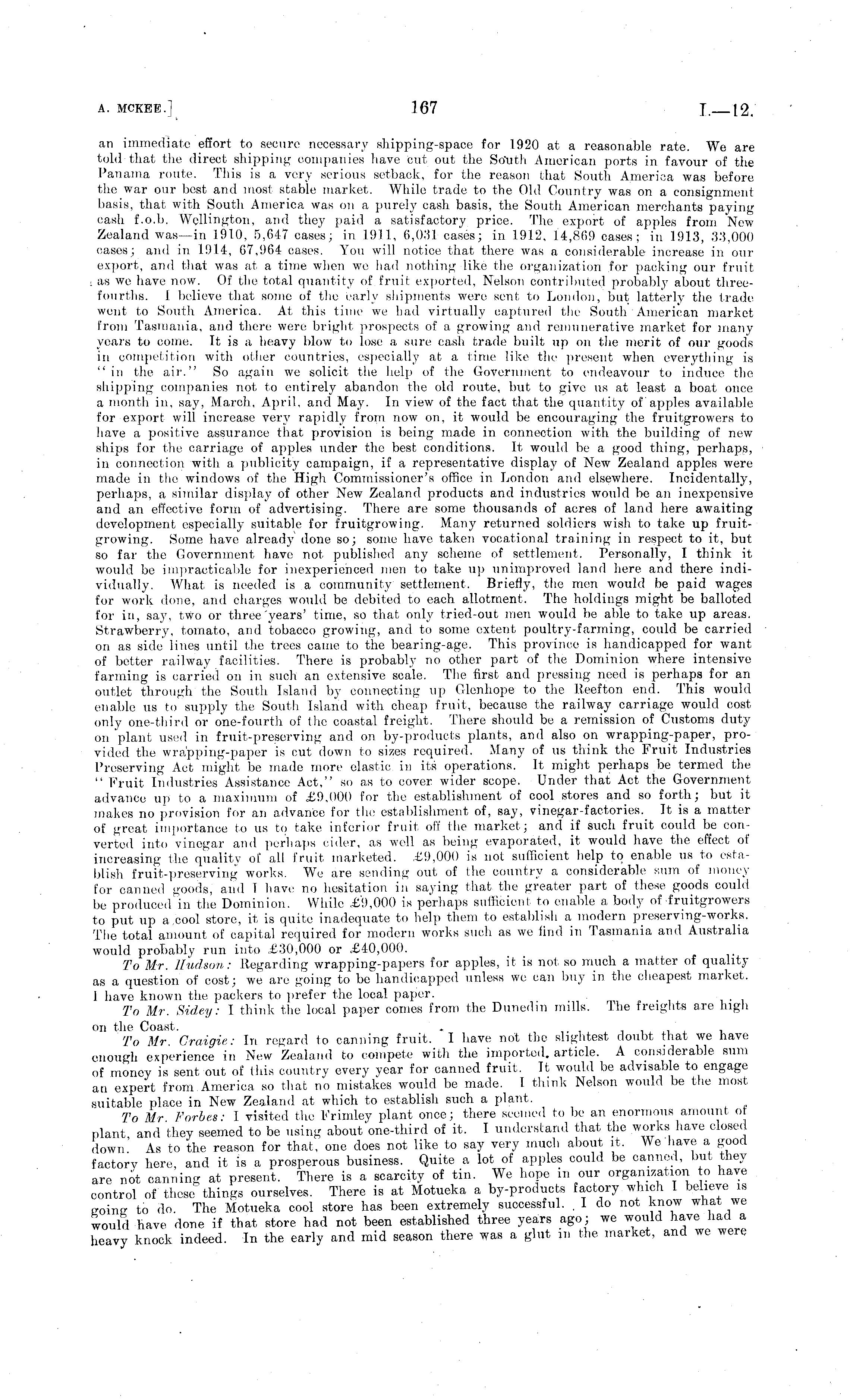 an immediate effort to secure necessary shipping-space for 1920 at a reasonable rate. We are told that the direct shipping companies have cut out the So'utli American ports in favour of the Panama route. This is a very serious setback, for the reason that South America was before the war our best and most stable market, While trade to the Old Country was on a consignment basis, that with South America was on a purely cash basis, the South American merchants paying cash f.o.b. Wellington, and they paid a satisfactory price. The export of apples from New Zealand was —in 1910, 5,647 cases; in 1911, 6,031 cases; in 1912, 14,869 cases; in 1913, 33,000 cases; and in 1914, 67,964 cases. You will notice that there was a considerable increase in our export, and that was at a time when we had nothing like the organization for packing our fruit ias we have now. Of the total quantity of fruit exported, Nelson contributed probably about threefourths. I believe that some of the early shipments were sent to London, but latterly the trade went to South America. At this time we had virtually captured the South American market from Tasmania, and there were bright prospects of a growing and remunerative market for many years to come. It is a heavy blow to lose a sure cash trade built up on the merit of our goods in competition with other countries, especially at a time like the present when everything is "in the air." So again we solicit the help of the Government to endeavour to induce the shipping companies not to entirely abandon the old route, but to give us at least a boat once a month in, say, March, April, and May. In view of the fact that the quantity of" apples available for export will increase very rapidly from now on, it would be encouraging the fruitgrowers to have a positive assurance that provision is being made in connection with the building of new ships for the carriage of apples under the best conditions. It would be a good thing, perhaps, in connection with a publicity campaign, if a representative display of New Zealand apples were made in the windows of the High Commissioner's office in London and elsewhere. Incidentally, perhaps, a similar display of other New Zealand products and industries would be an inexpensive and an effective form of advertising. There are some thousands of acres of land here awaiting development especially suitable for fruitgrowing. Many returned Soldiers wish to take up fruitgrowing. Some have already done so; some have taken vocational training in respect to it, but so far the Government have not, published any scheme of settlement. Personally, I think it would be impracticable for inexperienced men to take up unimproved land here and there individually. What is needed is a community settlement. Briefly, the men would be paid wages for work done, and charges would be debited to each allotment, The holdings might be balloted for in, say, two or three'years' time, so that only tried-out men would be able to take up areas. Strawberry, tomato, and tobacco growing, and to some extent poultry-farming, could be carried on as side lines until the trees came to the bearing-age. This province is handicapped for want of better railway facilities. There is probably no other part of the Dominion where intensive farming is carried on in such an extensive scale. The first and pressing need is perhaps for an outlet through the South Island by connecting up Glenhope to the Reefton end. This would enable us to supply the South Island with, cheap fruit, because the railway carriage would cost only one-third or one-fourth of (he coastal freight. There should be a remission of Customs duty on plant used in fruit-preserving and on by-products plants, and also on wrapping-paper, provided the wrapping-paper is cut down to sizes required. Many of us think the Fruit Industries Preserving Act might bo made more clastic in its operations. It might perhaps be termed the " Fruit Industries Assistance Act," so as to cover wider scope. Under that Act the Government advance up to a maximum of £9,000 for the establishment of cool stores and so forth; but it makes no provision for an advance for the establishment of, say, vinegar-factories. It is a matter of great importance to us to take inferior fruit off the market; and if such fruit could be converted into vinegar and perhaps eider, as well as being evaporated, it would have the effect of increasing the quality of all fruit marketed. £9,000 is not sufficient help to enable us to establish fruit-preserving works. We are sending out of the country a considerable sum of money for canned goods, and I have no hesitation in saying that the greater part of these goods could be produced in the Dominion. While £9,000 is perhaps sufficient to enable a body of fruitgrowers to put up a,cool store, it is quite inadequate to help them to establish a modern preserving-works. The total amount of capital required for modern works such as we find in Tasmania and Australia would probably run into £30,000 or £40,000. To Mr. Hudson: Regarding wrapping-papers for apples, it is not so much a matter of quality as a question of cost; we are going to be handicapped unless we can buy in the cheapest market, I have known the packers to prefer the local paper. To Mr. Sidey: I think the local paper comes from the Dunedin mills. The freights are high on the Coast, - , To Mr Graigie: In regard to canning fruit. I have not the slightest doubt that we have enough experience in New Zealand to compete with the imported, article. A considerable sum of money is sent out of this country every year for canned fruit. It would be advisable to engage an expert from America so that no mistakes would be made. 1 think Nelson would be the most suitable place in New Zealand at which to establish such a plant, To Mr Forbes: I visited the Frimley plant once; there seemed to be an enormous amount of plant and they seemed to be using about one-third of it. I understand that the work