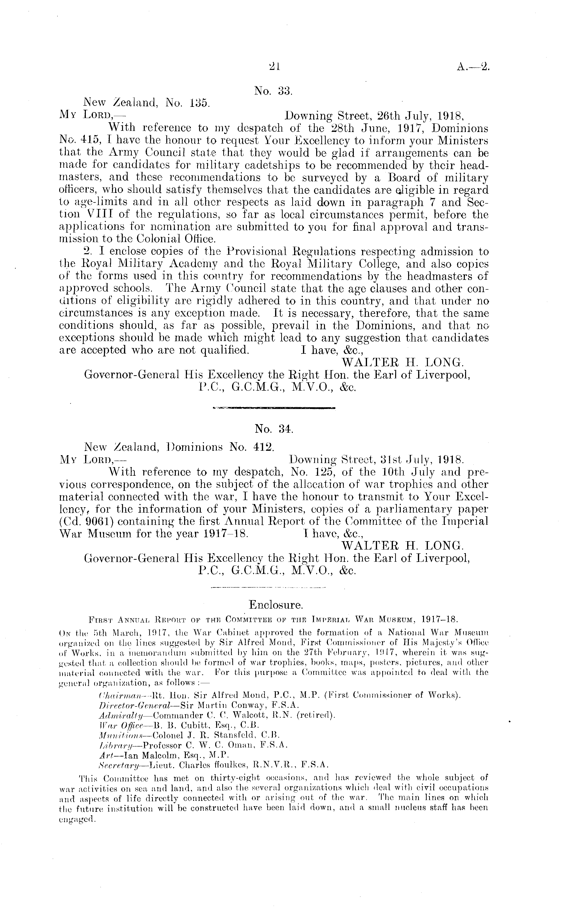 No. 34. New Zealand, Dominions No. 412. My Lord,— Downing Street, 31st July, 1918. With reference to my despatch, No. 125, of the 10th July and previous correspondence, on the subject of the allocation of war trophies and other material connected with the war, I have the honour to transmit to Your Excellency, for the information of your Ministers, copies of a parliamentary paper (Cd. 9061) containing the first Annual Report of the Committee of the Imperial War Museum for the year 1917-18. I have, &e, WALTER H. LONG. Governor-General His Excellencv the Right Hon. the Earl of Liverpool, P.0., G.C.M.G., M.V.0., &c.