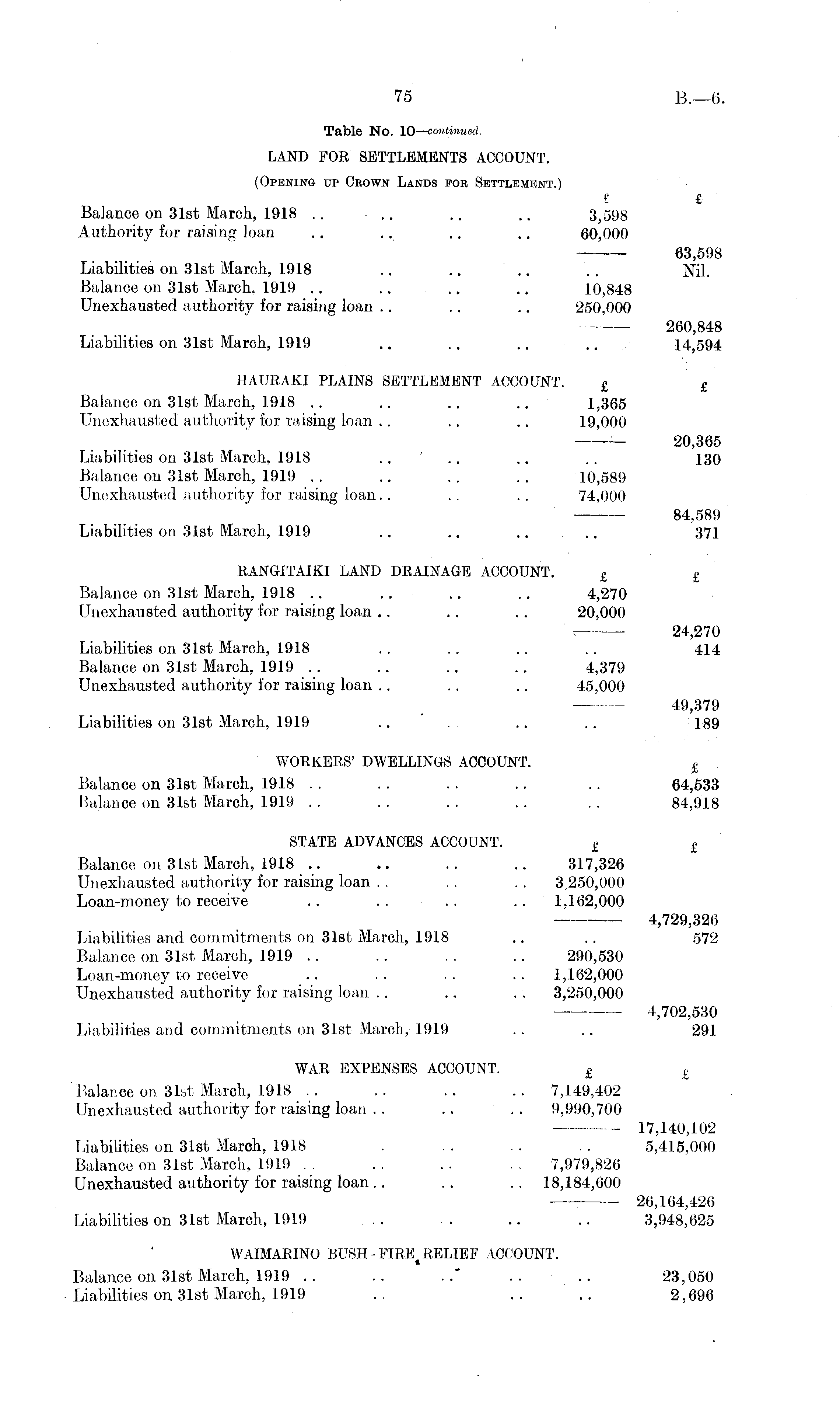 Table No. 10 — continued. LAND FOR SETTLEMENTS ACCOUNT. (Opening up Crown Lands for Settlement.) S £ Balance on 31st March, 1918 .. .. .. .. 3,598 Authority for raising loan .. .. .. .. 60,000 63,598 Liabilities on 31st March, 1918 .. .. .. .. Nil. Balance on 31st March, 1919 .. .. .. .. ■ 10,848 Unexhausted authority for raising loan .. .. .. 250,000 260,848 Liabilities on 31st March, 1919 .. .. .. .. 14,594 HAURAKI PLAINS SETTLEMENT ACCOUNT. £ £ Balance on 31st March, 1918 .. .. .. .. 1,365 Unexhausted authority for raising loan .. .. .. 19,000 — 20,365 Liabilities on 31st March, 1918 .. .. .. . . 130 Balance on 31st March, 1919 . . .. .. .. 10,589 Unexhausted authority for raising loan. . .. .. 74,000 —— 84.589 Liabilities on 31st March, 1919 .. .. .. .. 371 RANGITAIKI LAND DRAINAGE ACCOUNT. £ £ Balance on 31st March, 1918 .. .. .. .. 4,270 Unexhausted authority for raising loan .. . . . . 20,000 24,270 Liabilities on 31st March, 1918 .. .. .. .. 414 Balance on 31st March, 1919 .. .. .. .. 4,379 Unexhausted authority for raising loan .. . . .. 45,000 49,379 Liabilities on 31st March, 1919 .. .. .. .. 189 WORKERS' DWELLINGS ACCOUNT. £ Balance on 31st March, 1918 . . .. . . .. . . 64,533 Balance on 31st March, 1919 . . . . . . .. . . 84,918 STATE ADVANCES ACCOUNT. £ £ Balance on 31st March, 1918 .. .. .. .. 317,326 Unexhausted authority for raising loan . . . . . . 3250,000 Loan-money to receive .. .. .. .. 1,162,000 4,729,326 Liabilities and commitments on 31st March, 1918 .. .. 572 Balance on 31st March, 1919 . . .. .. .. 290,530 Loan-money to receive .. . . .. .. 1,162,000 Unexhausted authority for raising loan .. .. . . 3,250,000 4,702,530 Liabilities and commitments on 31st March, 1919 .. .. 291 WAR EXPENSES ACCOUNT. £ £ Balance on 31st March, 1918 . . . . . . .. 7,149,402 Unexhausted authority for raising loan .. .. .. 9,990,700 17,140,102 Liabilities on 31st March, 1918 . . , . . . . . 5,415,000 Balance on 31st March, 1919 . . . . .. . . 7,979,826 Unexhausted authority for raising loan .. . . . . 18,184,600 26,164,426 Liabilities on 31st March, 1919 ... .. .. .. 3,948,625 WAIMARINO BUSH-FIRE RELIEF ACCOUNT. * Balance on 31st March, 1919 .. .. . ." .. .. 23,050 Liabilities on 31st March, 1919 .. .. .. 2,696