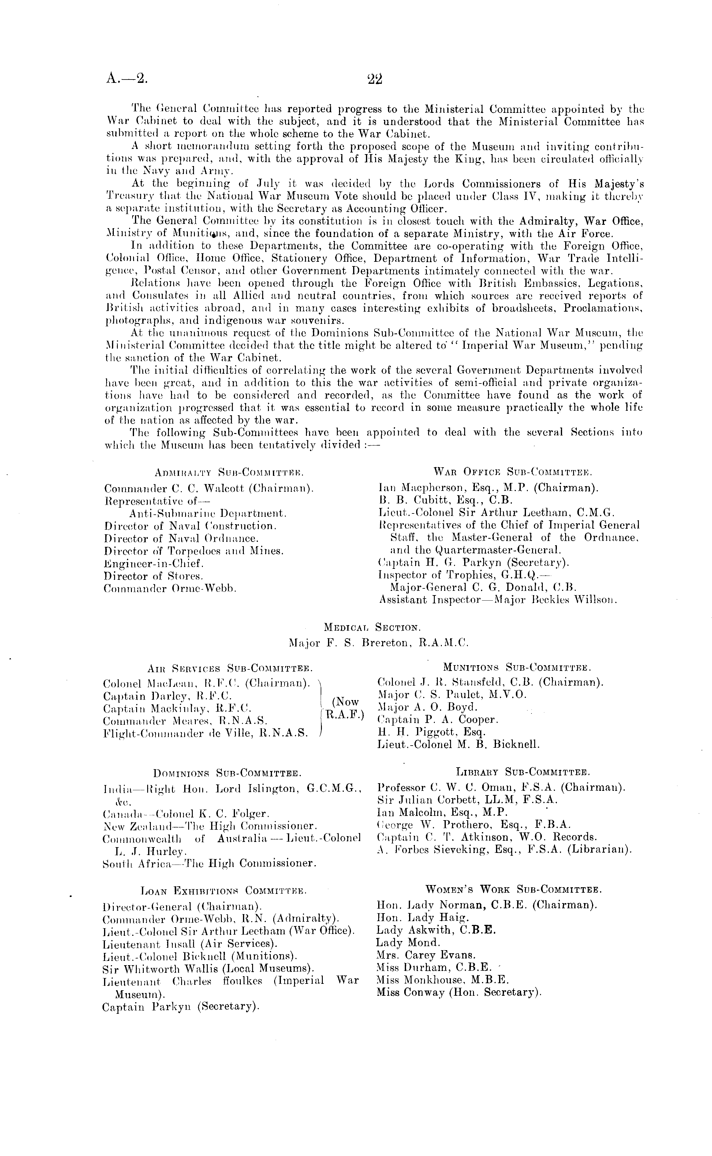 The General Committee has reported progress to the Ministerial Committee appointed by the War Cabinet to deal with the subject, and it is understood that the Ministerial Committee has submitted a report on the whole scheme to the War Cabinet. A short memorandum setting forth the proposed scope of the Museum and inviting contributions was prepared, and, with the approval of His Majesty the King, has been circulated officially in the Navy and Army. At the beginning of July it was decided by the Lords Commissioners of His Majesty's Treasury that the National War Museum Vote should be placed under Class IV, making it thereby a separate institution, with the Secretary as Accounting Officer. The General Committee by its constitution is in closest touch with the Admiralty, War Office, Ministry of Munitions, and, since the foundation of a separate Ministry, with the Air Force. In addition to these Departments, the Committee are co-operating with the Foreign Office, Colonial Office, Home Office, Stationery Office, Department of Information, War Trade Intelligence, Postal Censor, and other Government Departments intimately connected with the war. Relations have been opened through the Foreign Office with British Embassies, Legations, and Consulates in all Allied and neutral countries, from which sources are received reports of British activities abroad, and in many cases interesting exhibits of broadsheets, Proclamations, photographs, and indigenous war souvenirs. At the unanimous request of the Dominions Sub-Committee of the National War Museum, the Ministerial Committee decided that the title might be altered to " Imperial W T ar Museum," pending flic sanction of the War Cabinet. The initial difficulties of correlating the work of the several Government Departments involved have been great, and in addition to this the war activities of semi-official and private organizations have had to be considered and recorded, as the Committee have found as the work of organization progressed that it was essential to record in some measure practically the whole life of the nation as affected by the war. The following Sub-Committees have been appointed to deal with the several Sections into which the Museum has been tentatively divided : — Admiralty Sub-Committee. War Office Sub-Committee. Commander C. C. Walcott (Chairman). lan Macpherson, Esq., M.P. (Chairman). Representative of— 13. B. Cubitt, Esq., C.B. Anti-Submarine Department. Lieut.-Colonel Sir Arthur Leetham, C.M.G. Director of Naval Construction. Representatives of the Chief of Imperial General Director of Naval Ordnance. Staff, the Master-General of the Ordnance, Director of Torpedoes and Mines. and the Quartermaster-General. Engineer-in-Chief. Captain H. G. Parkyn (Secretary). Director of Stores. Inspector of Trophies, G.H.Q. — Commander Orme-Webb. Major-General C. G. Donald, C.B. Assistant Inspector —Major Beckles W 7 illson. Medical Section. Major F. S. Brereton, R.A.M.C. Air Services Sub-Committee. Munitions Sub-Committee. Colonel MacLean, R.F.C. (Chairman). \ Colonel J. R. Stansfeld, C.B. (Chairman). Captain Darley, R.F.C. , N Major C. S. Paulet, M.V.O. Captain Mackinlay, R.F.C. ' °* Major A. 0. Boyd. Commander Meares, R.N.A.S. k.a.jj.' Captain P. A. Cooper. Flight-Commander de Ville, R.N.A.S. 1 H. H. Piggott, Esq. Lieut.-Colonel M. B. Bicknell. Dominions Sub-Committee. Library Sub-Committee. India—Right Hon. Lord Islington, G.C.M.G., Professor C. W. C. Oman, F.S.A. (Chairman). & 0i Sir Julian Corbett, LL.M, F.S.A. Canada—Colonel K. C. Folger. lan Malcolm, Esq., M.P. New Zealand —The High Commissioner. George W. Prothero, Esq., F.B.A. Commonwealth of Australia — Lieut.-Colonel Captain C. T. Atkinson, W.O. Records. L. J. Hurley. A- Forbes Sieveking, Esq., F.S.A. (Librarian). South Africa—The High Commissioner. Loan Exhibitions Committee. Women's Work Sub-Committee. Director-General (Chairman). Hon. Lady Norman, C.B.E. (Chairman). Commander Orme-Webb, R.N. (Admiralty). Hon. Lady Haig. Lieut.-Colonel Sir Arthur Leetham (War Office). Lady Askwith, C.B.E. Lieutenant Insall (Air Services). Lady Mond. Lieut.-Colonel Bicknell (Munitions). Mrs. Carey Evans. Sir Whitworth Wallis (Local Museums). Miss Durham, C.B.E. • Lieutenant Charles ffoulkes (Imperial War Miss Monkhouse, M.B.E. Museum). Miss Conway (Hon. Secretary). Captain Parkyn (Secretary).