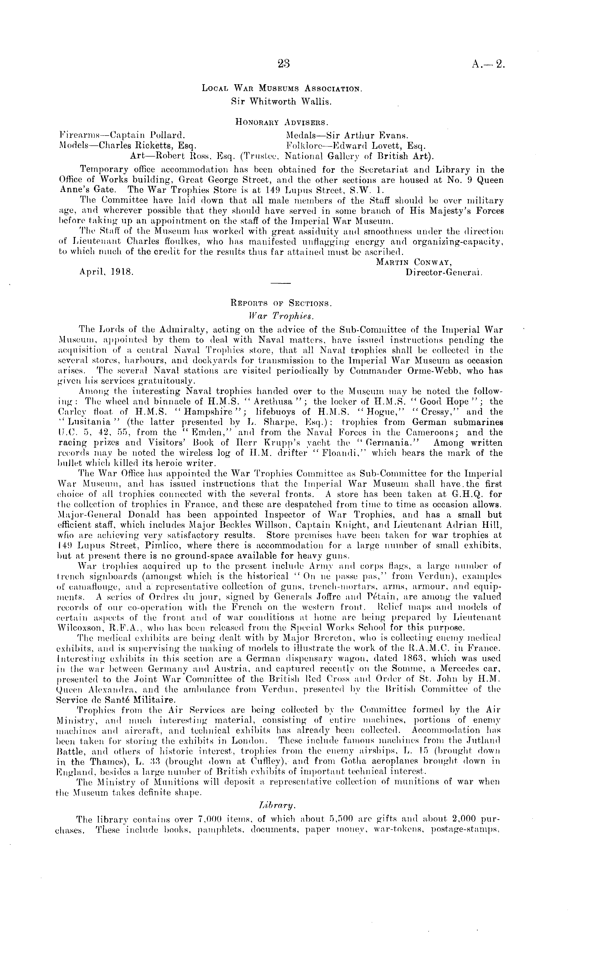 Local War Museums Association. Sir Whitworth Wallis. Honorary Advisers. Firearms —Captain Pollard. Medals —Sir Arthur Evans. Models —Charles Ricketts, Esq. Folklore —Edward Lovett, Esq. Art—Robert Ross. Esq. (Trustee, National Gallery of British Art). Temporary office accommodation has been obtained for the Secretariat and Library in the Office of Works building, Great George Street, and the other sections are housed at No. 9 Queen Anne's Gate. The War Trophies Store is at 149 Lupus Street, S.W. 1. The Committee have laid down that all male members of the Staff should be over military age, and wherever possible that they should have served in some branch of His Majesty's Forces before taking up an appointment on the staff of the Imperial War Museum. The Staff of the Museum has worked with great assiduity and smoothness under the direction of Lieutenant Charles ffoulkes, who has manifested unflagging energy and organizing-capacity, to which much of the credit for the results thus far attained must be ascribed. Martin Conway, April, 1918. Director-General.