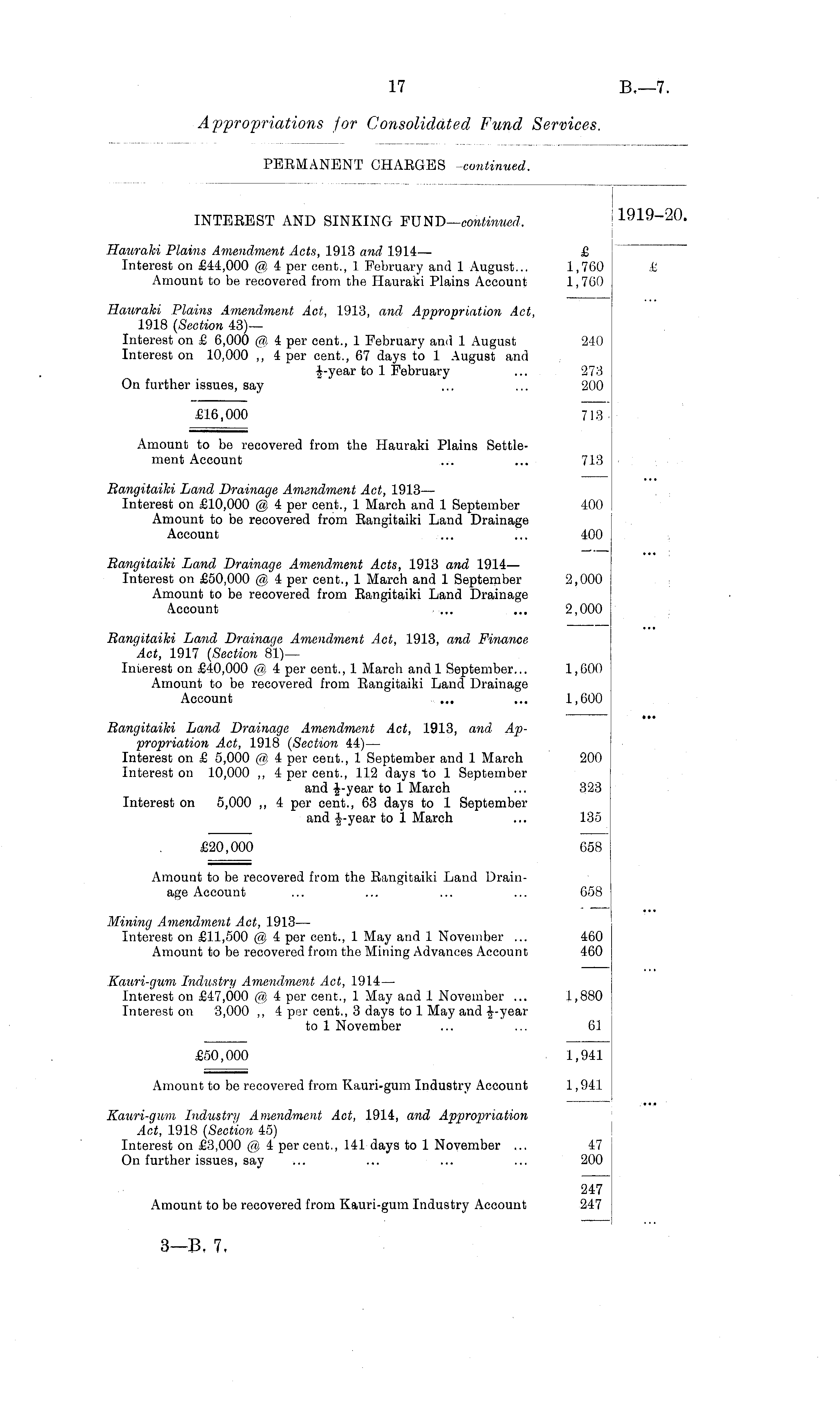 INTEREST AND SINKING FUND— continued. 1919-20. Hauraki Plains Amendment Acts, 1913 and 1914— Interest on £44,000 @ 4 per cent., 1 February and 1 August... Amount to be recovered from the Hauraki Plains Account £ 1,760 1,760 £ Hauraki Plains Amendment Act, 1913, and Appropriation Act, 1918 (Section 43)— Interest on £ 6,000 @, 4 per cent., 1 February and 1 August Interest on 10,000 „ 4 per cent., 67 days to 1 August and J-year to 1 February On further issues, say 240 273 200 £16,000 713 Amount to be recovered from the Hauraki Plains Settlement Account 713 Rangitaiki Land Drainage Amendment Act, 1913 — Interest on £10,000 @ 4 per cent., 1 March and 1 September Amount to be recovered from Rangitaiki Land Drainage Account 400 400 Rangitaiki Land Drainage Amendment Acts, 1913 and 1914 — Interest on £50,000 @ 4 per cent., 1 March and 1 September Amount to be recovered from Rangitaiki Land Drainage Account ... 2,000 2,000 Rangitaiki Land Drainage Amendment Act, 1913, and Finance Act, 1917 (Section 81)— Interest on £40,000 @ 4 per cent., 1 March and 1 September... Amount to be recovered from Rangitaiki Land Drainage Account 1,000 1,600 • •• Rangitaiki Land Drainage Amendment Act, 1913, and Appropriation Act, 1918 (Section 44) — Interest on £ 5,000 @, 4 per cent., 1 September and 1 March Interest on 10,000 ,, 4 per cent., 112 days to 1 September and J-year to 1 March Interest on 5,000 „ 4 per cent., 63 days to 1 September and J-year to 1 March 200 323 135 £20,000 Amount to be recovered from the Rangitaiki Land Drainage Account 658 658 Mining Amendment Act, 1913— Interest on £11,500 @ 4 per cent., 1 May and 1 November ... Amount to be recovered from the Mining Advances Account 460 460 Kauri-gum Industry Amendment Act, 1914 — Interest on £47,000 @ 4 per cent., 1 May and 1 November ... Interest on 3,000 ,, 4 per cent., 3 days to 1 May and J-year to 1 November 1,880 61 £50,000 1,941 Amount to be recovered from Kauri-gum Industry Account 1,941 Kauri-gum Industry Amendment Act, 1914, and Appropriation Act, 1918 (Section 45) Interest on £3,000 @ 4 percent., 141 days to 1 November ... On further issues, say 47 200 Amount to be recovered from Kauri-gum Industry Account 247 247