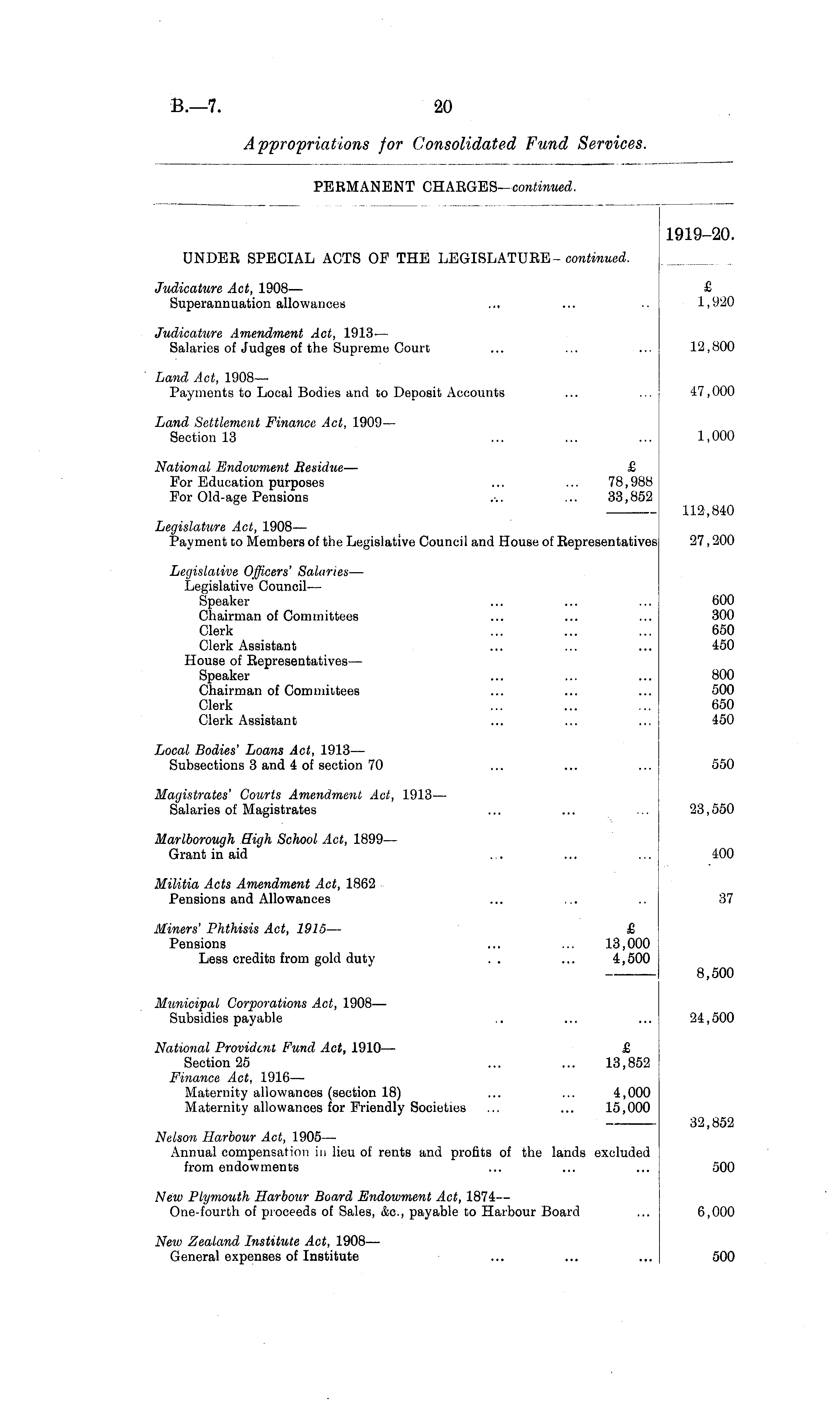 UNDER SPECIAL ACTS OF THE LEGISLATURE- continued. 1919-20. r udicature Act, 1908— Superannuation allowances £ 1,920 r udicature Amendment Act, 1913-— Salaries of Judges of the Supreme Court 12,800 'jand Act, 1908— Payments to Local Bodies and to Deposit Accounts 47,000 jand Settlement Finance Act, 1909— Section 13 1,000 National Endowment Residue — £ For Education purposes ... ... 78,988 For Old-age Pensions .... ... 33,852 112,840 'jegislature Act, 1908— Payment to Members of the Legislative Council and House of Representatives 27,200 Legislative Officers' Salaries — Legislative Council— Speaker Chairman of Committees Clerk Clerk Assistant House of Representatives— Speaker Chairman of Committees Clerk Clerk Assistant 600 300 650 450 800 500 650 450 x-ocal Bodies' Loans Act, 1913 — Subsections 3 and 4 of section 70 550 lagistrates' Courts Amendment Act, 1913 — Salaries of Magistrates 23,550 darlborough High School Act, 1899— Grant in aid 400 lilitia Acts Amendment Act, 1862 Pensions and Allowances 37 liners' Phthisis Act, 1915 — £ Pensions ... ... 13,000 Less credits from gold duty .. ... 4,500 8,500 Municipal Corporations Act, 1908— Subsidies payable 24,500 National Provident Fund Act, 1910 — £ Section 25 ... ... 13,852 Finance Act, 1916 — Maternity allowances (section 18) ... ... 4,000 Maternity allowances for Friendly Societies ... ... 15,000 32,852 kelson Harbour Act, 1905— Annual compensation in lieu of rents and profits of the lands excluded from endowments 500 lew Plymouth Harbour Board Endowment Act, 1874 — One-fourth of proceeds of Sales, &c, payable to Harbour Board 6,000 'lew Zealand Institute Act, 1908— General expenses of Institute 500