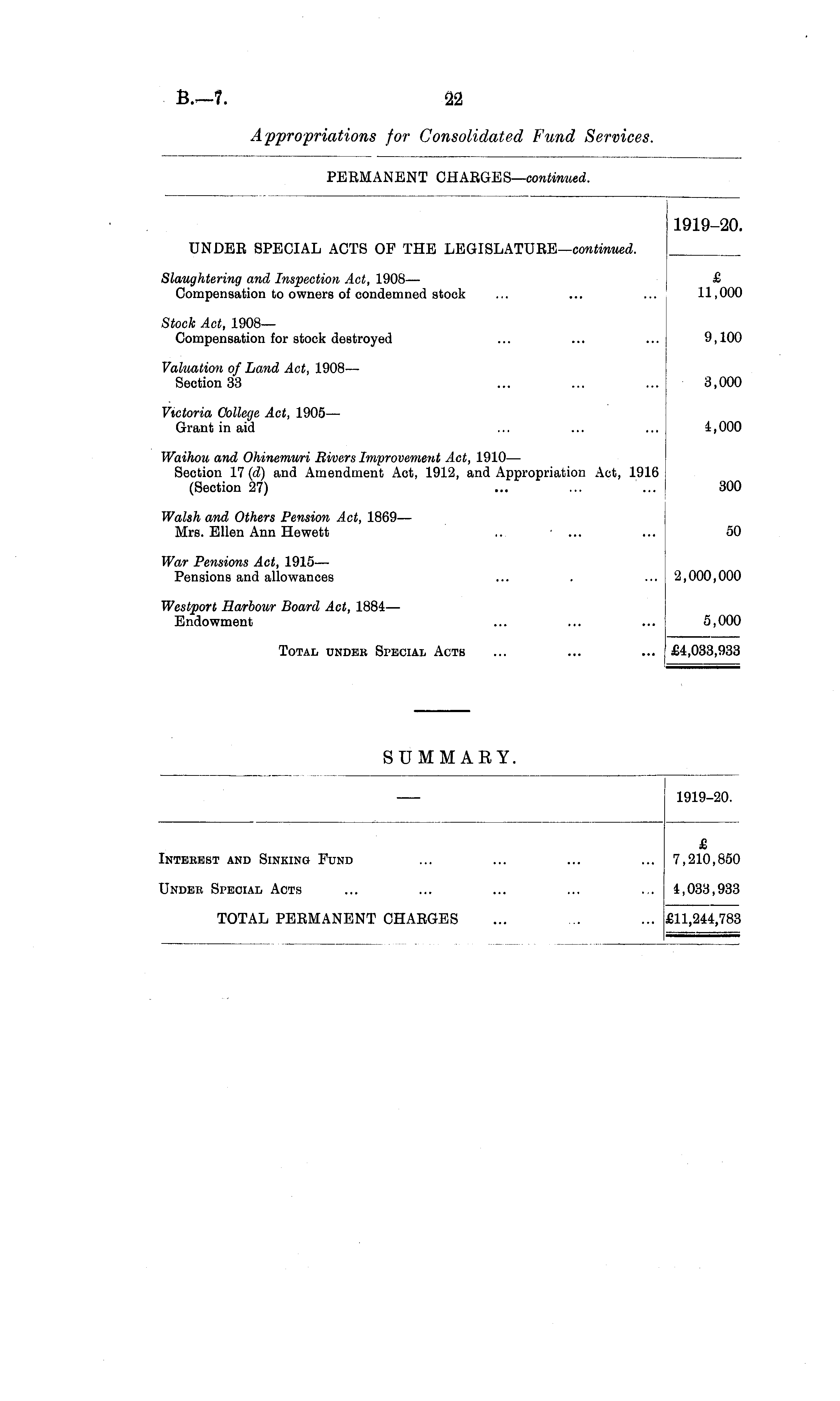 1919-20. UNDER SPECIAL ACTS OF THE LEGISLATURE— continued. Slaughtering and Inspection Act, 1908— Compensation to owners of condemned stock £ 11,000 Stock Act, 1908— Compensation for stock destroyed 9,100 Valuation of Land Act, 1908— Section 33 3,000 Victoria College Act, 1905— Grant in aid 4,000 Waihou and Ohinemuri Rivers Improvement Act, 1910— Section 17 (d) and Amendment Act, 1912, and Appropriation Act, 1916 (Section 27) 300 Walsh and Others Pension Act, 1869— Mrs. Ellen Ann Hewett 50 War Pensions Act, 1915— Pensions and allowances 2,000,000 Westport Harbour Board Act, 1884— Endowment 5,000 Total under Special Acts £4,033,933