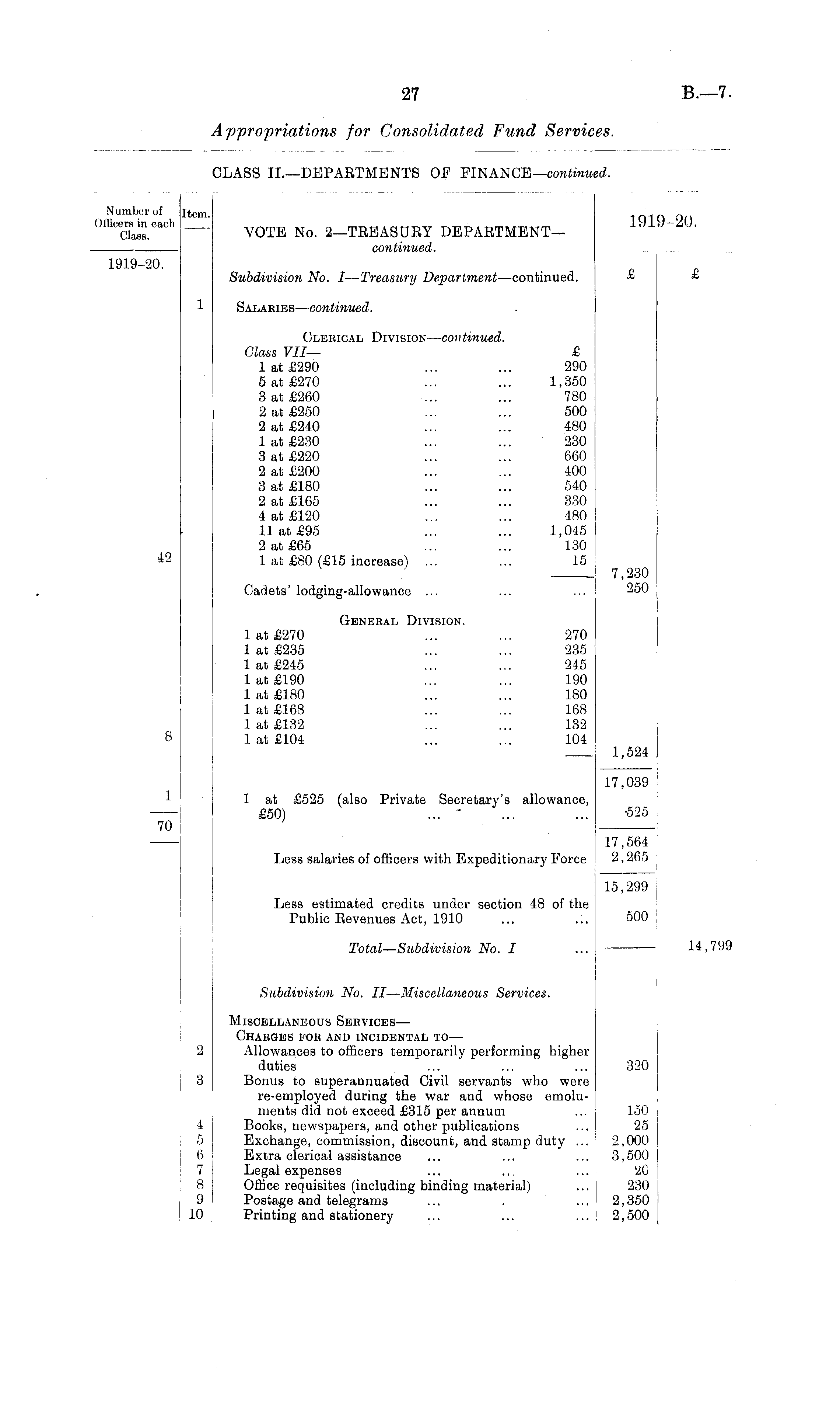 Number of Ifficers in each Class. Item. VOTE No. 2—TREASURY DEPARTMENT— continued. 1919-20. 1919-20. Subdivision No. I — Treasury Department —continued. £ £ Salaries— continued. Clerical Division— continued. Class VII— £ lat £290 ... ... 290 5 at £270 ... ... 1,350 3 at £260 .... ... 780 2 at £250 ... ... 500 2 at £240 ... ... 480 lat £230 ... ... 230 3 at £220 ... ... 660 2 at £200 ... ... 400 3 at £180 ... ... 540 2 at £165 ... ... 330 4 at £120 ... ... 480 11 at £95 ... ... 1,045 2 at £65 ... ... 130 1 at £80 (£15 increase) ... ... 15 12 7,230 250 Cadets' lodging-allowance ... General Division. lat £270 ... ... 270 1 at £235 ... ... 235 lat £245 ... ... 245 lat £190 ... ... 190 lat £180 ... ... 180 lat £168 ... ... 168 lat £132 ... ... 132 1 at £104 ... ... 104 8 1,524 1 1 at £525 (also Private Secretary's allowance, £50) 17,039 •525 70 ! Less salaries of officers with Expeditionary Force 17,564 2,265 Less estimated credits under section 48 of the Public Revenues Act, 1910 15,299 500 Total — Subdivision No. I i 14,799 Subdivision No. II—Miscellaneous Services. 2 3 Miscellaneous Services— Charges for and incidental to — Allowances to officers temporarily performing higher duties Bonus to superannuated Civil servants who were re-employed during the war and whose emoluments did not exceed £315 per annum Books, newspapers, and other publications Exchange, commission, discount, and stamp duty ... Extra clerical assistance Legal expenses Office requisites (including binding material) Postage and telegrams Printing and stationery 320 150 25 2,000 3,500 20 230 2,350 2,500 4 5 6 7 8 9 10