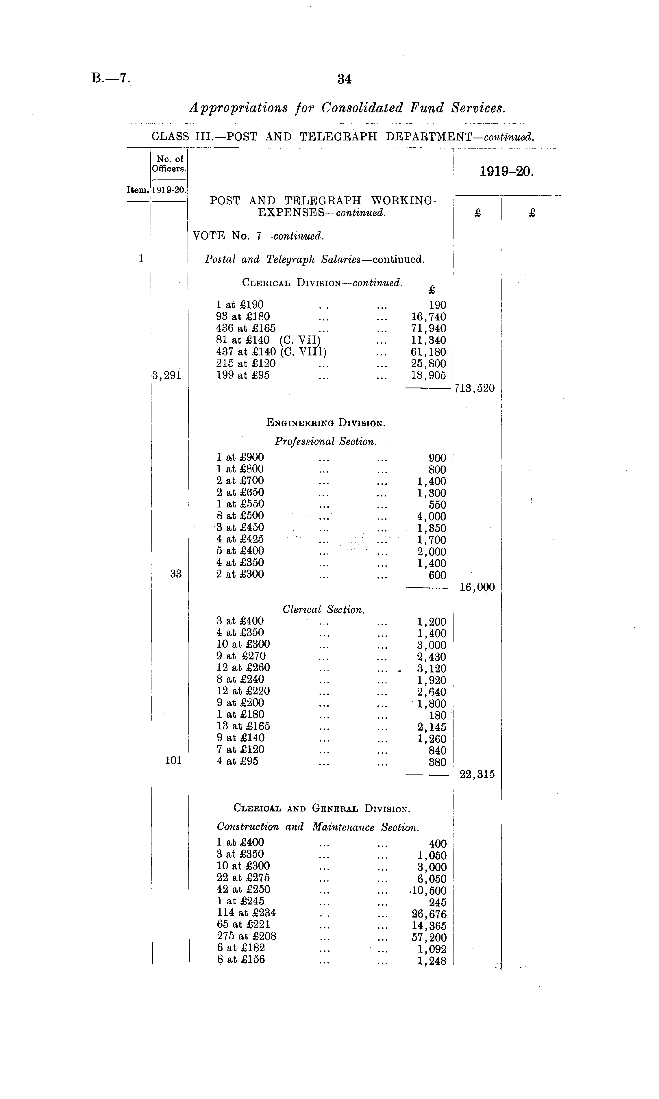 No. of Officers. 1919-20. tern. 1919-20. POST AND TELEGRAPH WORK1NGEXPE N SE S- continued. £ £ VOTE No. 7— continued. Postal and Telegraph Salaries —continued. Clerical Division- -continued. . 1 at £190 . . ... 190 93 at £180 ... ... 16,740 430 at £165 ... ... 71,940 81 at £140 (C. VII) ... 11,340 437 at £140 (C. VIII) ... 61,180 215 at £120 ... ... 25,800 199 at £95 ... ... 18,905 J3,291 713,520 Engineering Division. Professional Section. lat £900 ... ... 900 1 at £800 ... ... 800 2 at £700 ... ... 1,400 2 at £650 ... ... 1,300 1 at £550 ... ... 550 8 at £500 ... ... 4,000 3 at £450 ... ... 1,350 4 at £425 :.. ... 1,700 5 at £400 ... ... 2,000 4 at £350 ... ... 1,400 2 at £300 ... ... 600 : 33 16,000 Clerical Section. 3 at £400 ... ... 1,200 4 at £350 ... ... 1,400 10 at £300 ... ... 3,000 9 at £270 ... ... 2,430 12 at £260 ... ... . 3,120 8 at £240 ... ... 1,920 12 at £220 ... ... 2,640 9 at £200 ... ... 1,800 lat £180 ... ... 180 13 at £165 ... ... 2,145 9 at £140 ... ... 1,260 7 at £120 ... ... 840 4 at £95 ... ... 380 101 22,315 Clerical and General Division. Construction and Maintenance Section. lat £400 ... ... 400 3 at £350 ... ... 1 050 10 at £300 ... ... 3,000 22 at £275 ... ... 6,050 42 at £250 ... ... 10,500 1 at £245 ... ... 245 114 at £234 ... ... 26,676 65 at £221 ... ... 14,365 275 at £208 ... ... 57,200 6 at £182 ... ... 1,092 8 at £156 ... ... 1,248