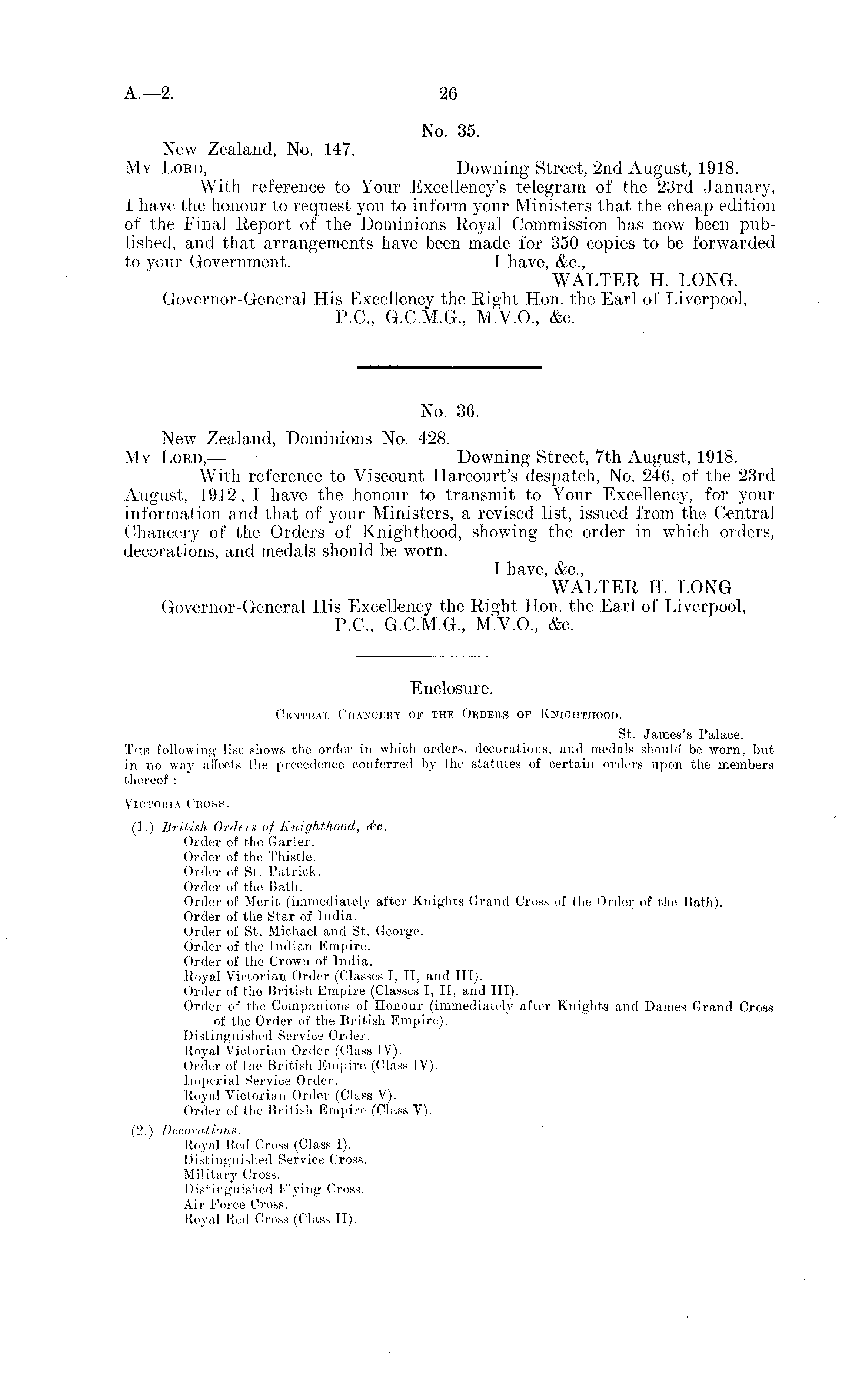 No. 36. New Zealand, Dominions No. 428. My Lord, — Downing Street, 7th August, 1918. With reference to Viscount Harcourt's despatch, No. 246, of the 23rd August, 1912, I have the honour to transmit to Your Excellency, for your information and that of your Ministers, a revised list, issued from the Central Chancery of the Orders of Knighthood, showing the order in which orders, decorations, and medals should be worn. I have, &e, WALTER H. LONG Governor-General His Excellency the Right Hon. the Earl of Liverpool, P.0., G.C.M.G., M.V.0., &c.