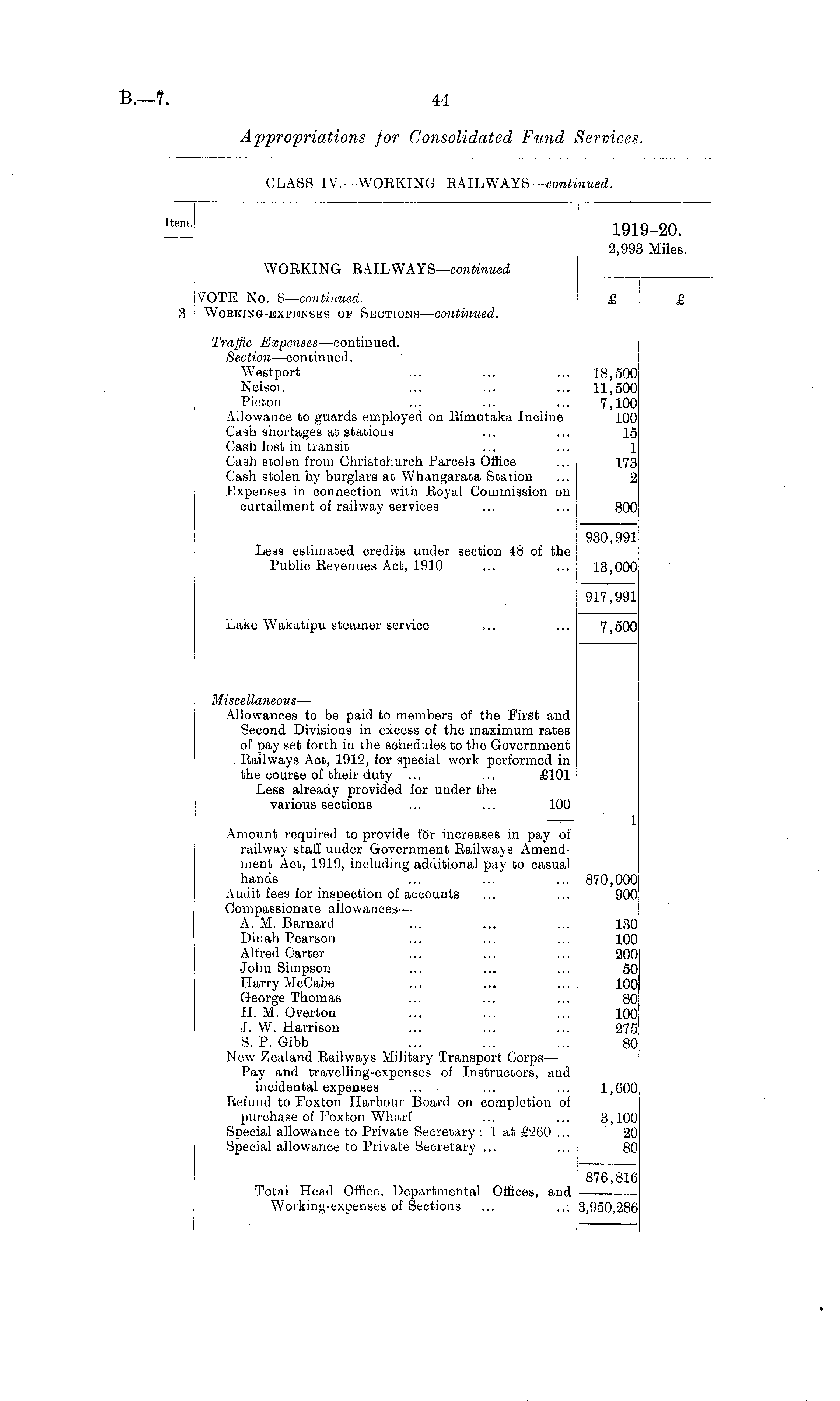 Item. 191 9-20. WORKING RAILWAYS— continued 2,99£ 3 Miles. VOTE No. 8—continued. Working-expensks of Sections — continued. £ Traffic Expenses —continued. Section —continued. Westport Nelson Picton Allowance to guards employed on Rimutaka Incline Cash shortages at stations Cash lost in transit Cash stolen from Christchurch Parcels Office Cash stolen by burglars at Whangarata Station Expenses in connection with Royal Commission on curtailment of railway services 18,500 11,500 7,100 100 15 1 173 2 800 Less estimated credits under section 48 of the Public Revenues Act, 1910 930,991 13,000 ijake Wakatipu steamer service 917,991 7,500 Miscellaneous — Allowances to be paid to members of the First and Second Divisions in excess of the maximum rates of pay set forth in the schedules to the Government Railways Act, 1912, for special work performed in the course of their duty ... ... £101 Less already provided for under the various sections ... ... 100 Amount required to provide for increases in pay of railway staff under Government Railways Amendment Act, 1919, including additional pay to casual hands Audit fees for inspection of accounts Compassionate allowances— A. M. Barnard Dinah Pearson Alfred Carter John Simpson Harry McCabe George Thomas H. M. Overton J. W. Harrison S. P. Gibb New Zealand Railways Military Transport Corps— Pay and travelling-expenses of Instructors, and incidental expenses Refund to Foxton Harbour Board on completion of purchase of Foxton Wharf Special allowance to Private Secretary : 1 at £260 ... Special allowance to Private Secretary ... 870,000 900 130 100 200 50 100 80 100 275 80 1,600 3,100 20 80 Total Head Office, Departmental Offices, and Working-expenses of Sections 876,816 3,950,286