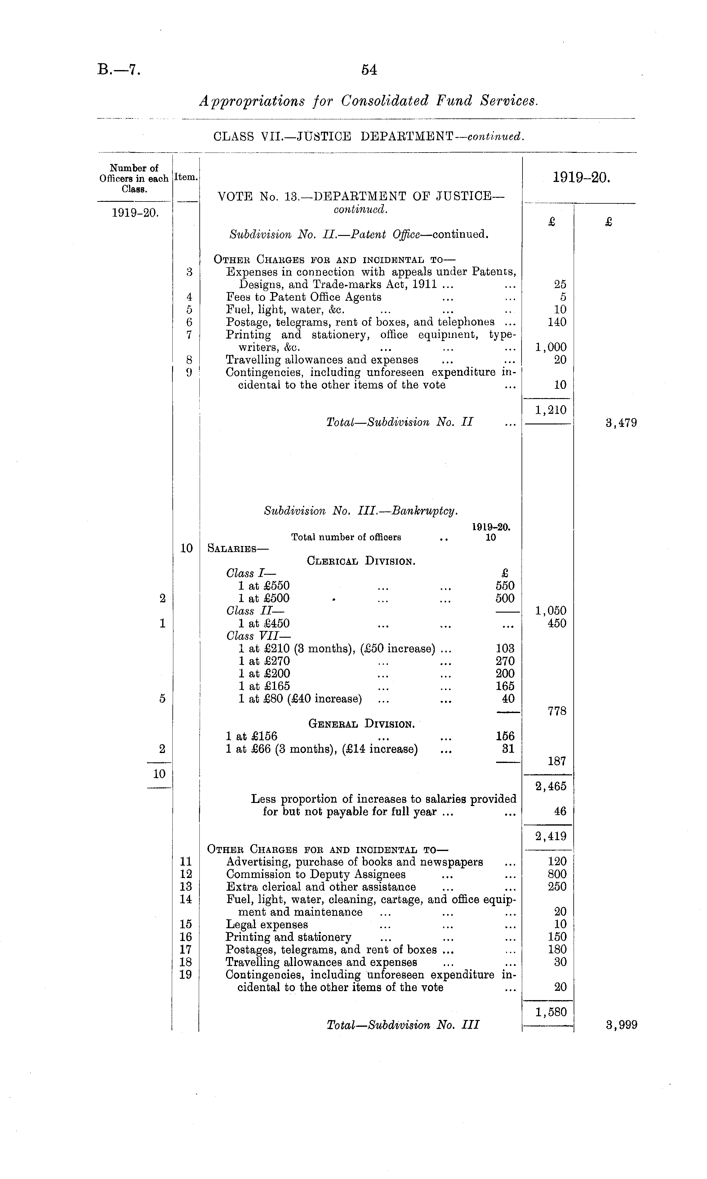Number of ifficers in each Class. Item. 19 9-20. VOTE No. 13.—DEPARTMENT OF JUSTICE— continued. 1919-20. Subdivision No. II. — Patent Office —continued. 3 4 5 6 7 Other Charges for and incidental to — Expenses in connection with appeals under Patents, Designs, and Trade-marks Act, 1911 ... Fees to Patent Office Agents Fuel, light, water, efec. Postage, telegrams, rent of boxes, and telephones ... Printing and stationery, office equipment, typewriters, &c. Travelling allowances and expenses Contingencies, including unforeseen expenditure incidental to the other items of the vote 25 5 10 140 8 9 1,000 20 10 Total — Subdivision No. II 1,210 3,479 Subdivision No. III. — Bankruptcy. 1919-20. Total number of offioers .. 10 10 Salaries— Clerical Division. 2 1 Class I— £ lat £550 ... ... 550 1 at £500 • ... ... 500 Class II — 1 at £450 Class VII— 1 at £210 (3 months), (£50 increase) ... 103 1 at £270 ... ... 270 1 at £200 ... ... 200 lat £165 ... ... 165 1 at £80 (£40 increase) ... ... 40 1,050 450 5 778 General Division. 2 1 at £156 ... ... 156 1 at £66 (3 months), (£14 increase) ... 31 187 10 Less proportion of increases to salaries provided for but not payable for full year ... 2,465 46 Other Charges for and incidental to — Advertising, purchase of books and newspapers Commission to Deputy Assignees Extra clerical and other assistance Fuel, light, water, cleaning, cartage, and office equipment and maintenance Legal expenses Printing and stationery Postages, telegrams, and rent of boxes ... Travelling allowances and expenses Contingencies, including unforeseen expenditure incidental to the other items of the vote 2,419 11 12 13 II 120 800 250 15 16 17 18 19 20 10 150 180 30 20 Total — Subdivision No. Ill 1,580 3,99'
