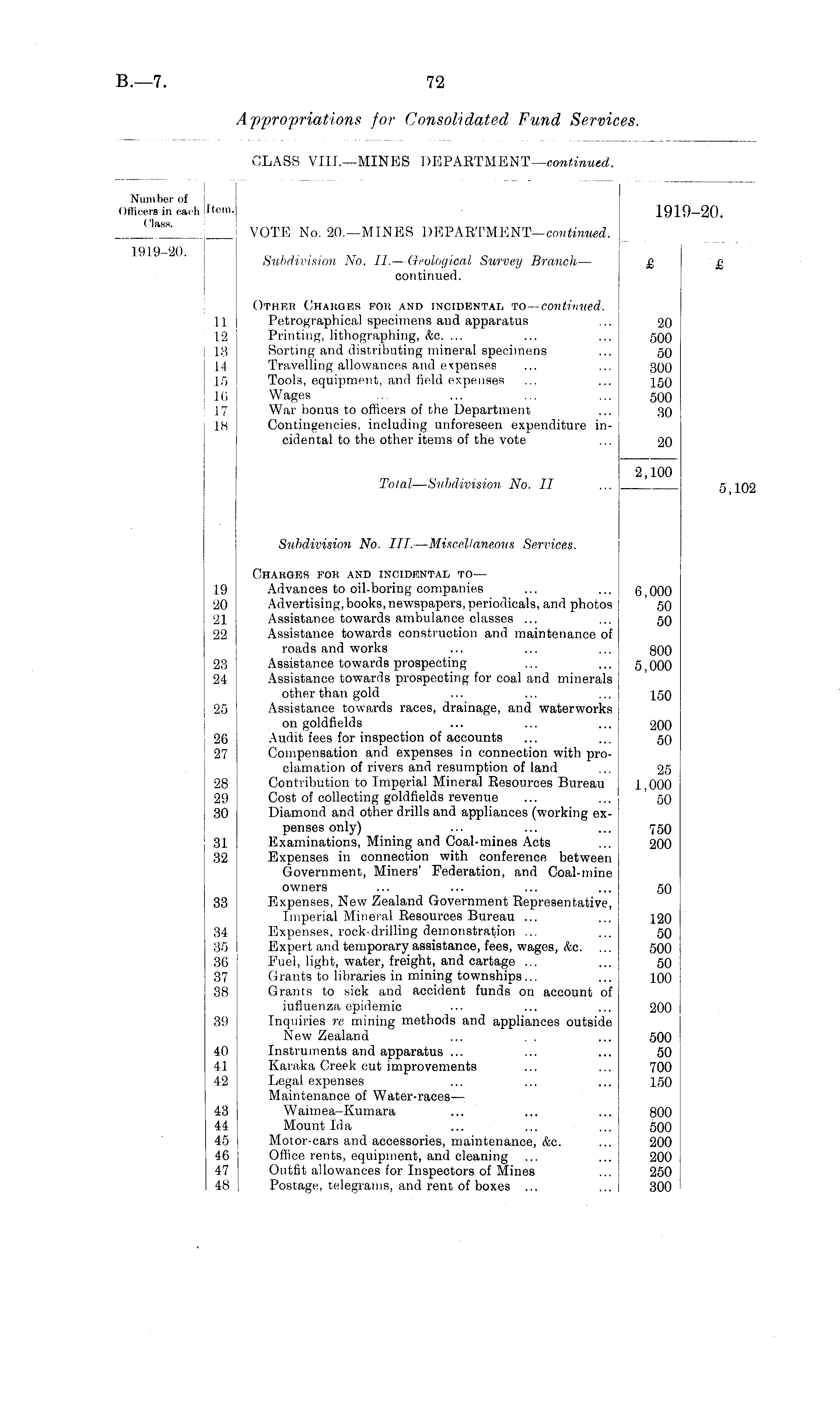 Number of Ifficers in each ('lass. hi Item. Item. 1919-20. VOTE No. 20.—MINES DEPARTMENT— continued. 1919-20. Subdivision No. II.—Geological Survey Branch — continued. £ £ 11 12 13 14 15 10 17 18 11 12 13 14 15 16 17 18 Other Charges for and incidental to— continued. Petrographical specimens and apparatus Printing, lithographing, kc, ... Sorting and distributing mineral specimens Travelling allowances and expenses Tools, equipment, and field expenses Wages War bonus to officers of the Department Contingencies, including unforeseen expenditure incidental to the other items of the vote 20 500 50 300 150 500 30 20 Total — Subdivision No. II 2,100 5 5,10! Subdivision No. III. — Miscellaneous Services. 19 20 21 22 23 24 25 26 27 28 29 30 31 32 19 20 21 22 23 2-1 25 Charges for and incidental to — Advances to oil-boring companies Advertising, books, newspapers, periodicals, and photos Assistance towards ambulance classes ... Assistance towards construction and maintenance of roads and works Assistance towards prospecting Assistance towards prospecting for coal and minerals other than gold Assistance towards races, drainage, and waterworks on goldfields Audit fees for inspection of accounts Compensation and expenses in connection with proclamation of rivers and resumption of land Contribution to Imperial Mineral Resources Bureau Cost of collecting goldfields revenue Diamond and other drills and appliances (working expenses only) Examinations, Mining and Coal-mines Acts Expenses in connection with conference between Government, Miners' Federation, and Coal-mine 6,000 50 50 800 5,000 150 200 50 26 27 28 29 30 25 1,000 50 31 32 750 200 33 34 35 36 37 38 39 40 41 42 43 44 45 46 47 48 owners Expenses, New Zealand Government Representative, Imperial Mineral Resources Bureau ... Expenses, rock-drilling demonstration ... Expert and temporary assistance, fees, wages, &c. Fuel, light, water, freight, and cartage ... Grants to libraries in mining townships... Grants to sick and accident funds on account of iufiuenza epidemic Inquiries re mining methods and appliances outside New Zealand Instruments and apparatus ... Karaka Creek cut improvements Legal expenses Maintenance of Water-races— Waiinea-Kumara Mount Ida Motor-cars and accessories, maintenance, &c. Office rents, equipment, anel cleaning Outfit allowances for Inspectors of Mines Postage, telegrams, and rent of boxes ... 50 120 50 500 50 100 200 500 50 700 150 800 500 200 200 250 300