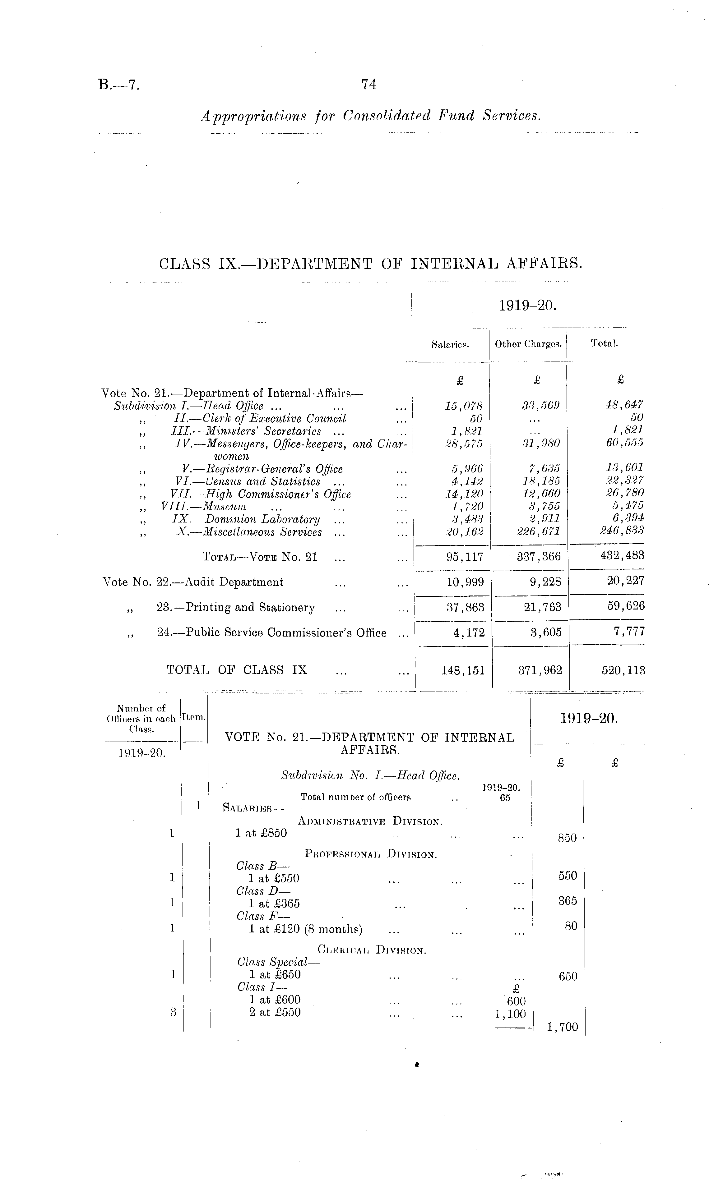 1919-20. 1919-20. Salaries. Other Charges. fotal. Salaries. Other Charges. Total. £ £ £ Vote No. 21..—Department of Internal-Affairs— Subdivision I.—Head Office ... ... ... 15,078 33,569 48,647 ,, II. — Clerk of Executive Council ... ' 50 ... 50 ,, III. — Ministers' Secretaries ... ... j 1,821 ... 1,821 IV.—Messengers, Office-keepers, and Char- 28,575 31,080 60,555 women V'.— Registrar-General's Office ... 5,966 7,635 13,601 VI.—Census and Statistics ... ... 4,142 18,185 22,327 VII.—High Commissioner's Office ... 14,120 12,660 26,780 „ VIII.—Museum ... ... ... 1,720 3,755 5,475 ,, IX. — Dominion Laboratory ... ... 3,483 2,911 6,394 X.—Miscellaneous Services ... ... 20,162 226,671 246,833 £ £ £ 15,078 50 1,821 28,575 33,569 31 , 980 48,647 50 1,821 60,555 5,966 4,142 14,120 1,720 3,483 20,162 7,635 18,185 12,660 3,755 2,911 226,671 13,601 22,327 26,780 5,475 6,394 246,833 Total—Vote No. 21 ... ... 95,117 337,366 432,483 337,366 432,483 Vote No. 22.—Audit Department ... ... 10,999 9,228 20,227 9,228 20,227 23.—Printing and Stationery ... ... 37,863 21,763 59,626 37,863 21,763 59,626 24.—Public Service Commissioner's Office ... 4,172 3,605 7,777 4,172 3,005 7,777 TOTAL OF CLASS IX ... ... 148,151 371,962 520,113 Number of Officers in each Item- 1919-20. _ a VOTE No. 21.—DEPARTMENT OF INTERNAL 1919-20. AFFAIRS. Item. £ £ Subdivision No. I. — Head Office. 1919-20. Total number of officers .. 05 1 Salaries — Administrative Division. 1 1 at £850 ... ... ... 850 850 Professional Division. Class B— 1 1 at £550 ... ... 550 Class D— 1 lat £365 ... , 365 Class F— 1 1 at £120 (8 months) ... . s0 550 1 1 365 1 80 Clerical Division. Class Special — 1 lat £650 ... ... ... 650 Class I — £ 1 at £600 ... ... 600 3 2 at £550 ... ... 1,100 650 3 1,700 1.700