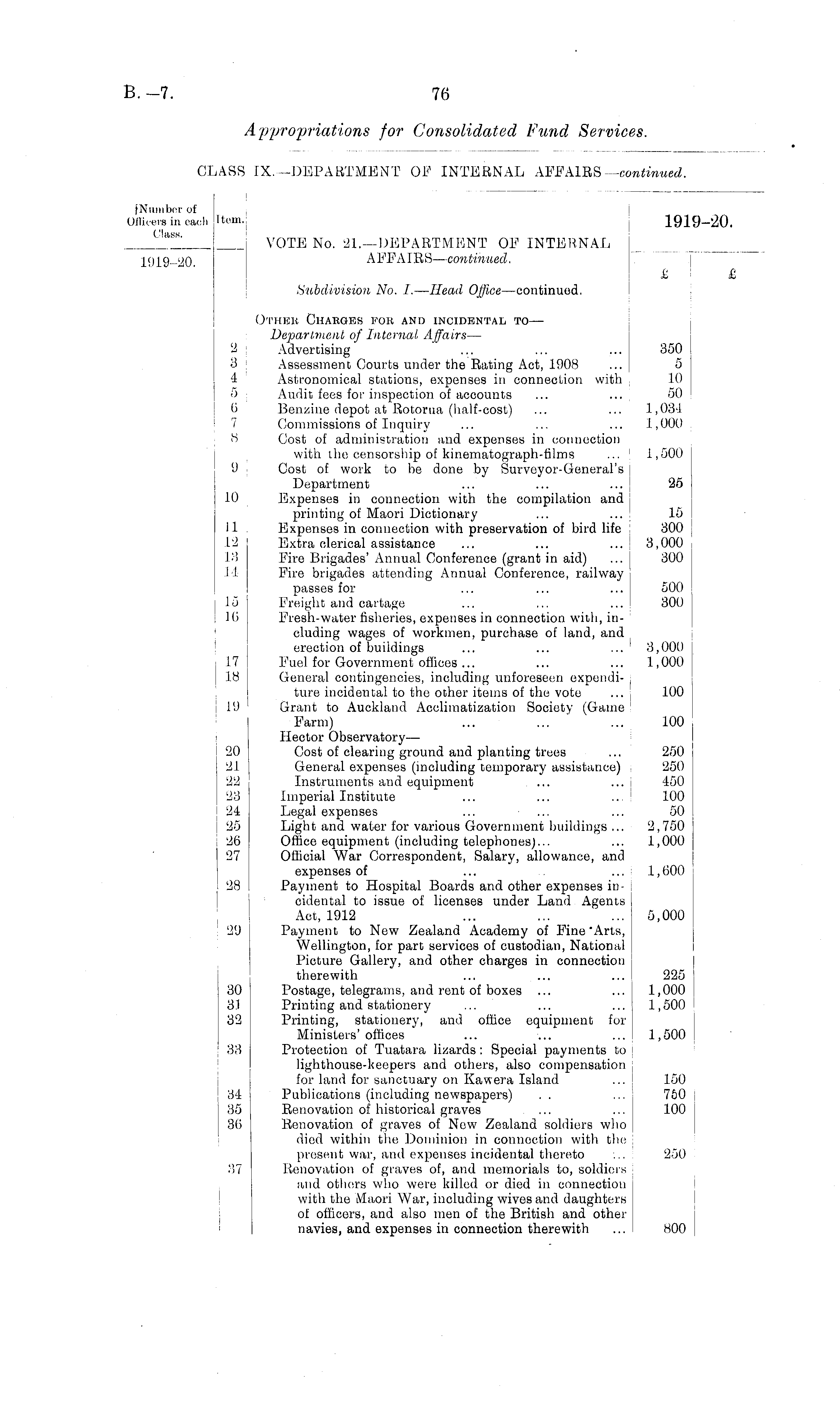 (Number of )ffie-ei'S in cae;h Class. ftom. 1919-20. 1919-20. VOTE No. 21.—DEPARTMENT OF INTERNAL A FFA IRS — continued,. Subdivision No. I. — Head Office —continued. £ £ 2 3 4 5 6 7 8 9 10 11 12 13 14 lo 10 17 18 19 20 21 22 23 24 25 26 27 28 29 30 31 32 33 34 35 36 37 17 18 19 20 21 22 23 24 25 26 27 Other Charges for and incidental to — Department of Internal Affairs — Advertising Assessment Courts under the Rating Act, 1908 Astronomical stations, expenses in connection with Audit fees for inspection of accounts Benzine depot at Rotorua (half-cost) ... ... Commissions of Inquiry Cost of administration and expenses in connection with the censorship of kinematograph-films ... Cost of work to be done by Surveyor-General's Department ... ... ... Expenses in connection with the compilation and printing of Maori Dictionary ... ... Expenses in connection with preservation of bird life Extra clerical assistance ... ... ... Fire Brigades' Annual Conference (grant in aiel) Fire brigades attending Annual Conference, railway passes for Freight and cartage Fresh-water fisheries, expenses in connection with, including wages of workmen, purchase of land, and erection of buildings ... ... ... Fuel for Government offices ... General contingencies, including unforeseen expenditure incidental to the other items of the vote ... j Grant to Auckland Acclimatization Society (Game Farm) Hector Observatory — Cost of clearing ground and planting trees General expenses (including temporary assistance) Instruments and equipment ... ... Imperial Institute ... ... ... Legal expenses Light and wafer for various Government buildings ... Office equipment (including telephones)... Official War Correspondent, Salary, allowance, and expenses of Payment to Hospital Boards and other expenses incidental to issue of licenses under Land Agents I Act, 1912 Payment to New Zealand Academy of Fine'Arts, Wellington, for part services of custodian, National Picture Gallery, and other charges in connection therewith Postage, telegrams, and rent of boxes Printing and stationery Printing, stationery, and office equipment for Ministers' offices Protection of Tuatara lizards : Special payments to lighthouse-keepers and others, also compensation for land for sanctuary on Kawera Island Publications (including newspapers) Renovation of historical graves Renovation of graves of New Zealand soldiers who died within the Dominion in connection with the present war, and expenses incidental thereto ... Renovation of graves of, and memorials to, soldiers and others who were killed or dieel in connection with the Maori War, including wives and daughters of officers, and also men of the British and other navies, and expenses in connection therewith 350 5 10 50 1,034 j 1,000 i, 500 25 15 300 3,000 300 500 300 3,000 1,000 100 100 250 250 450 100 50 2,750 1,000 1,600 5,000 225 1,000 1,500 1,500 150 750 100 250 800 28 29 30 31 32 33 34 35 36 37