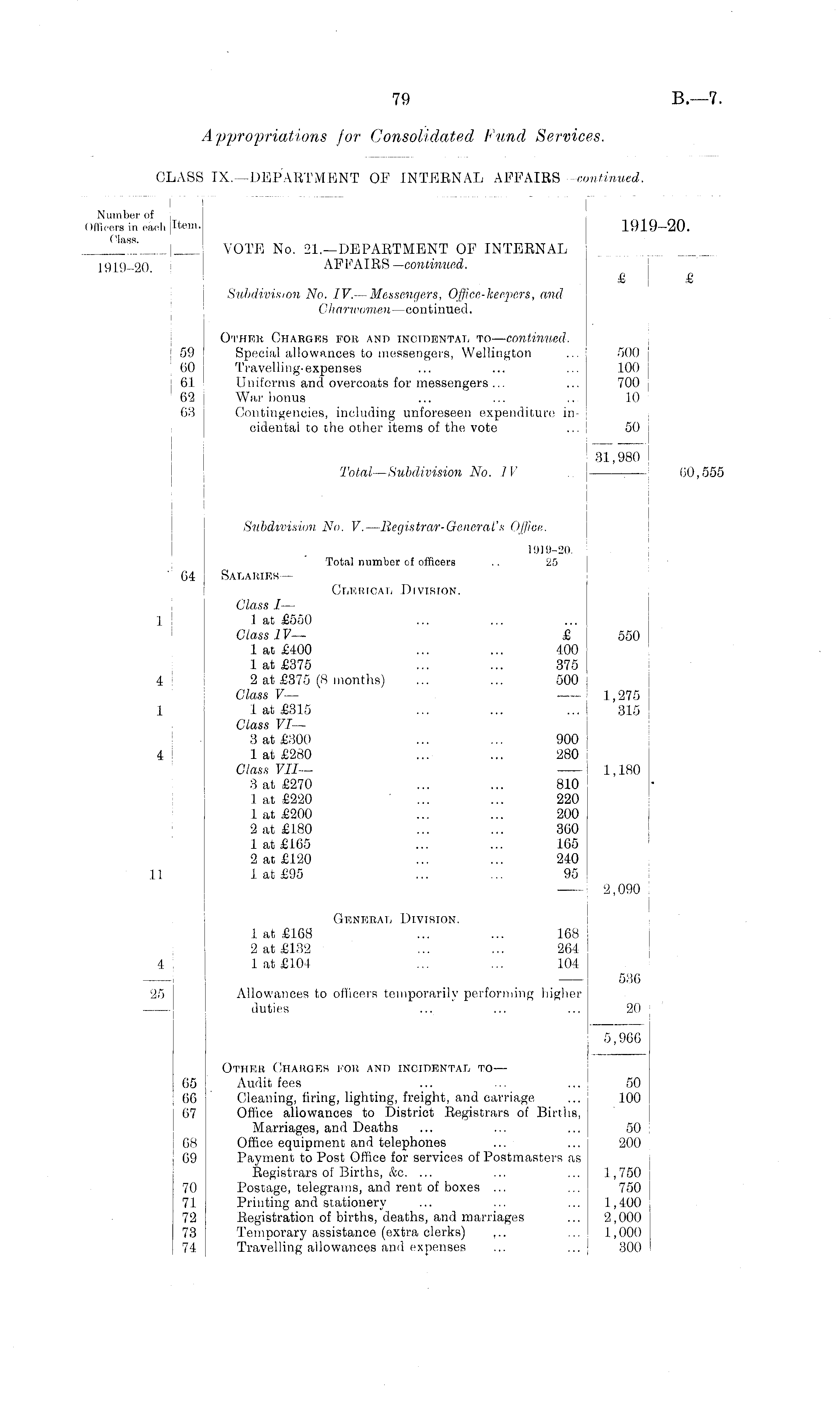 Number of Officers in eaoh Item. Class. 1919-20. 1919-20. VOTE No. 21.—DEPARTMENT OF INTERNAL AFFAIRS —continued. Subdivision No. IV. — Messengers, Office-keepers, and Charwomen —continueel. £ £ i .„ i 59 60 61 62 63 Other Charges for and incidental to — continued. Special allowances to messengers, Wellington Travelling-expenses Uniforms and overcoats for messengers ... War bonus Contingencies, including unforeseen expenditure incidental to the other items of the vote ... ! 500 100 700 10 50 31,980 Total — Subdivision No. IV 60,55' , Subdivision No. V. — Registrar-General's Office. 1919-20. 1 64 Total number of officers .. 25 Salaries — Clerical Division. 1 4 1 Glass I — 1 at £550 Class IV— £ 1 at £400 ... ... 400 1 at £375 ... ... 375 2 at £375 (8 months) ... ... 500 Class V— 1 at £315 Class VI— 3 at £300 ... ... 900 1 at £280 ... ... 280 Class VII— 3 at £270 ... ... 810 1 at £220 ... ... 220 1 at £200 ... ... 200 2 at £180 ... ... 360 lat £165 ... ... 165 2 at £120 ... ... 240 1 at £95 ... ... 95 550 1,275 315 1,180 4 11 2,090 General Division. 1 at £108 ... ... 168 2 at £132 ... ... 264 lat £104 ... ... 1.04 4: i 530 —i 25 Allowances to officers temporarily performing higher duties 20 Other Charges foe and incidental to — Audit fees Cleaning, tiring, lighting, freight, and carriage Office allowances to District Registrars of Bin lis, Marriages, and Deaths ... ... ... Office equipment and telephones Payment to Post Office for services of Postmasters as Registrars of Births, &c. ... Postage, telegrams, and rent of boxes ... Printing and stationery Registration of births, deaths, and marriages Temporary assistance (extra clerks) Travelling allowances and expenses ... ... | 5,966 65 66 67 50 100 68 69 50 200 70 71 72 73 74 1,750 750 1,400 2,000 1,000 300