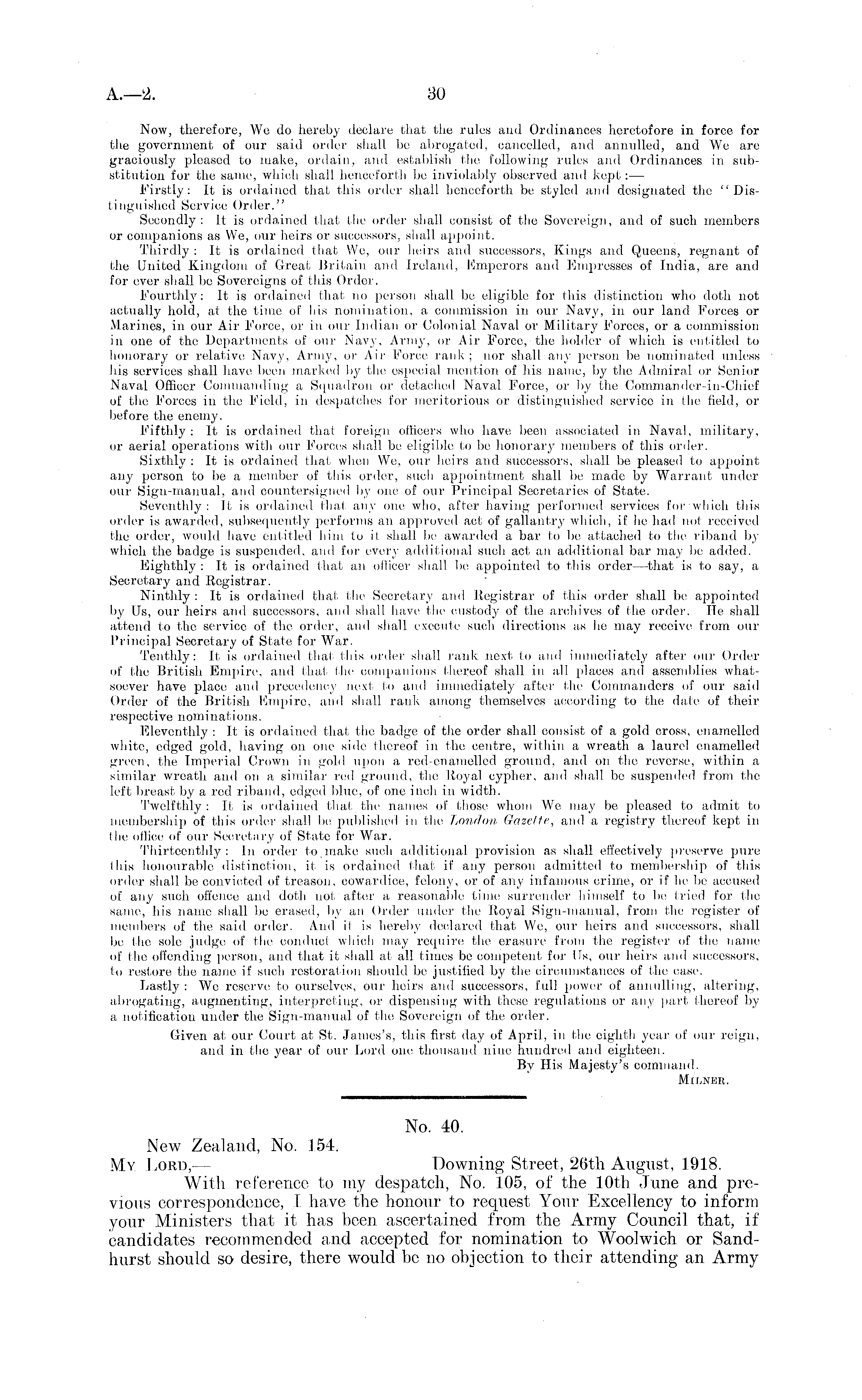 No. 40. New Zealand, No. 154. My Lord, — Downing Street, 26th August, 1918. With reference to my despatch, No. 105, of the 10th June and previous correspondence, I have the honour to request Your Excellency to inform your Ministers that it has been ascertained from the Army Council that, if candidates recommended and accepted for nomination to Woolwich or Sandhurst should so desire, there would be no objection to their attending an Army