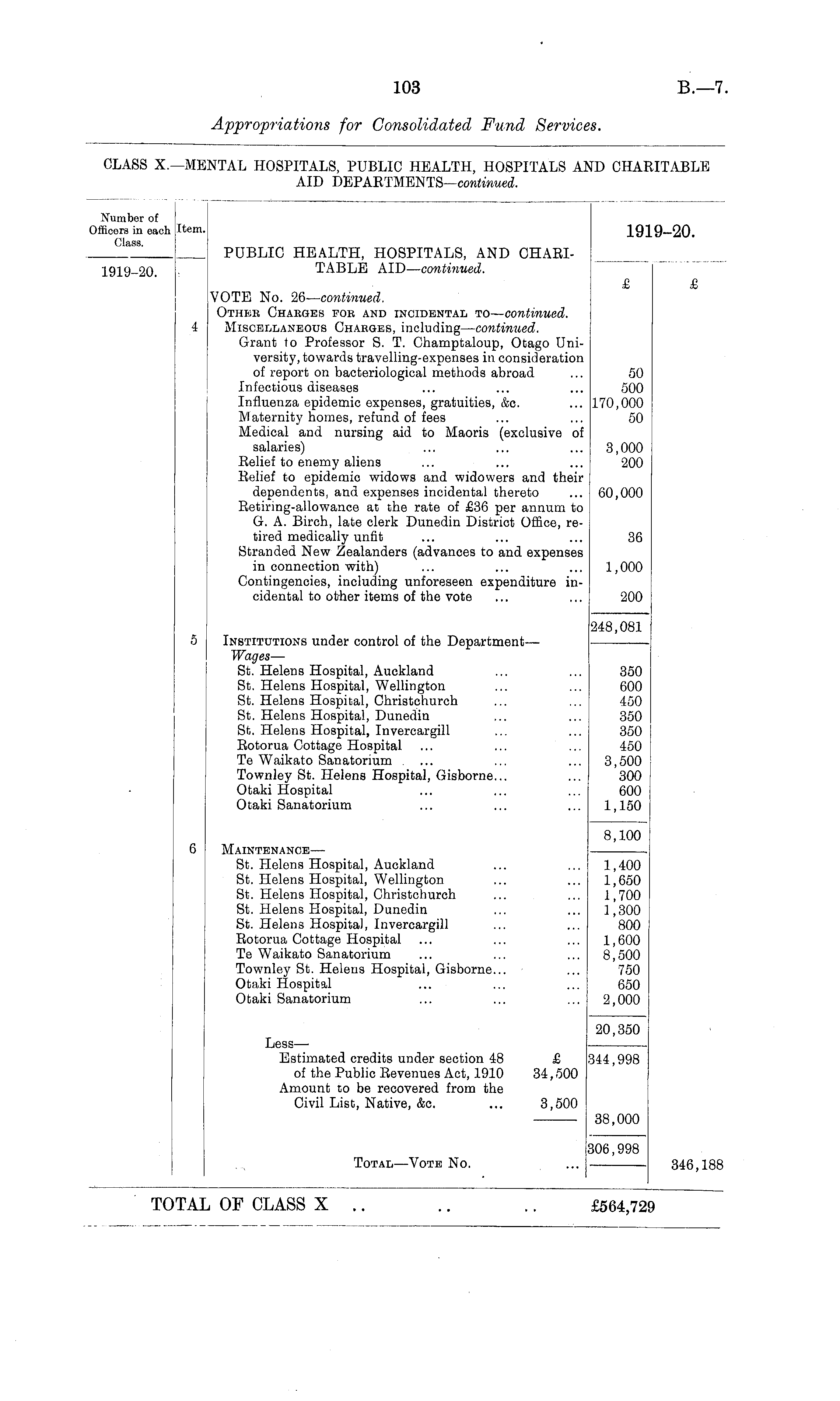 Number of ifficers in each Class. Item. 1919-20. PUBLIC HEALTH, HOSPITALS, AND CHARITABLE AID— continued. 1919-20. £ £ VOTE No. 26— continued. Other Charges for and incidental to — continued. Miscellaneous Charges, including— continued. Grant to Professor S. T. Champtaloup, Otago University, towards travelling-expenses in consideration of report on bacteriological methods abroad Infectious diseases Influenza epidemic expenses, gratuities, &c. Maternity homes, refund of fees Medical and nursing aid to Maoris (exclusive of salaries) Relief to enemy aliens Relief to epidemic widows and widowers and their dependents, and expenses incidental thereto Retiring-allowance at the rate of £36 per annum to G. A. Birch, late clerk Dunedin District Office, retired medically unfit Stranded New Zealanders (advances to and expenses in connection with) Contingencies, including unforeseen expenditure incidental to other items of the vote 50 500 170,000 50 3,000 200 60,000 36 1,000 200 Institutions under control of the Department—• Wages — St. Helens Hospital, Auckland St. Helens Hospital, Wellington St. Helens Hospital, Christchurch St. Helens Hospital, Dunedin St. Helens Hospital, Invercargill Rotorua Cottage Hospital Te Waikato Sanatorium Townley St. Helens Hospital, Gisborne... Otaki Hospital Otaki Sanatorium 248,081 350 000 450 350 350 450 3,500 300 600 1,150 Maintenance— St. Helens Hospital, Auckland St. Helens Hospital, Wellington St. Helens Hospital, Christchurch St. Helens Hospital, Dunedin St. Helens Hospital, Invercargill Rotorua Cottage Hospital Te Waikato Sanatorium Townley St. Helens Hospital, Gisborne... Otaki Hospital Otaki Sanatorium 8,100 1,400 1,650 1,700 1,300 800 1,600 8,500 750 650 2,000 Less — Estimated credits under section 48 £ of the Public Revenues Act, 1910 34,500 Amount to be recovered from the Civil List, Native, &c. ... 3,500 20,350 344,998 38,000 Total—Vote No. 306,998 346,18: TO >ta: OF CLASS X £564,72!