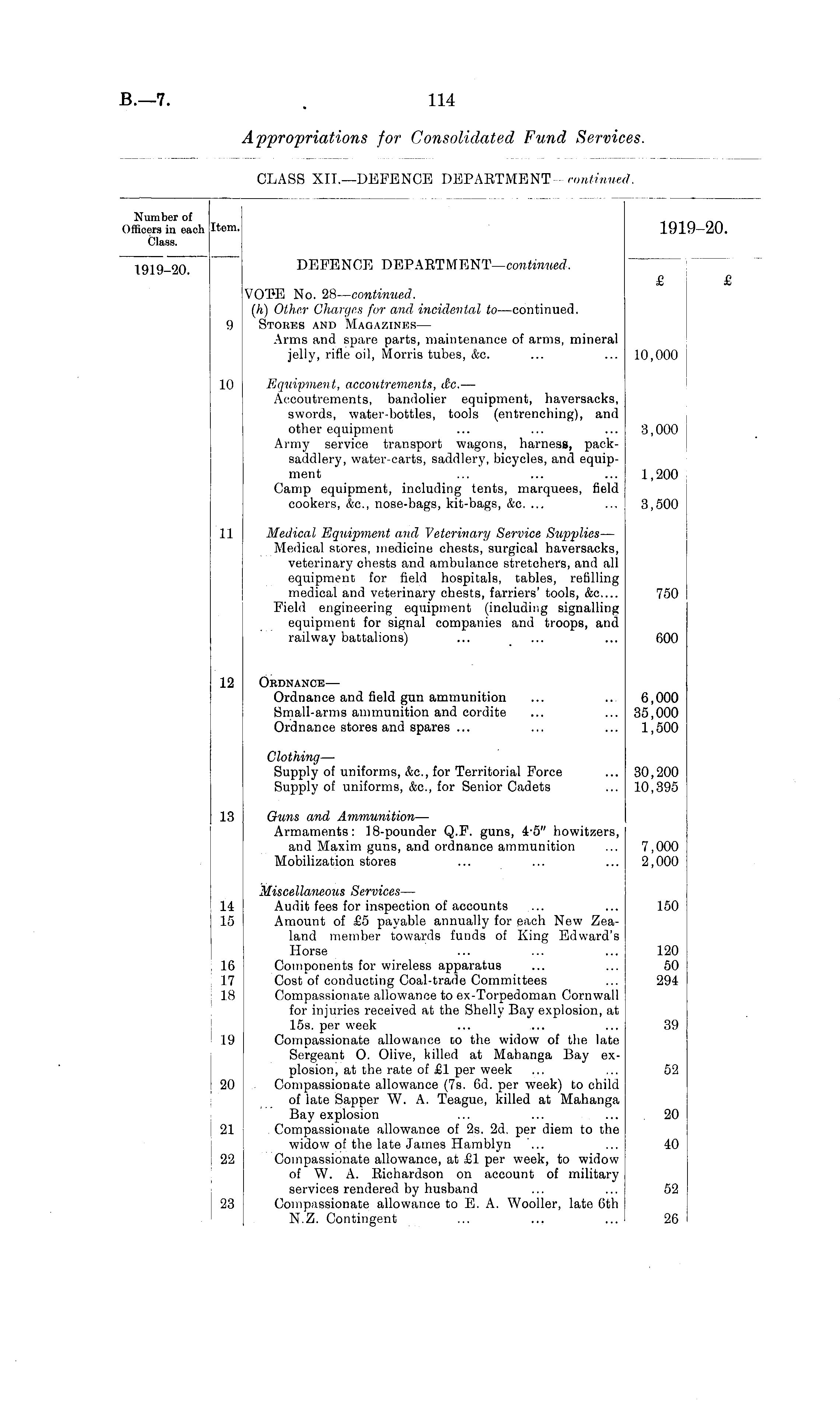 Number of ifficers in each Class. Item. 1919-20. DEFENCE DEPARTMENT— continued. 1919-20. '.) VOTE No. 28— continued, (h) Other Charges for and incidental to —continued. Stores and Magazines— Arms and spare parts, maintenance of arms, mineral jelly, rifle oil, Morris tubes, efec 10,000 10 Equipment, accoutrements, &c. — Accoutrements, bandolier equipment, haversacks, swords, water-bottles, tools (entrenching), and other equipment Army service transport wagons, harness, packsaddlery, water-carts, saddlery, bicycles, and equipment Camp equipment, including tents, marquees, field cookers, efec, nose-bags, kit-bags, <fec. ... 3,000 1,200 3,500 II Medical Equipment and Veterinary Service Supplies — Medical stores, medicine chests, surgical haversacks, veterinary chests and ambulance stretchers, and all equipment for field hospitals, tables, refilling medical and veterinary chests, farriers' tools, efec Field engineering equipment (including signalling equipment for signal companies and troops, and railway battalions) 750 600 12 Ordnance — Ordnance and field gun ammunition Small-arms ammunition and cordite Ordnance stores and spares ... 6,000 35,000 1,500 Clothing — Supply of uniforms, efec, for Territorial Force Supply of uniforms, efec, for Senior Cadets 30,200 10,395 13 Guns and Ammunition — Armaments: 18-pounder Q.F. guns, 4-5" howitzers, and Maxim guns, and ordnance ammunition Mobilization stores 7,000 2,000 14 15 Miscellaneous Services — Audit fees for inspection of accounts Amount of £5 payable annually for each New Zealand member towards funds of King Edward's Horse 150 10 17 is Components for wireless apparatus Cost of conducting Coal-trade Committees Compassionate allowance to ex-Torpedoman Cornwall for injuries received at the Shelly Bay explosion, at 15s. per week Compassionate allowance to the widow of the late Sergeant O. Olive, killed at Mahanga Bay explosion, at the rate of £1 per week Compassionate allowance (7s. 6d. per week) to child of late Sapper W. A. Teague, killed at Mahanga Bay explosion Compassionate allowance of 2s. 2d. per diem to the widow of the late James Hamblyn Compassionate allowance, at £1 per week, to widow of W. A. Richardson on account of military services rendered by husband Compassionate allowance to E. A. Wooller, late 6th N.Z. Contingent 120 50 294 39 19 52 I 20 1 20 21 40 22 52 23 26