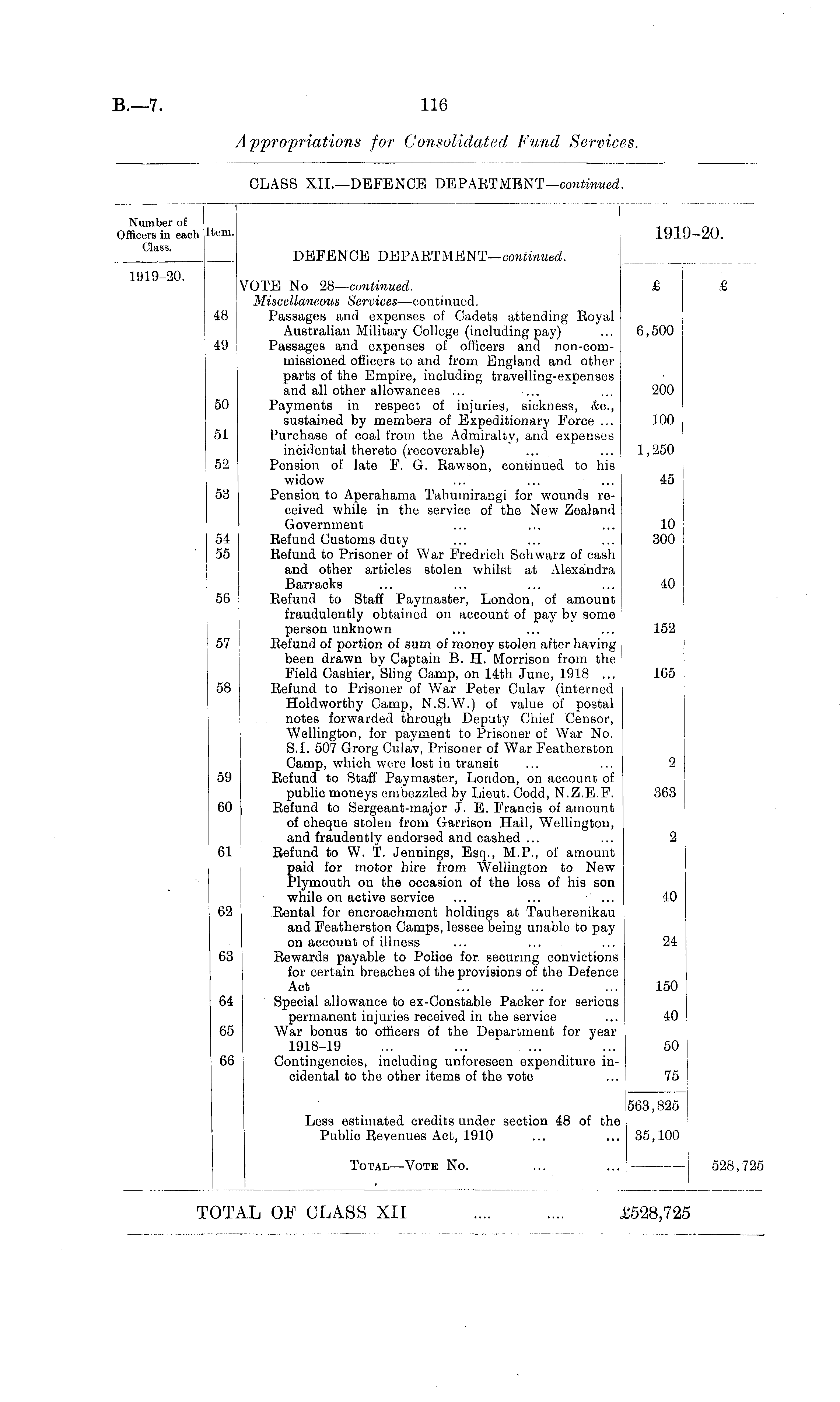 Number of Officers in each Class. Item. 1919-20. DEFENCE DEPARTMENT— continued. 1919-20. VOTE No 28— continued. Miscellaneous Services —continued. Passages and expenses of Cadets attending Royal Australian Military College (including pay) Passages and expenses of officers and non-com-missioned officers to and from England and other parts of the Empire, including travelling-expenses and all other allowances ... Payments in respect of injuries, sickness, &c, sustained by members of Expeditionary Force ... Purchase of coal from the Admiralty, and expenses incidental thereto (recoverable) Pension of late F. G. Rawson, continued to his widow Pension to Aperahama Tahumirangi for wounds received while in the service of the New Zealand Government Refund Customs duty Refund to Prisoner of War Fredrich Schwarz of cash and other articles stolen whilst at Alexandra Barracks Refund to Staff Paymaster, London, of amount fraudulently obtained on account of pay by some person unknown Refund of portion of sum of money stolen after having been drawn by Captain B. H. Morrison from the Field Cashier, Sling Camp, on 14th June, 1918 ... Refund to Prisoner of War Peter Culav (interned Holdworthy Camp, N.S.W.) of value of postal notes forwarded through Deputy Chief Censor, Wellington, for payment to Prisoner of War No. S.I. 507 Grorg Culav, Prisoner of War Featherston Camp, which were lost in transit Refund to Staff Paymaster, London, on account of public moneys embezzled by Lieut. Codd, N.Z.E.F. Refund to Sergeant-major J. E. Francis of amount of cheque stolen from Garrison Hall, Wellington, and fraudently endorsed and cashed ... Refund to W. T. Jennings, Esq., M.P., of amount paid for motor hire from Wellington to New Plymouth on the occasion of the loss of his son while on active service ... ... ... Rental for encroachment holdings at Tauherenikau and Featherston Camps, lessee being unable to pay on account of illness Rewards payable to Police for securing convictions for certain breaches of the provisions of the Defence Act Special allowance to ex-Constable Packer for serious permanent injuries received in the service War bonus to officers of the Department for year 1918-19 Contingencies, including unforeseen expenditure incidental to the other items of the vote £ £ 4.8 49 6,500 200 50 100 51 52 1,250 53 45 10 300 54 55 40 50 152 57 165 58 2 59 363 60 2 61 40 62 24 63 150 04 40 65 66 50 75 Less estimated credits under section 48 of the Public Revenues Act, 1910 563,825 35,100 Total—Vote No. 528,725 * T 'TAL OF CLASS XII .£528,725