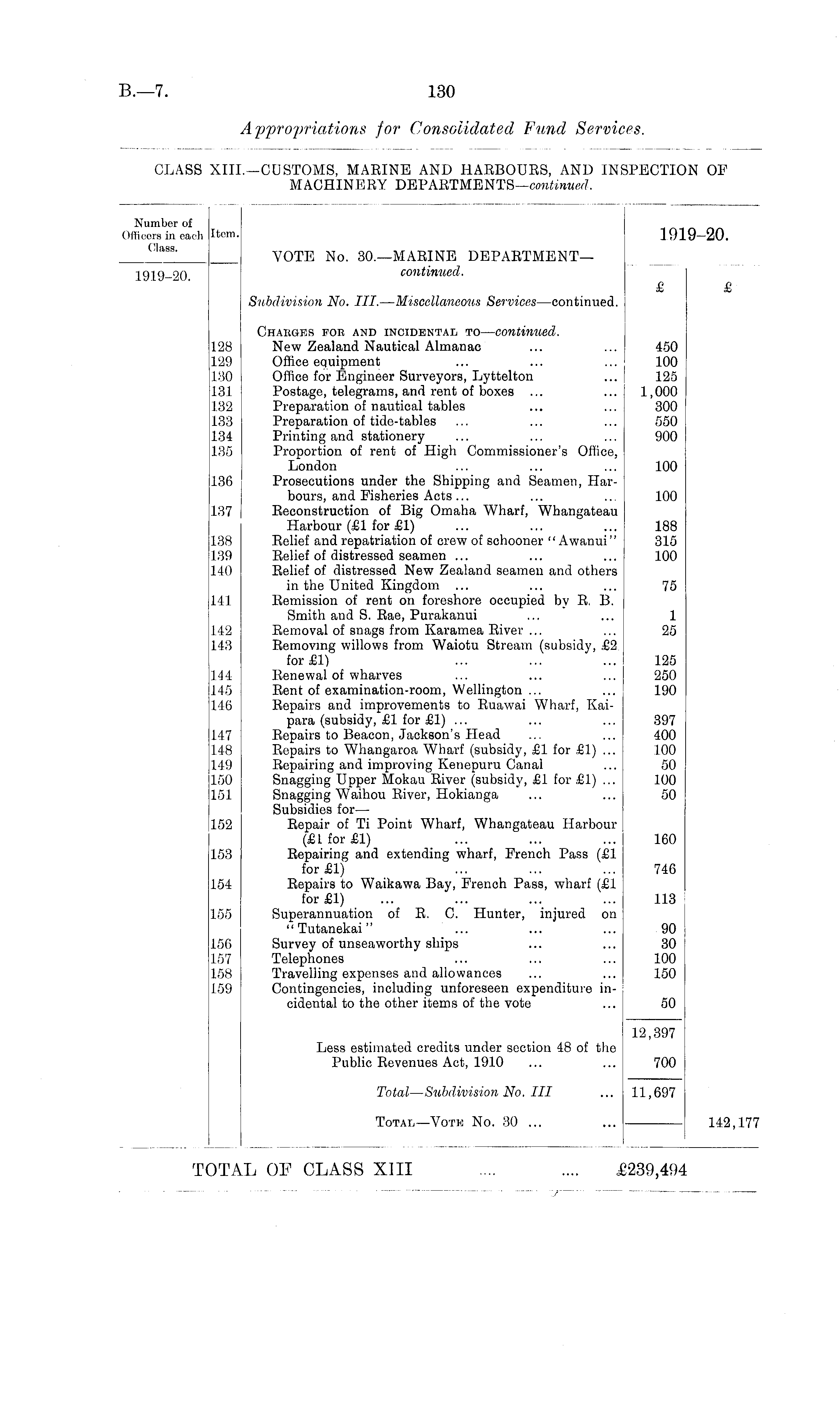 Number of Ifficers in each Class. Item. 1919-20. VOTE No. 30.—MARINE DEPARTMENT— continued. 1919-20. £ £ Subdivision No. III. — Miscellaneous Services —continued. 128 129 130 131 132 133 134 135 Charges for and incidental to — continued. New Zealand Nautical Almanac Office equipment Office for Engineer Surveyors, Lyttelton Postage, telegrams, and rent of boxes Preparation of nautical tables Preparation of tide-tables Printing and stationery Proportion of rent of High Commissioner's Office, London Prosecutions under the Shipping and Seamen, Harbours, and Fisheries Acts... Reconstruction of Big Omaha Wharf, Whangateau Harbour (£1 for £1) Relief and repatriation of crew of schooner "Awanui" Relief of distressed seamen ... Relief of distressed New Zealand seamen and others in the United Kingdom ... Remission of rent on foreshore occupied by R, B. Smith and S. Rae, Purakanui Removal of snags from Karamea River ... Removing willows from Waiotu Stream (subsidy, £2 for£l) Renewal of wharves Rent of examination-room, Wellington ... Repairs and improvements to Ruawai Wharf, Kaipara (subsidy, £1 for £1) ... Repairs to Beacon, Jackson's Head Repairs to Whangaroa Wharf (subsidy, £1 for £1) ... Repairing and improving Kenepuru Canal Snagging Upper Mokau River (subsidy, £1 for £1) ... Snagging Waihou River, Hokianga Subsidies for — Repair of Ti Point Wharf, Whangateau Harbour (£lfor£l) Repairing and extending wharf, French Pass (£1 for£l) Repairs to Waikawa Bay, French Pass, wharf (£1 for£l) Superannuation of R. C. Hunter, injured on " Tutanekai" Survey of unseaworthy ships Telephones Travelling expenses and allowances Contingencies, including unforeseen expenditure incidental to the other items of the vote 450 100 125 1,000 300 550 900 136 100 137 100 138 139 140 188 315 100 141 75 142 143 1 25 144 145 146 125 250 190 147 14-8 149 150 151 397 400 100 50 100 50 152 160 153 746 154 113 155 90 30 100 150 156 157 158 159 50 Less estimated credits under section 48 of the Public Revenues Act, 1910 12,397 700 Total — Subdivision No. Ill 11,697 Total—Vote No. 30 ... 142. 142,17 '1' )T. L OF CLASS XIII 239,49