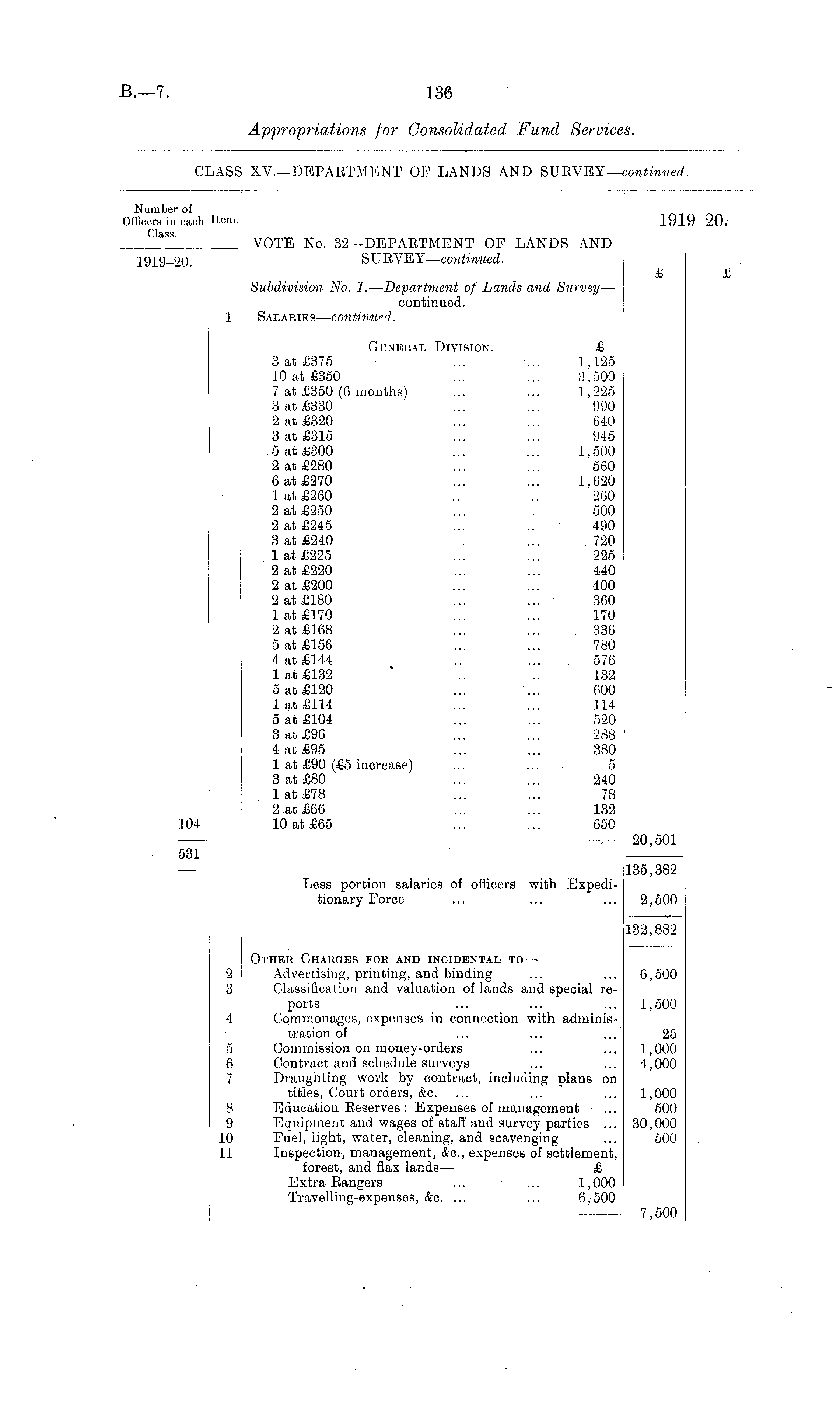 Number of ifficers in each Class. Item. 1919-20. VOTE No. 32—DEPARTMENT OF LANDS AND SURVEY— continued. 1919-20. £ £ Subdivision No. 1. — Department of Lands and Survey — continued. Salaries— continued. General Division. £ 3 at £375 ... ... 1,125 10 at £350 ... ... 3,500 7 at £350 (6 months) ... ... 1,225 3 at £330 ... ... 990 2 at £320 ... ... 640 3 at £315 ... ... 945 5 at £300 ... ... 1,500 2 at £280 ... ... 560 6 at £270 ... ... 1,620 1 at £260 ... ... 260 2 at £250 ... ... 500 2 at £245 ... ... 490 3 at £240 ... ... 720 lat £225 ... ... 225 2 at £220 ... ... 440 2 at £200 ... ... 400 2 at £180 ... ... 360 1 at £170 ... ... 170 2 at £168 ... ... 336 5 at £150 ... ... 780 4 at £144 ... ... 576 lat £132 ... ... 132 5 at £120 ... ... 600 1 at £114 ... ... 114 5 at £104 ... ... 520 3 at £90 ... ... 288 4 at £95 ... ... 380 1 at £90 (£5 increase) ... ... 5 3 at £80 ... ... 240 lat £78 ... ... 78 2 at £66 ... ... 132 10 at £65 ... ... 650 104 20,501 531 Less portion salaries of officers with Expeditionary Force 135,382 2,600 Other Charges for and incidental to — Advertising, printing, and binding Classification and valuation of lands and special re132,882 2 3 6,500 4 ports Commonages, expenses in connection with administration of Commission on money-orders Contract and schedule surveys Draughting work by contract, including plans on titles, Court orders, &c. Education Reserves : Expenses of management Equipment and wages of staff and survey parties ... Fuel, light, water, cleaning, and scavenging Inspection, management, &c, expenses of settlement, forest, and flax lands— £ Extra Rangers ... ... 1,000 Travelling-expenses, &c. ... ... 0,500 1,500 5 6 7 25 1,000 4,000 8 9 10 11 1,000 500 30,000 500 7,500