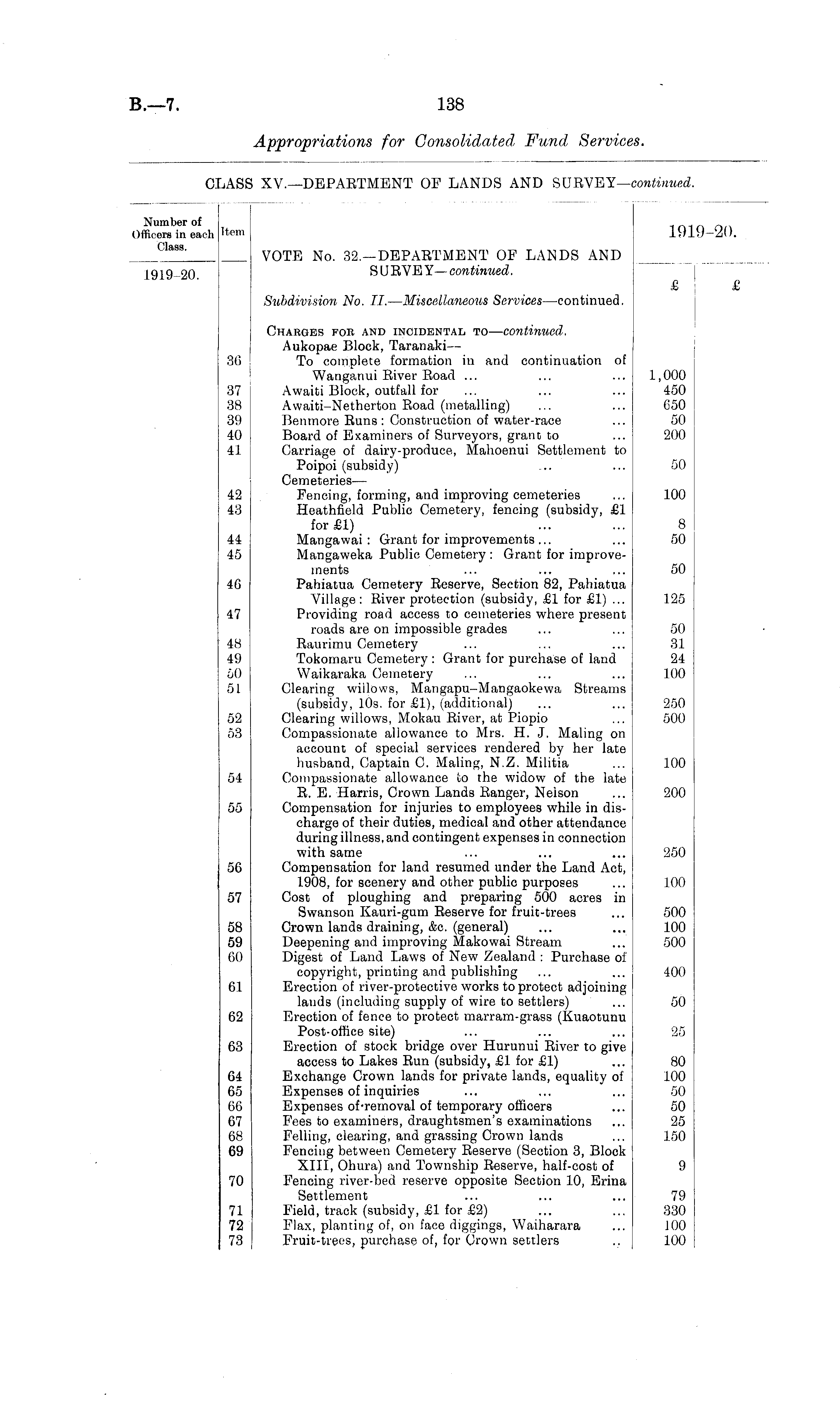 Number of Officers in eae4i Class. Item 1919 -20. VOTE No. 32.—DEPARTMENT OF LANDS AND SURVEY— continued. 1919-20. £ £ Subdivision No. II. — Miscellaneous Services —continued. 36 37 88 89 40 41 42 43 -11 45 46 47 48 49 60 51 52 53 51 Charges for and incidental to — continued. Aukopae Block, Taranaki— To complete formation in and continuation of Wanganui River Road ... Awaiti Block, outfall for Awaiti-Netherton Road (metalling) Benmore Runs : Construction of water-race Board of Examiners of Surveyors, grant to Carriage of dairy-produce, Mahoenui Settlement to Poipoi (subsidy) CemeteriesFencing, forming, and improving cemeteries Heathfield Public Cemeterv, fencing (subsidy, £1 for£l) Mangawai: Grant for improvements ... Mangaweka Public Cemetery : Grant for improvements Pahiatua Cemetery Reserve, Section 82, Pahiatua Village : River protection (subsidy, £1 for £1) ... Providing road access to cemeteries where present roads are on impossible grades Raurimu Cemetery Tokomaru Cemetery: Grant for purchase of land Waikaraka Cemetery Clearing willows, Mangapu-Mangaokewa Streams (subsidy, 10s. for £1), (additional) Clearing willows, Mokau River, at Piopio Compassionate allowance to Mrs. H. J. Maling on account of special services rendered by her late husband, Captain C. Maling, N.Z. Militia Compassionate allowance to the widow of the late R. E. Harris, Crown Lands Ranger, Nelson Compensation for injuries to employees while in discharge of their duties, medical and other attendance during illness, and contingent expenses in connection with same Compensation for land resumed under the Land Act, 1908, for scenery and other public purposes Cost of ploughing and preparing 500 acres in Swanson Kauri-gum Reserve for fruit-trees Crown lands draining, efec. (general) Deepening and improving Makowai Stream Digest of Land Laws of New Zealand : Purchase of copyright, printing and publishing Erection of river-protective works to protect adjoining lands (including supply of wire to settlers) Erection of fence to protect marram-grass (Kuaotunu Post-office site) Erection of stock bridge over Hurunui River to give access to Lakes Run (subsidy, £1 for £1) Exchange Crown lands for private lands, equality of Expenses of inquiries Expenses of-removal of temporary officers Fees to examiners, draughtsmen's examinations Felling, clearing, and grassing Crown lands Fencing between Cemetery Reserve (Section 3, Block XIII, Ohura) and Township Reserve, half-cost of Fencing river-bed reserve opposite Section 10, Erina Settlement Field, track (subsidy, £1 for £2) Flax, planting of, on face diggings, Waiharara Fruit-trees, purchase of, for Crown settlers 1,000 450 650 50 200 50 100 8 50 50 125 50 31 24 100 250 500 100 200 55 250 56 100 57 500 100 500 58 59 60 01 400 02 50 25 63 80 100 50 50 25 150 04 05 66 07 68 69 9 70 79 330 100 100 71 72 73