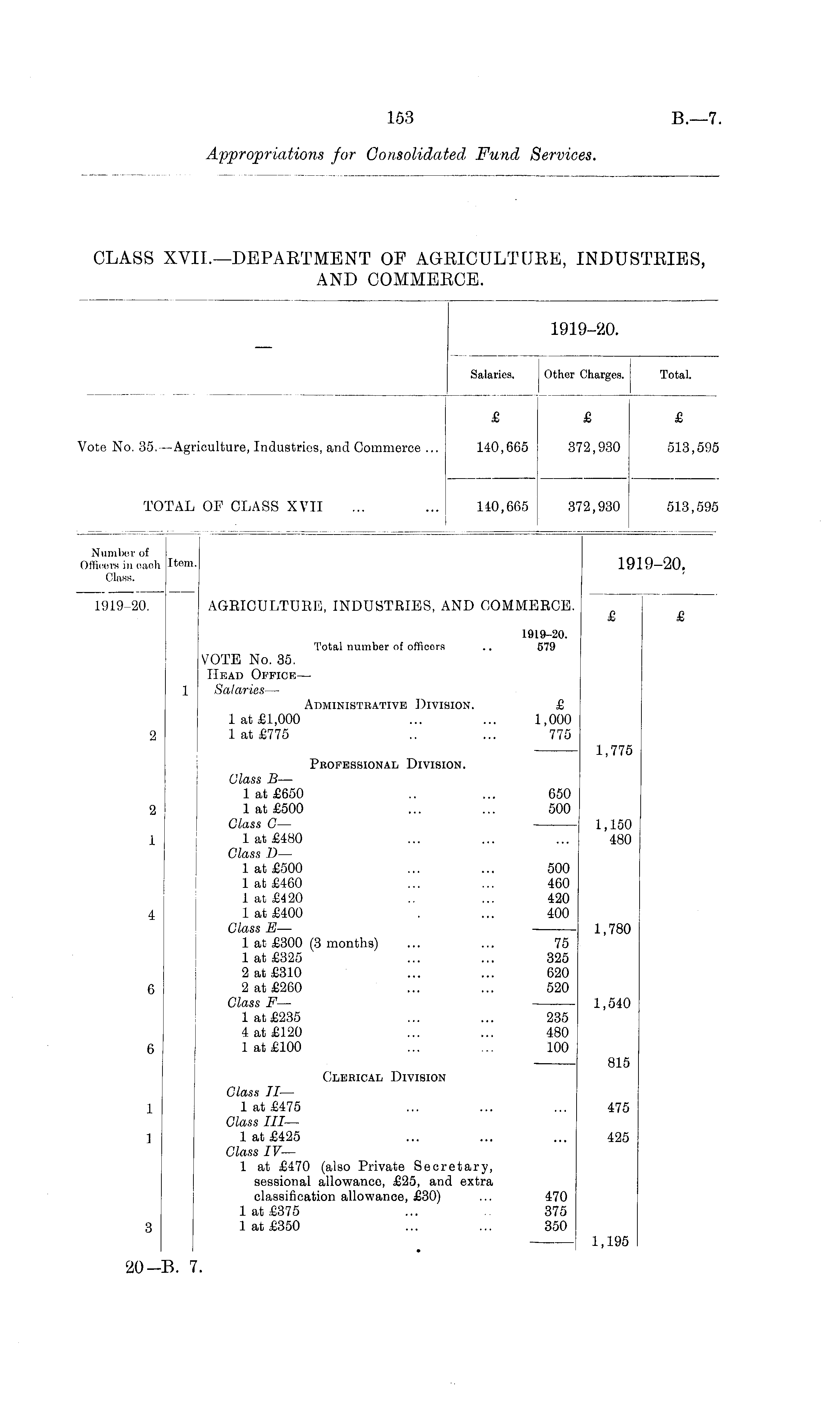 Salaries. 1919-20. Other Charges. 1919-20. Total. £ £ £ Vote No. 35. —Agriculture, Industries, and Commerce ... 140,665 372,930 513,595 TOTAL OF CLASS XVII 140,005 372,930 513,595 Number of Officers in each Item. Class. 19-20. 1919-20. AGRICULTURE, INDUSTRIES, i AGRICULTURE, INDUSTRIES, AND COMMERCE. 1919-20. Total number of officers .. 579 VOTE No. 35. Head Office — Salaries — Administrative Division. £ lat £1,000 ... ... 1,000 lat £775 .. ... 775 1,775 Professional Division. 2 1 Class B — lat £650 .. ... 650 lat £500 ... ... 500 Class C — lat £480 Class D — lat £500 ... ... 500 lat £460 ... ... 460 lat £420 .. ... 420 lat £400 . ... 400 Class E —. 1 at £300 (3 months) ... ... 75 lat £325 ... ... 325 2 at £310 ... ... 620 2 at £260 ... ... 520 Class F— lat £235 ... ... 235 4 at £120 ... ... 480 lat £100 ... ... 100 1,150 480 1,780 1,540 0 815 Clerical Division 1 Class II — lat £475 Class III— lat £425 Class IV— 1 at £470 (also Private Secretary, sessional allowance, £25, and extra classification allowance, £30) ... 470 lat £375 ... 375 lat £350 ... ... 350 475 1 425 1,195