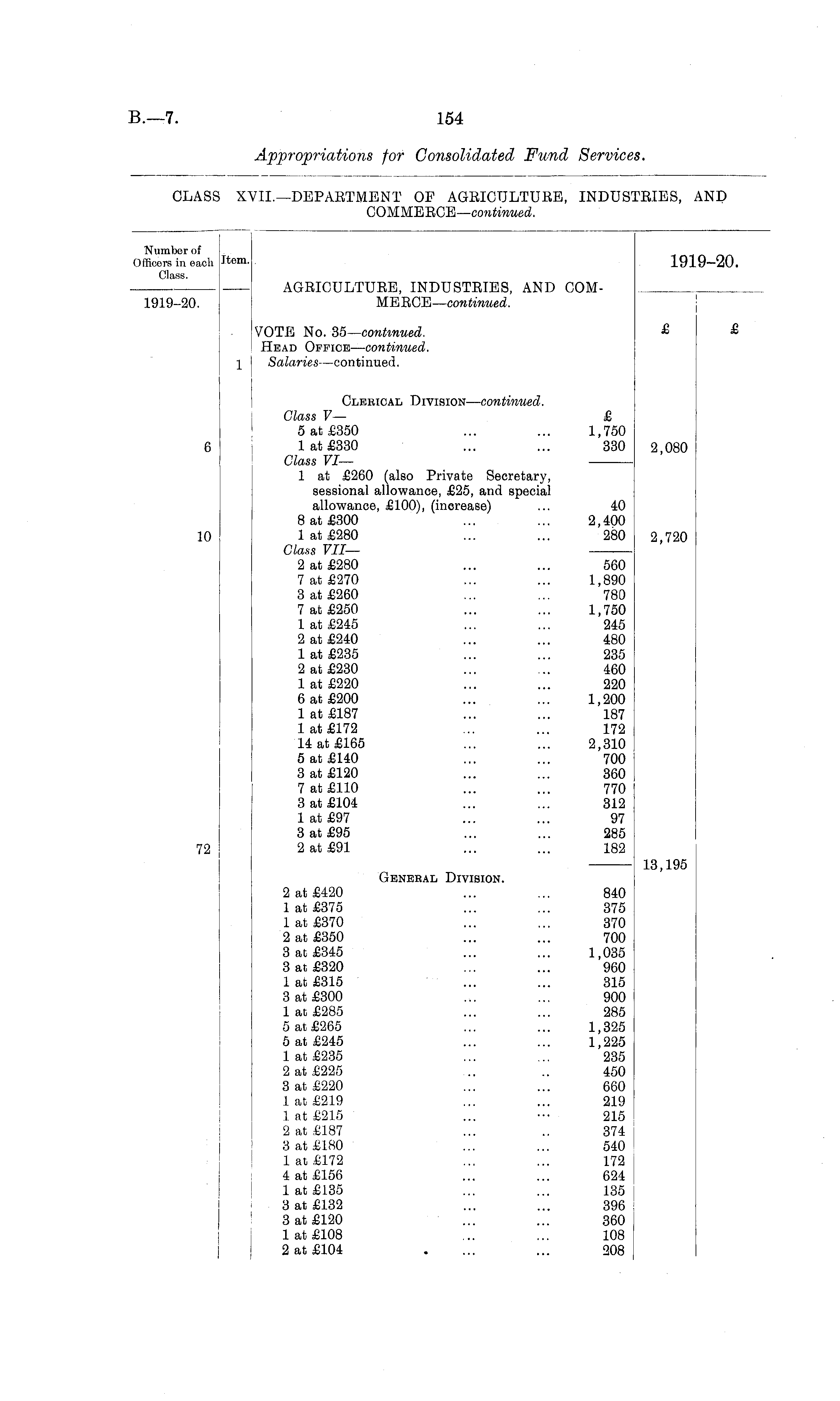 Number of fficers in each Class. Item. 1919-20. 1919-20. AGRICULTURE, INDUSTRIES, AND COMMERCE— continued. VOTE No. 35— continued. Head Office— continued. Salaries —continued. Clerical Division— continued. 10 Glass V— £ 5 at £350 ... ... 1,750 lat £330 ... ... 330 Class VI— 1 at £260 (also Private Secretary, sessional allowance, £25, and special allowance, £100), (increase) ... 40 8 at £300 ... ... 2,400 lat £280 ... ... 280 Class VII— 2 at £280 ... ... 560 7 at £270 ... ... 1,890 3 at £260 ... ... 780 7 at £250 ... ... 1,750 lat £245 ... ... 245 2 at £240 ... ... 480 1 at £235 ... ... 235 2 at £230 ... ... 460 1 at £220 ... ... 220 6 at £200 ... ... 1,200 1 at £187 ... ... 187 lat £172 ... ... 172 14 at £165 ... ... 2,310 5 at £140 ... ... 700 3 at £120 ... ... 360 7 at £110 ... ... 770 3 at £104 ... ... 312 1 at £97 ... ... 97 3 at £95 ... ... 285 2 at £91 ... ... 182 2,080 2,720 72 13,195 General Division. 2 at £420 ... ... 840 1 at £375 ... ... 375 1 at £370 ... ... 370 2 at £350 ... ... 700 3 at £345 ... ... 1,035 3 at £320 ... ... 960 1 at £315 ... ... 315 3 at £300 .... ... 900 1 at £285 ... ... 285 5at£265 ... ... 1,325 5 at £245 ... ... 1,225 1 at £235 ... ... 235 2 at £225 ... .. 450 3 at £220 ... ... 660 1 at £219 ... ... 219 1 at £215 ... ••■ 215 2 at £187 ... .. 374 3 at £180 ... ... 540 lat £172 ... ... 172 4 at £156 ... ... 624 1 at £135 ... ... 135 3 at £132 ... ... 396 3 at £120 ... ... 360 1 at £108 ... ... 108 j 2 at £104 . ... ... 208
