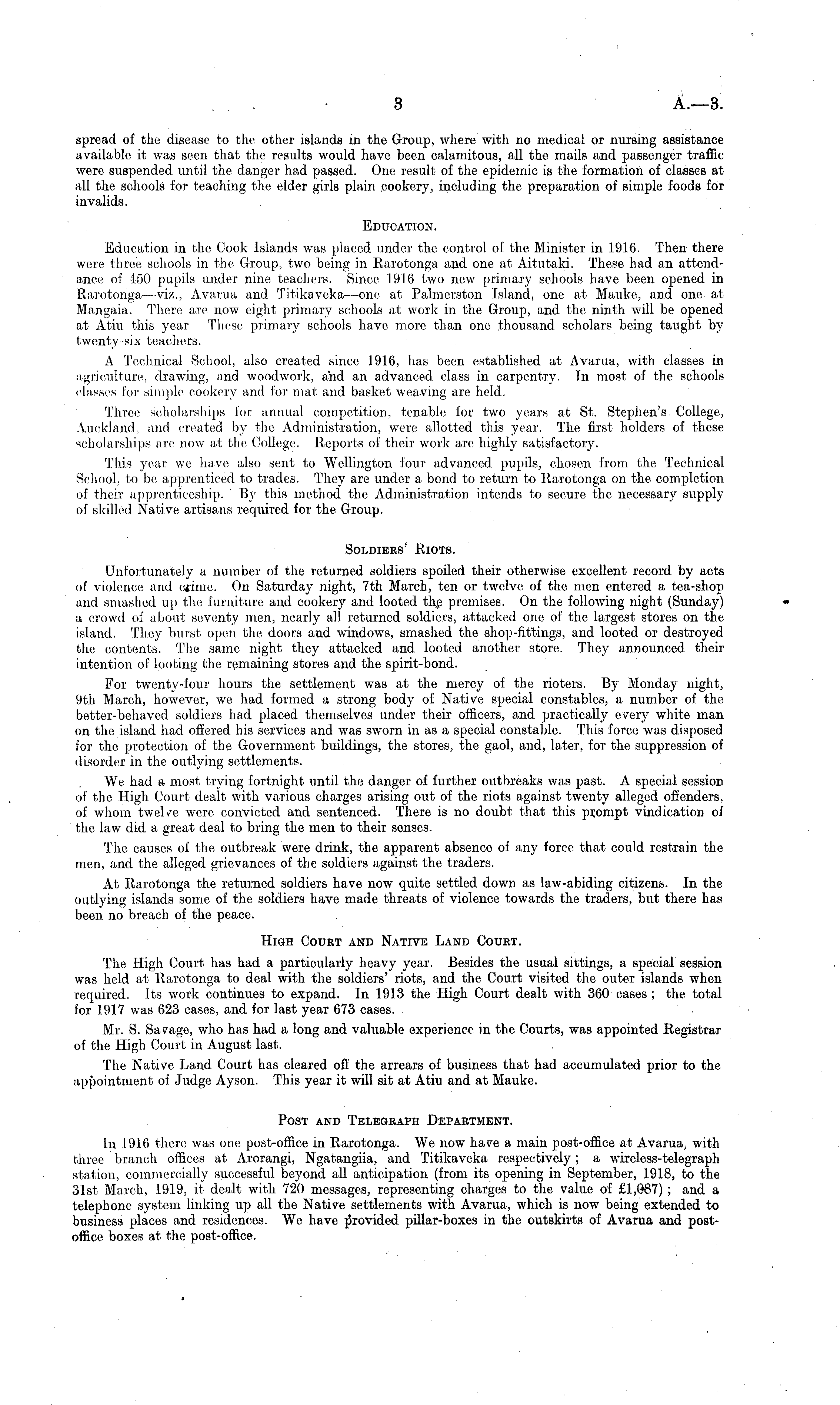 spread of the disease to the other islands in the Group, where with no medical or nursing assistance available it was seen that the results would have been calamitous, all the mails and passenger traffic were suspended until the danger had passed. One result of the epidemic is the formation of classes at all the schools for teaching the elder girls plain cookery, including the preparation of simple foods for invalids. Education. Education in the Cook islands was placed under the control of the Minister in 1916. Then there were three schools in the Group, two being in Rarotonga and one at Aitutaki. These had an attendance of 450 pupils under nine teachers. Since 1916 two new primary schools have been opened in Rarotonga —viz., Avarua and Titikaveka—one at Palmcrston Island, one at Mauke, and one at Mangaia. There are now eight primary schools at work in the Group, and the ninth will be opened at Atiu this year These primary schools have more than one .thousand scholars being taught by twenty-six teachers. A Technical School, also created since 1916, has been established at Avarua, with classes in agriculture, drawing, and woodwork, and an advanced class in carpentry. Tn most of the schools classes for simple cookery and for mat and basket weaving are held. Three scholarships for annual competition, tenable for two years at St. Stephen's College, Auckland, and created by the Administration, were allotted this year. The first holders of these scholarships are now at the College. Reports of their work are highly satisfactory. This year we have also sent to Wellington four advanced pupils, chosen from the Technical School, to be apprenticed to trades. They are under a bond to return to Rarotonga on the completion of their apprenticeship. By this method the Administration intends to secure the necessary supply of skilled Native artisans required for the Group. Soldiers' Riots. Unfortunately a number of the returned soldiers spoiled their otherwise excellent record by acts of violence and cjime. On Saturday night, 7th March, ten or twelve of the men entered a tea-shop and smashed up the furniture and cookery and looted the premises. On the following night (Sunday) • a crowd of about seventy men, nearly all returned soldiers, attacked one of the largest stores on the island. They burst open the doors and windows, smashed the shop-fittings, and looted or destroyed the contents. The same night they attacked and looted another store. They announced their intention of looting the remaining stores and the spirit-bond. For twenty-four hours the settlement was at the mercy of the rioters. By Monday night, 9th March, however, we had formed a strong body of Native special constables, a number of the better-behaved soldiers had placed themselves under their officers, and practically every white man on the island had offered his services and was sworn in as a special constable. This force was disposed for the protection of the Government buildings, the stores, the gaol, and, later, for the suppression of disorder in the outlying settlements. We had a most trying fortnight until the danger of further outbreaks was past. A special session of the High Court dealt with various charges arising out of the riots against twenty alleged offenders, of whom twelve were convicted and sentenced. There is no doubt that this prompt vindication of the law did a great deal to bring the men to their senses. The causes of the outbreak were drink, the apparent absence of any force that could restrain the men, and the alleged grievances of the soldiers against the traders. At Rarotonga the returned soldiers have now quite settled down as law-abiding citizens. In the outlying islands some of the soldiers have made threats of violence towards the traders, but there has been no breach of the peace. High Court and Native Land Court. The High Court has had a particularly heavy year. Besides the usual sittings, a special session was held at Rarotonga to deal with the soldiers' riots, and the Court visited the outer islands when required. Its work continues to expand. In 1913 the High Court dealt with 360 cases ; the total for 1917 was 623 cases, and for last year 673 cases. Mr. S. Savage, who has had a long and valuable experience in the Courts, was appointed Registrar of the High Court in August last. The Native Land Court has cleared off the arrears of business that had accumulated prior to the appointment of Judge Ayson. This year it will sit at Atiu and at Mauke. Post and Telegraph Department. In 1916 there was one post-office in Rarotonga. We now have a main post-office at Avarua, with three branch offices at Arorangi, Ngataugiia, and Titikaveka respectively; a wireless-telegraph station, commercially successful beyond all anticipation (from its opening in September, 1918, to the 31st March, 1919, it dealt with 720 messages, representing charges to the value of £1,087) ; and a telephone system linking up all the Native settlements with Avarua, which is now being extended to business places and residences. We have provided pillar-boxes in the outskirts of Avarua and postoffice boxes at the post-office.