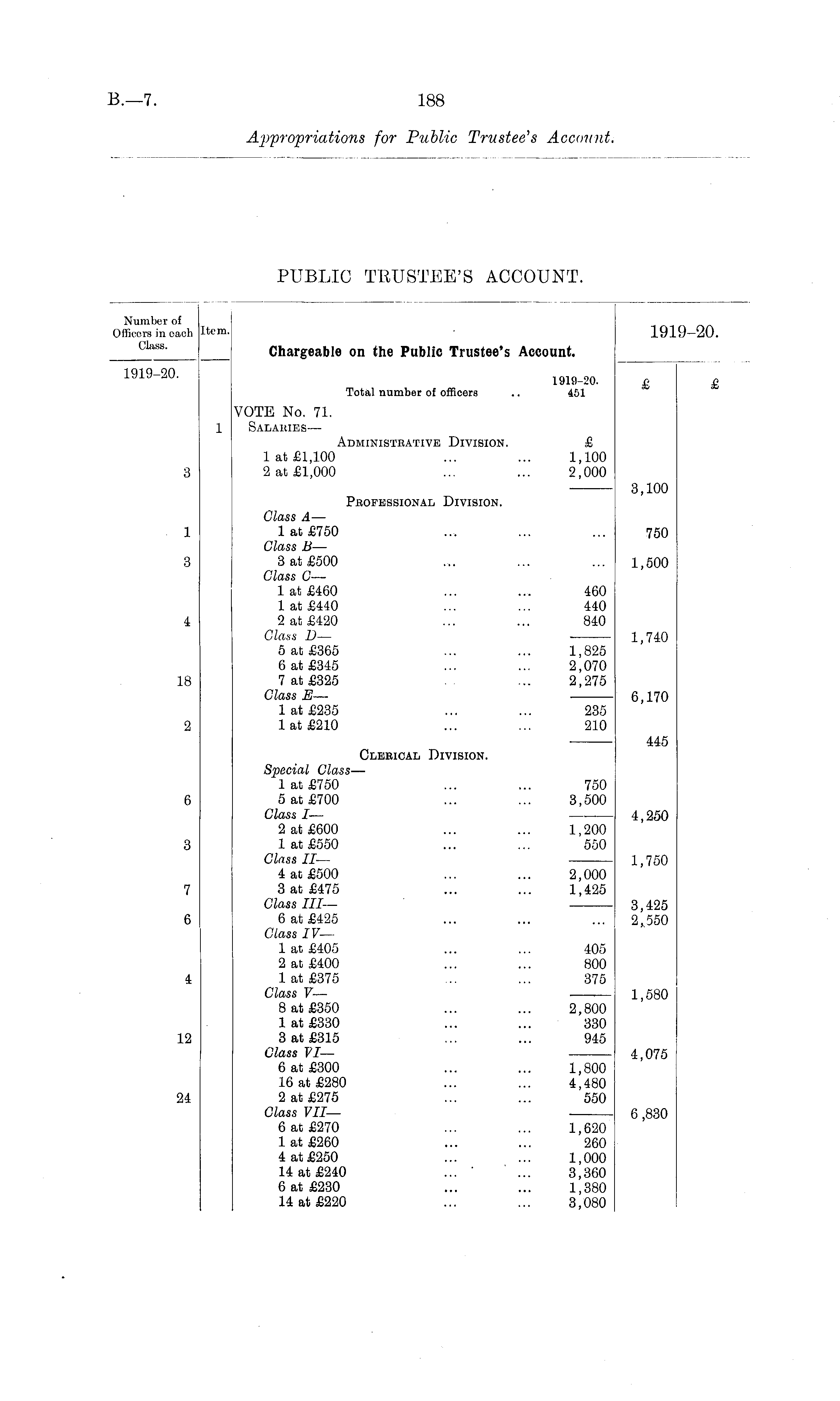 Number of Officers in each Class. Item. 19 9-20. Chargeable on the Public Trustee's Account. 1919-20. 1919-20. Total number of officers .. 451 e VOTE No. 71. Salaries— Administrative Division. £ lat £1,100 ... ... 1,100 2 at £1,000 ... ... 2,000 3 Professional Division. 3,100 1 3 Class A — 1 at £750 Class B — 3 at £500 Class C — lat £460 ... ... 460 lat £440 ... ... 440 2 at £420 ... ... 840 Class D— 5 at £365 ... ... 1,825 Gat £345 ... ... 2,070 7 at £325 ... 2,275 Class E — 1 at £235 ... ... 235 lat £210 ... ... 210 750 1,500 1,740 18 0,170 2 445 Clerical Division. 0 3 7 0 4 Special Class — lat £750 ... ... 750 5 at £700 ... ... 3,500 Class I — —■ 2 at £600 ... ... 1,200 lat £550 ... ... 550 Class II— 4 at £500 ... ... 2,000 3 at £475 ... ... 1,425 Class III — 6 at £425 Class IV— lat £405 ... ... 405 2 at £400 ... ... 800 lat £375 ... ... 375 Class V— 8 at £350 ... ... 2,800 lat £330 ... ... 330 3 at £315 ... ... 945 Class VI — ■ 6 at £300 ... ... 1,800 16 at £280 ... ... 4,480 2 at £275 ... ... 550 Class VII— 6 at £270 ... ... 1,620 1 at £260 ... ... 260 4 at £250 ... ... 1,000 14 at £240 ... ... 3,360 6 at £230 ... ... 1,380 14 at £220 ... ... 3,080 4,250 1,750 3,425 2,550 1,580 12 4,075 24 6,830
