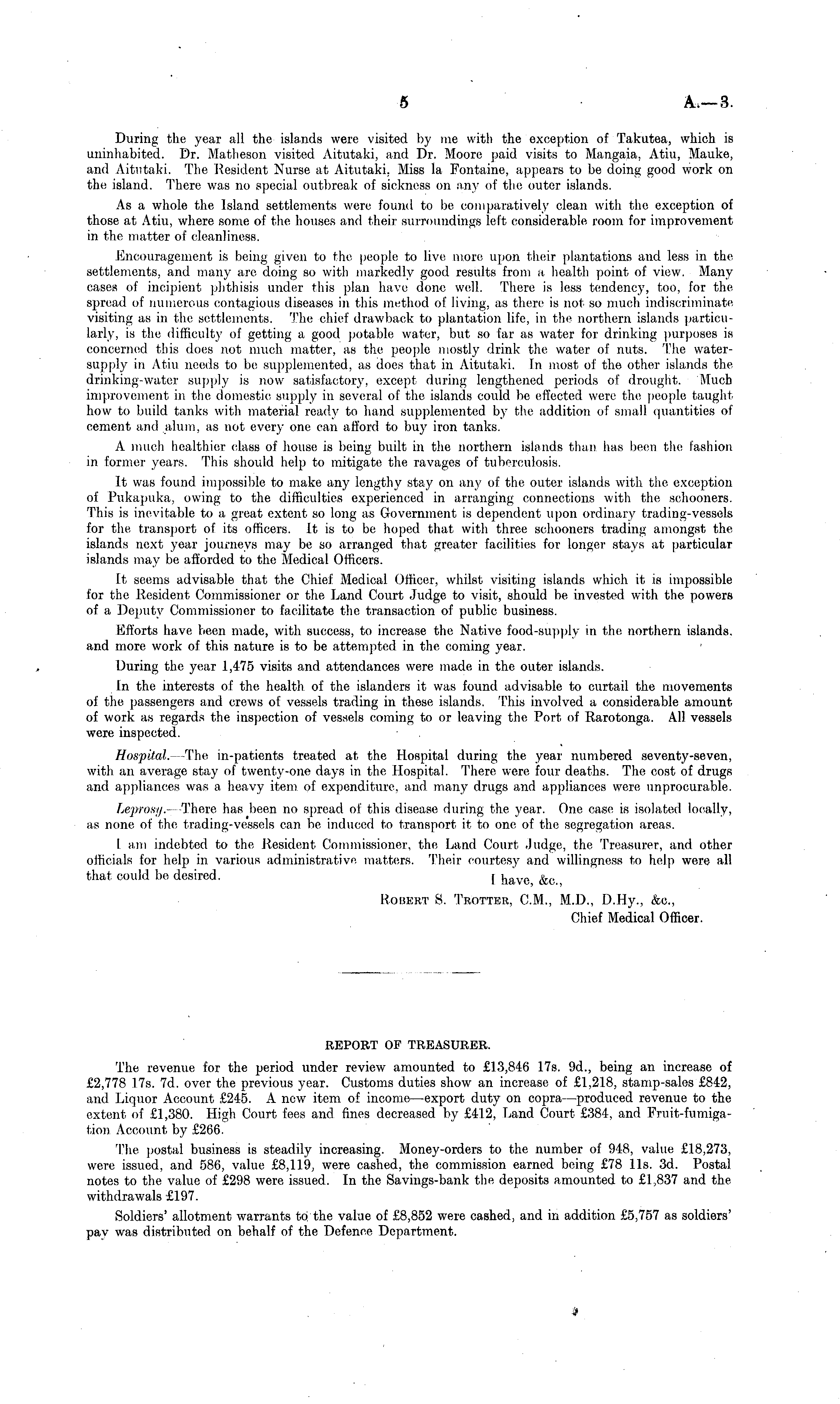 During the year all the islands were visited by me with the exception of Takutea, which is uninhabited. Dr. Matheson visited Aitutaki, and Dr. Moore paid visits to Mangaia, Atiu, Mauke, and Aitutaki. The Resident Nurse at Aitutaki, Miss la Fontaine, appears to be doing good work on the island. There was no special outbreak of sickness on any of the outer islands. As a whole the Island settlements were found to be comparatively clean with the exception of those at Atiu, where some of the houses and their surroundings left considerable room for improvement in the matter of cleanliness. Encouragement is being given to the people to live more upon their plantations and less in the settlements, and many are doing so with markedly good results from a health point of view. Many cases of incipient phthisis under this plan have done well. There is less tendency, too, for the spread of numerous contagious diseases in this method of living, as there is not so much indiscriminate visiting as in the settlements. The chief drawback to plantation life, in the northern islands particularly, is the difficult)' of getting a good potable water, but so far as water for drinking purposes is concerned this does not much matter, as the people mostly drink the water of nuts. The watersupply in Atiu needs to be supplemented, as does that in Aitutaki. In most of the other islands the drinking-water supply is now satisfactory, except during lengthened periods of drought. Much improvement in the domestic supply in several of the islands could be effected were the people taught how to build tanks with material ready to hand supplemented by the addition of small quantities of cement and alum, as not every one can afford to buy iron tanks. A much healthier class of house is being built in the northern islands than has been the fashion in former years. This should help to mitigate the ravages of tuberculosis. It was found impossible to make any lengthy stay on an}' of the outer islands with the exception of Pukapuka, owing to the difficulties experienced in arranging connections with the schooners. This is inevitable to a great extent so long as Government is dependent upon ordinary trading-vessels for the transport of its officers. It is to be hoped that with three schooners trading amongst the islands next year journeys may be so arranged that greater facilities for longer stays at particular islands may be afforded to the Medical Officers. It seems advisable that the Chief Medical Officer, whilst visiting islands which it is impossible for the Resident Commissioner or the Land Court Judge to visit, should be invested with the powers of a Deputy Commissioner to facilitate the transaction of public business. Efforts have been made, with success, to increase the Native food-supply in the northern islands, and more work of this nature is to be attempted in the coming year. During the year 1,475 visits and attendances were made in the outer islands. In the interests of the health of the islanders it was found advisable to curtail the movements of the passengers and crews of vessels trading in these islands. This involved a considerable amount of work as regards the inspection of vessels coming to or leaving the. Port of Rarotonga. All vessels were inspected. Hospital. —The in-patients treated at the Hospital during the year numbered seventy-seven, with an average stay of twenty-one days in the Hospital. There were four deaths. The cost of drugs and appliances was a heavy item of expenditure, and many drugs and appliances were unprocurable. Leprosy .—There has been no spread of this disease during the year. One case is isolated locally, as none of the trading-vessels can be induced to transport it to one of the segregation areas. I am indebted to the Resident Commissioner, the Land Court Judge, the Treasurer, and other officials for help in various administrative, matters. Their courtesy and willingness to help were all that could be desired. [ & c Robert S. Trotter, CM., M.D., D.Hy., &c, Chief Medical Officer.