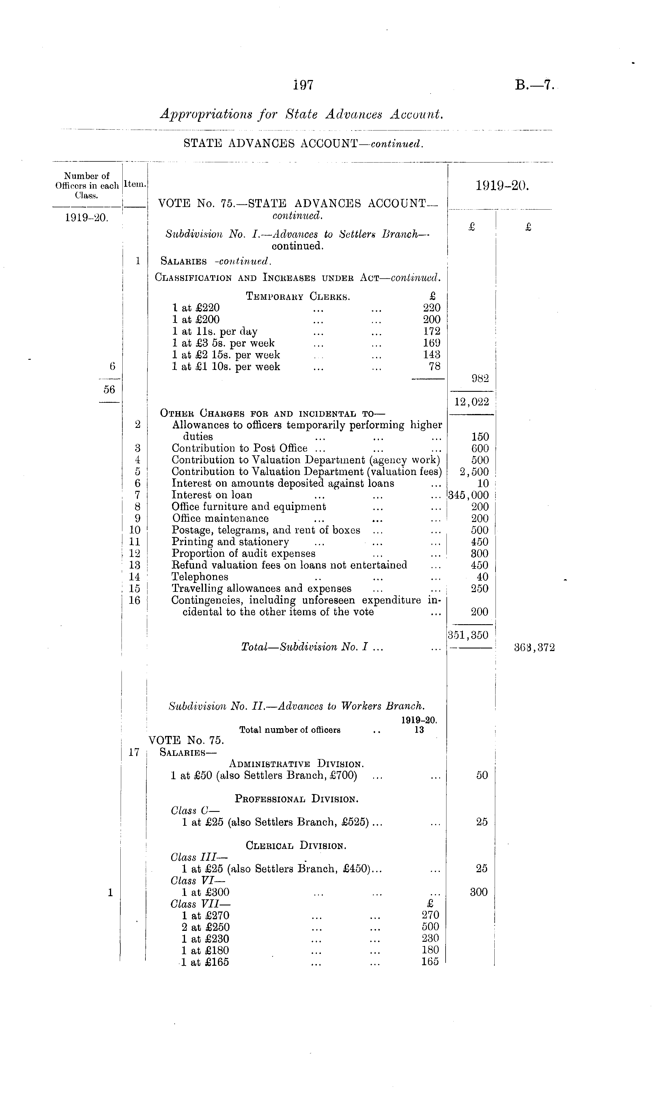 Number of Officers in each Item. Class. 1919-20. VOTE No. 75.—STATE ADVANCES ACCOUNT— continued. 191 1919-20. £ ! £ Subdivision No. I. — Advances to Settlers Branch — continued. £ Salaries -continued. Classification and Increases under Act— continued. Temporary Clerks. £ lat £220 ... ... 220 lat £200 ... ... 200 1 at lis. per day ... ... 172 1 at £3 5s. per week ... ... 169 1 at £2 15s. per week ... 143 1 at £1 10s. per week ... ... 78 6 982 56 12,022 2 3 4 5 6 7 8 9 10 11 12 13 14 15 16 Other Charges for and incidental to — Allowances to officers temporarily performing higher duties Contribution to Post Office ... Contribution to Valuation Department (agency work) Contribution to Valuation Department (valuation fees) Interest on amouuts deposited against loans Interest on loan ... ... ... i Office furniture and equipment Office maintenance Postage, telegrams, and rent of boxes ... Printing and stationery Proportion of audit expenses Refund valuation fees on loans not entertained Telephones Travelling allowances and expenses ... ... Contingencies, including unforeseen expenditure incidental to the other items of the vote 150 600 500 2,500 10 345,000 200 200 500 450 300 450 40 250 200 Total — Subdivision No. I ... 351,350 303,372 Subdivision No. II. — Advances to Workers Branch. 1919-20. Total number of officers .. 13 VOTE No. 75. Salaries— 17 Administrative Division. 1 at £50 (also Settlers Branch, £700) ... 50 50 Professional Division. Glass C— 1 at £25 (also Settlers Branch, £525)... 25 25 Clerical Division. Class III— 1 at £25 (also Settlers Branch, £450)... Class VI— lat £300 Class VII— £ lat £270 ... ... 270 2 at £250 ... ... 500 lat £230 ... ... 230 lat £180 ... ... 180 1 at £165 ... ... 165 25 300 25 300