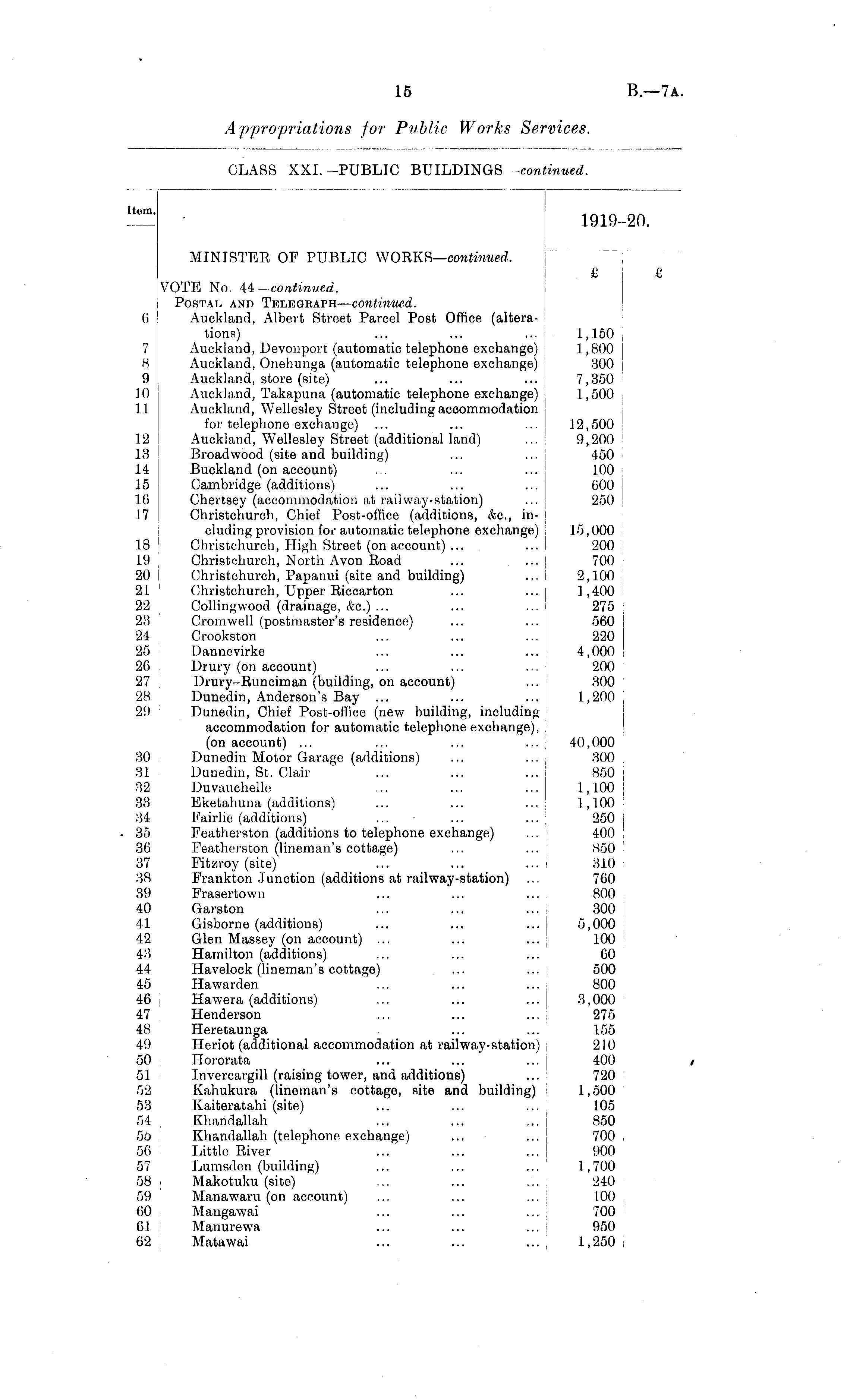 torn. 1919-20. MINISTER OF PUBLIC \NORKS—continued. £ £ VOTE No, 44— continued. Postal and Telegraph— continued. 6 Auckland, Albert Street Parcel Post Office (alterations) ... ... ... 7 Auckland, Devonport (automatic telephone exchange) 8 Auckland, Onehunga (automatic telephone exchange) 9 Auckland, store (site) 10 Auckland, Takapuna (automatic telephone exchange) 11 Auckland, Wellesley Street (including accommodation for telephone exchange) ... ... ... 12 Auckland, Wellesley Street (additional land) ... j 13 Broadwood (site and building) 14 Buckland (on account) 15 Cambridge (additions) 16 Chertsey (accommodation at rail way-station) 17 Christchurch, Chief Post-office (additions, &c, ineluding provision for automatic telephone exchange) 18 Christchurch, High Street (on account) ... ... I 19 Christchurch, North Avon Road ... ... j 20 Christchurch, Papanui (site and building) ... i 21 ! Christchurch, Upper Ricearton 22 , Collingwood (drainage, kc.) ... 23 Cromwell (postmaster's residence) 24 | Crookston 25 Dannevirke 26 Drury (on account) 27 1 Drury-Runciman (building, on account) 28 Dunedin, Anderson's Bay ... 29 Dunedin, Chief Post-office (new building, including accommodation for automatic telephone exchange), ; (on account) ... ... ... ... j 30 , Dunedin Motor Garage (additions) ... ... 31 Dunedin, St. Clair 32 Duvauchelle 33 Eketahuna (additions) 34 Fairlie (additions) 35 Featherston (additions to telephone exchange) ... j 36 Featherston (lineman's cottage) ... ... | 37 Fitzroy (site) ... ... ... i 38 Frankton Junction (additions at railway-station) 39 Frasertown 40 Garston 41 Gisborne (additions) 42 Glen Massey (on account) ... 43 Hamilton (additions) 44 Havelock (lineman's cottage) 45 Hawarden 46 | Hawera (additions) 47 Henderson .:. 48 Heretaunga 49 Heriot (additional accommodation at railway-station) 50 Hororata ... ... ... 51 i Invercargill (raising tower, and additions) 52 Kahukura (lineman's cottage, site and building) 53 Kaiteratahi (site) 54 Khandallah 55 j Khandallah (telephone exchange) 56 . Little River 57 Lumsden (building) 58 i Makotuku (site) 59 Manawaru (on account) 60 , Mangawai 61 I Manurewa 62 | Matawai L.150 1,800 300 7,350 1,500 12,500 9,200 450 100 600 250 15,000 ! 200 700 2,100 1,400 ; 275 560 220 4,000 200 300 1,200 40,000 300 850 1,100 1,100 250 400 850 310 760 800 300 5,000 100 60 500 800 3,000 275 155 210 400 720 1,500 105 850 700 900 1,700 240 100 700 950 1,250 i /