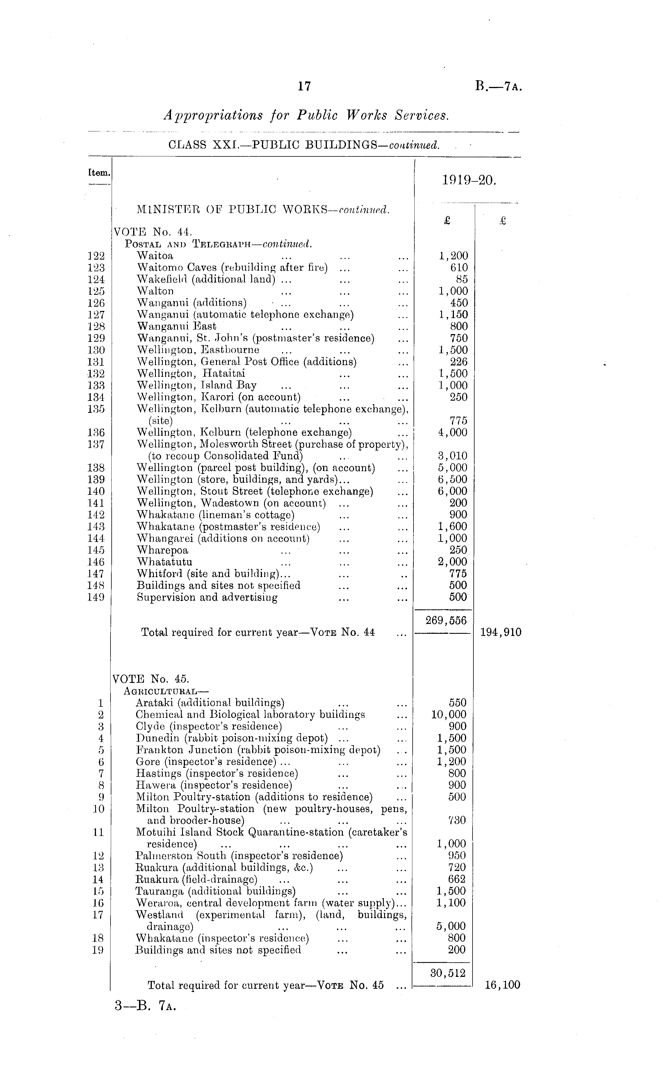 Item. 1919-20. MINISTER OF PUBLIC WORKS -continued. VOTE No. 44. Postal and Telegraph— continued. Waitoa Waitomo Caves (rebuilding after tire) Wakefield (additional land) ... Walton Wanganui (additions) ... Wanganui (automatic telephone exchange) Wanganui East Wanganui, St. John's (postmaster's residence) Wellington, Eastbourne Wellington, General Post Office (additions) Wellington, Hataitai Wellington, Island Bay Wellington, Karori (on account) Wellington, Kelburn (automatic telephone exchange), (site) Wellington, Kelburn (telephone exchange) Wellington, Molesworth Street (purchase of property), (to recoup Consolidated Fund) Wellington (parcel post building), (on account) Wellington (store, buildings, and yards)... Wellington, Stout Street (telephone exchange) Wellington, Wadestown (on account) Whakatane (lineman's cottage) Whakatane (postmaster's residence) Whangarei (additions on account) Wharepoa Whatatutu Whitford (site and building)... Buildings and sites not specified Supervision and advertising £ £ 122 123 124 125 126 127 128 129 130 131 132 133 134 135 1,200 61.0 85 1,000 450 1,150 800 750 1,500 226 1,500 1,000 250 136 137 775 4,000 138 139 140 141 142 143 144 145 146 147 148 149 3,010 5,000 6,500 6,000 200 900 1,600 1,000 250 2,000 775 500 500 Total required for current year—Vote No. 44 269,556 194 194,910 1 2 3 4 5 6 7 8 9 10 VOTE No. 45. Agricultural— Arataki (additional buildings) Chemical and Biological laboratory buildings Clyde (inspector's residence) Dunedin (rabbit poison-mixing depot) ... Frankton Junction (rabbit poison-mixing depot) Gore (inspector's residence) ... Hastings (inspector's residence) Hawera (inspector's residence) Milton Poultry-station (additions to residence) Milton Poultry-station (new poultry-houses, pens, and brooder-house) Motuihi Island Stock Quarantine-station (caretaker's residence) Palmerston South (inspector's residence) Ruakura (additional buildings, &c.) Ruakura (field-drainage) Tauranga (additional buildings) Weraroa, central development farm (water supply)... Westland (experimental farm), (land, buildings, drainage) Whakatane (inspector's residence) Buildings and sites not specified 550 10,000 900 1,500 1,500 1,200 800 900 500 730 11 1,000 950 720 662 1,500 1,100 12 13 14 15 16 17 18 19 5,000 800 200 Total required for current year—Vote No. 45 ... 30,512 16,100
