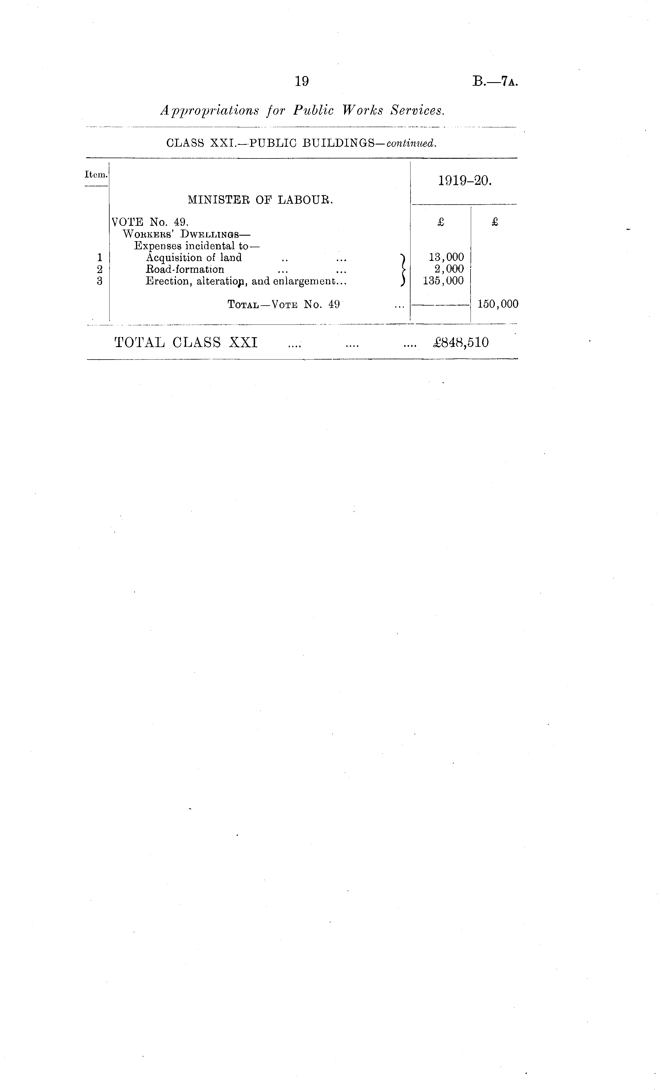 item. 1919-20. MINISTER OF LABOUR. VOTE No. 49. Workers' Dwellings— Expenses incidental to— Acquisition of land Road-formation Erection, alteration, and enlargement... j £ 13,000 2,000 135,000 l 2 3 Total—Vote No. 49 150,000 TOTAL CLASS XXI £848,510