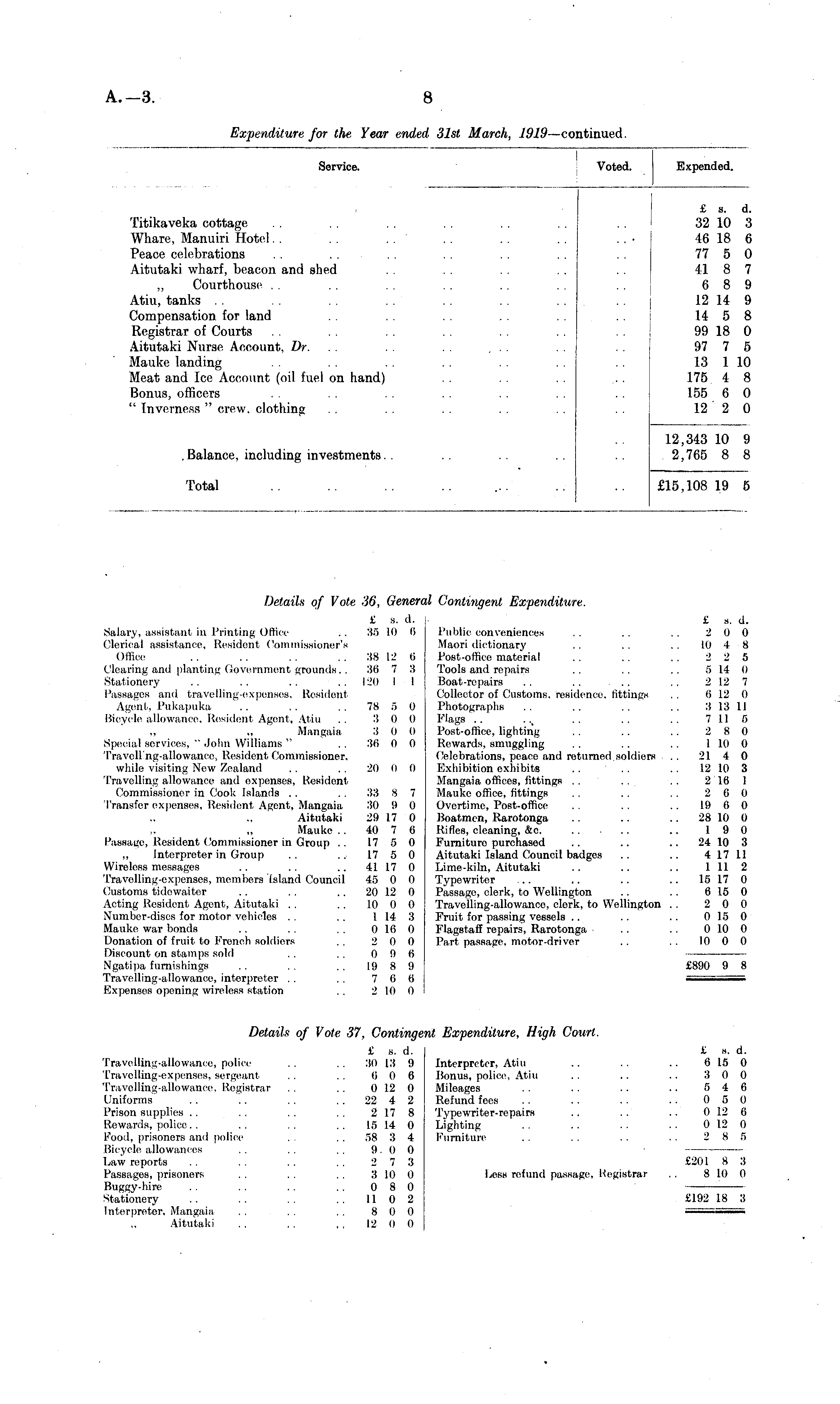 Service. j Voted. Expended. Titikaveka cottage Whare, Manuiri Hotel. . Peace celebrations .. Aitutaki wharf, beacon and shed ,, Courthouse Atiu, tanks Compensation for land Registrar of Courts Aitutaki Nurse Account, Dr. Mauke landing Meat and Ice Account (oil fuel on hand) Bonus, officers " Inverness " crew, clothing £ s. d. 32 10 3 46 18 6 77 5 0 41 8 7 6 8 9 12 14 9 14 5 8 99 18 0 97 7 5 13 1 10 175 4 8 155 6 0 12 2 0 .Balance, including investments.. 12,343 10 9 2,765 8 8 Total £15,108 19 5