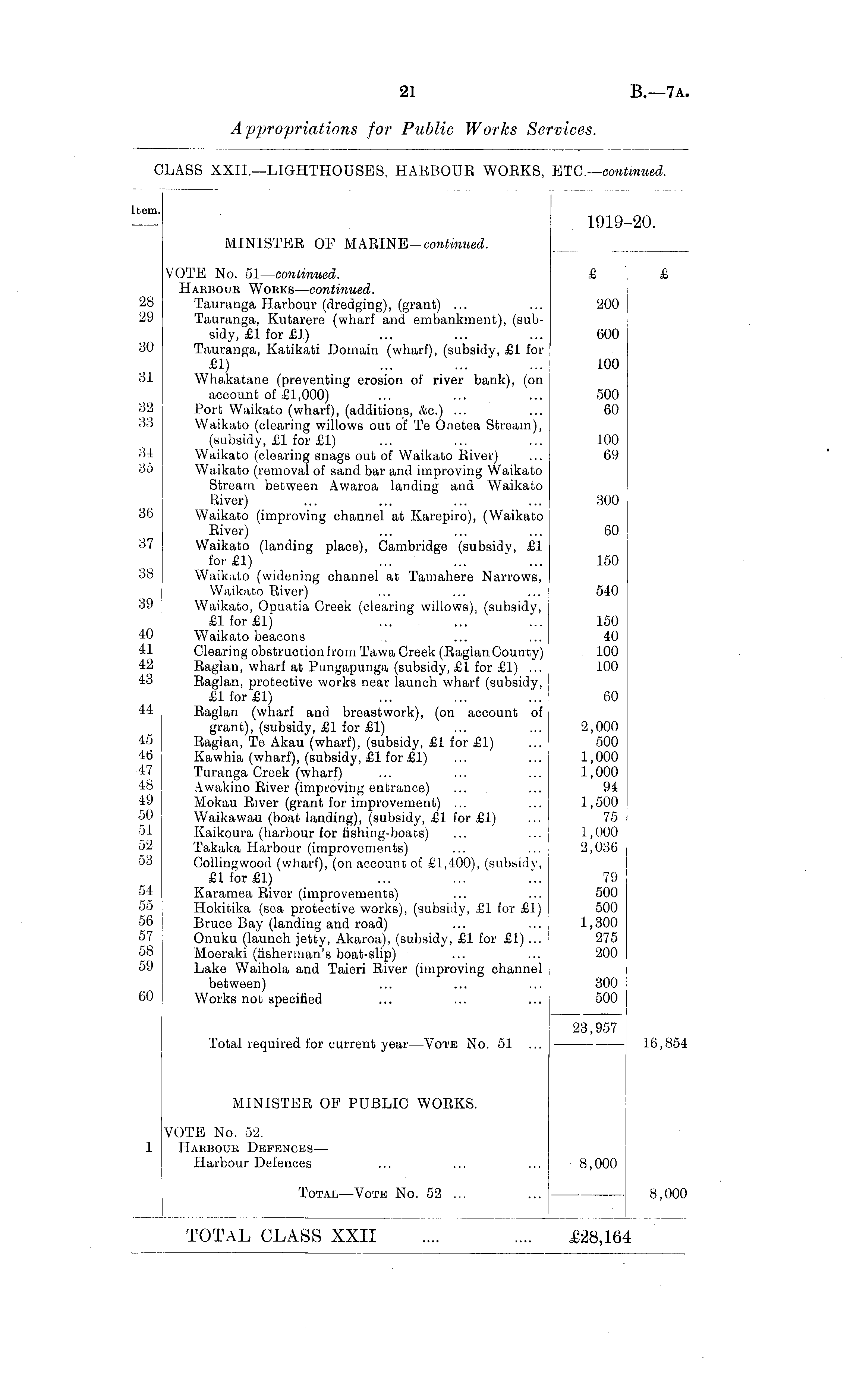 tern. 1919-20. MINISTER OF MARINE— continued. I 28 29 30 31 32 33 34 35 30 37 38 39 40 11 42 43 VOTE No. 51— continued. Hardour Works— continued. Tauranga Harbour (dredging), (grant) ... Tauranga, Kutarere (wharf and embankment), (subsidy, £1 for £1) Tauranga, Katikati Domain (wharf), (subsidy, £1 for £1) Whakatane (preventing erosion of river bank), (on account of £1,000) Port Waikato (wharf), (additions, kc.) ... Waikato (clearing willows out of Te Onetea Stream), (subsidy, £1 for £1) Waikato (clearing snags out of Waikato River) Waikato (removal of sand bar and improving Waikato Stream between Awaroa landing and Waikato River) Waikato (improving channel at Karepiro), (Waikato River) Waikato (landing place), Cambridge (subsidy, £1 for£l) Waikato (widening channel at Tamahere Narrows, Waikato River) Waikato, Opuatia Creek (clearing willows), (subsidy, £lfor£l) Waikato beacons Clearing obstruction from Ta wa Creek (Raglan County) Raglan, wharf at Pungapunga (subsidy, £1 for £1) ... Raglan, protective works near launch wharf (subsidy, £lfor£l) Raglan (wharf and breastwork), (on account of grant), (subsidy, £1 for £1) Raglan, Te Akau (wharf), (subsidy, £1 for £1) Kawhia (wharf), (subsidy, £1 for £1) Turanga Creek (wharf) Awakino River (improving entrance) Mokau River (grant for improvement) ... Waikawau (boat landing), (subsidy, £1 for £1) Kaikoura (harbour for fishing-boats) Takaka Harbour (improvements) Collingwood (wharf), (on account of £1,400), (subsidv, £lfor£l) Karamea River (improvements) Hokitika (sea protective works), (subsidy, £1 for £1) Bruce Bay (landing and road) Onuku (launch jetty, Akaroa), (subsidy, £1 for £1) ... Moeraki (fisherman's boat-slip) Lake Waihola and Taieri River (improving channel between) Works not specified £ £ 200 600 100 500 60 100 69 300 60 150 540 150 40 100 100 44 60 45 46 17 IS I'.) 50 51 52 53 2,000 500 1,000 1,000 94 1,500 75 1,000 2,036 .'ll 55 56 57 58 59 79 500 500 1,300 275 200 60 300 500 Total required for current year—Vote No. 51 23,957 MINISTER OF PUBLIC WORKS. 16,854 VOTE No. 52. Harbour Defences— Harbour Defences 8,000 8,000 8,000 Total—Vote No. 52 ... TOTAL CLASS XXII £28,16
