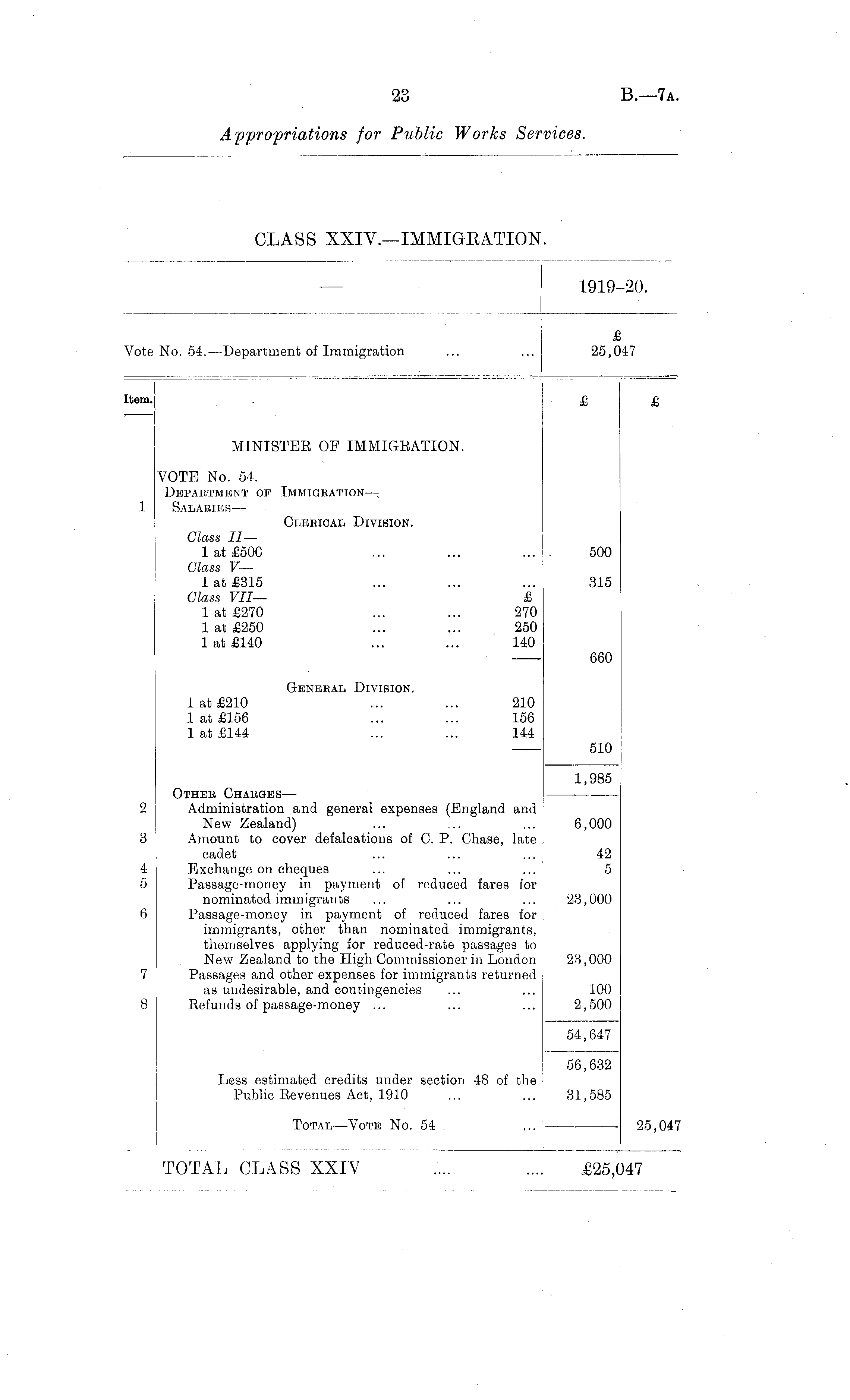 1919-20. iyiv; ote No. 54. —Department of Immigration 25, 147 Item. lem. £ £ MINISTER OF IMMIGRATION. VOTE No. 54. Department op Immigration— ; 1 Salaries— Clerical Division. Class II — 1 at £500 ... ... ... . Class V— lat £315 Class VII— £ 1 at £270 ... ... 270 1 at £250 ... ... 250 lat £140 ... ... 140 500 315 500 315 660 660 General Division. lat £210 ... ... 210 lat £156 ... ... 156 1 at £144 ... ... 144 510 510 Other Charges— 2 Administration and general expenses (England and New Zealand) ... ... ... I 3 Amount to cover defalcations of C. P. Chase, late cadet ... 4 Exchange on cheques 5 Passage-money in payment of reduced fares for nominated immigrants ... ... ... % 6 Passage-money in payment of reduced fares for immigrants, other than nominated immigrants, themselves applying for reduced-rate passages to New Zealand to the High Commissioner in London % 7 Passages and other expenses for immigrants returned as undesirable, and contingencies 8 Refunds of passage-money ... 5< 1,985 1,985 6,000 42 5 !3,000 13,000 100 2,500 i4,647 2 6,000 3 4 5 42 5 6 23,000 23,000 7 100 2,500 8 54,647 51 Less estimated credits under section 48 of the Public Revenues Act, 1910 ... ... 3 56,632 .6,632 ! 1,585 31,585 Total —Vote No. 54 ... — 25,04' TOTAL CLASS XXIV £25,047