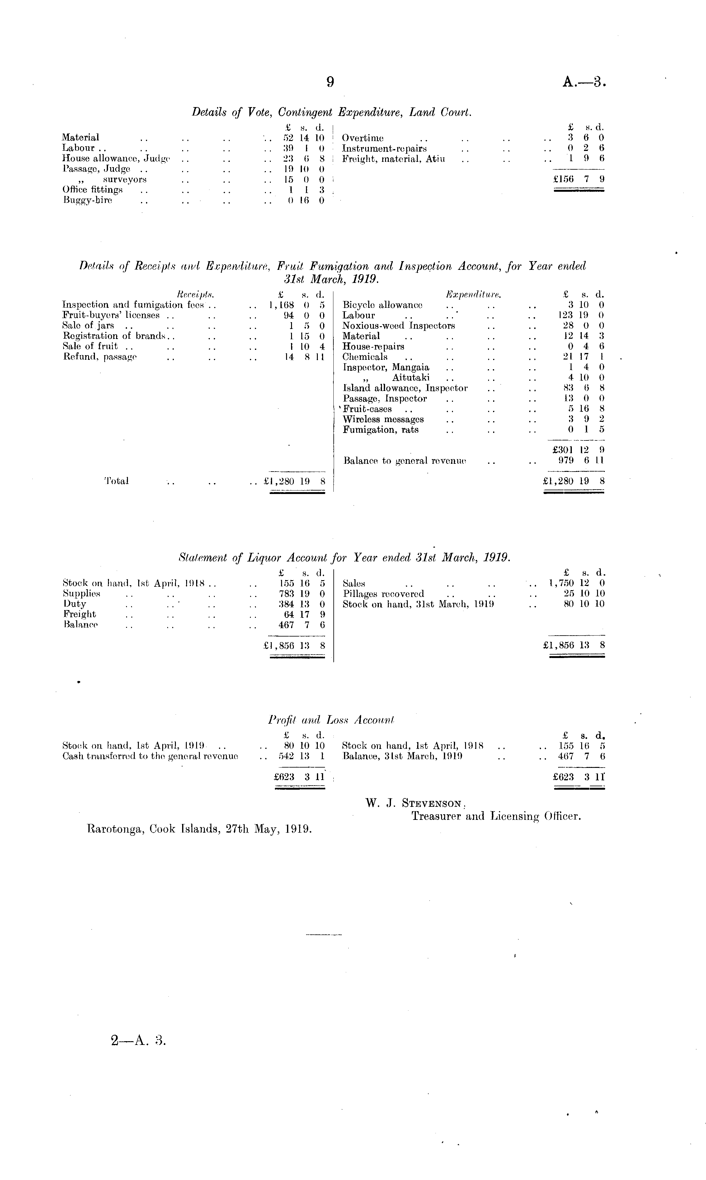 Details of Vote, Contingent Expenditure, Land Court. £ s. d. £ s. d. Material .. .. .. '.. 52 .14 10 Overtime .. .. . . ..360 Labour .. .. .. .. . . 39 1 0 Instrument-repairs .. .. 0 2 6 House allowance, Judge .. .. 23 6 8 Freight, material, Atiu .. . . .. 19 6 Passage, Judge .. .. .. 19 10 0 „ ' surveyors .. .. .. 15 0 0 i £156 7 9 Office fittings .. . . - .. .. I 1 3 ! ■ Buggy-hire .. .. • .. . . 016 0• ■ Details of Receipts awl Expenditure, Fruit Fumigation and Inspection Account, for Year ended 31st March, 1919. Receipts. £ s. d. Expenditure. £ s. d. Inspection and fumigation foos .. .. 1,168 0 5 Bicycle allowance .. .. .. 310 0 Fruit-buyers'licenses .. .. .. 94 0 0 Labour .. ..' .. .. 123 19 0 Salo of jars .. . . .. .. 15 0 Noxious-weed Inspectors .. .. 28 0 0 Registration of brands.. .. .. 115 0 Material .. .. .. .. 12 14 3 Sale of fruit .. .. .. .. 110 4 House-repairs .. .. .. 0 4 6 Refund, passage .. .. .. 14 811 Chemicals .. .. .. .. 21 17 I Inspector, Mangaia .. .. .. 14 0 Aitutaki . . .. .. 4 10 0 Island allowance, Inspector .. . . 83 6 8 Passage, Inspector .. .. .. 13 0 0 'Fruifc-casos .. .. .. .. 516 8 Wireless messages .. .. . . 3 9 2 Fumigation, rats .. . . . . 0 15 £301 12 9 Balance to general revenue . . .. 979 6 11 Total .. .. .. £1,280 19 8 £1,280 19 8 Statement of Liquor Account for Year ended 31st March, 1919. £ s. d. £ s. d. Stock on hand, Ist April, 1918 . . .. 155 16 5 Sales .. .. .. .. 1,750 12 0 Supplies . . .. . . .. 783 19 0 Pillages recovered . . .. .. 25 10 10 Duty . . .. ' . . . . 384 13 0 Stock on hand, 31st March, 1919 .. 80 10 10 Freight .. . . .. . . 64 17 9 Balance . . ~ . . .. 467 7 6 £1,856 13 8 £1,856 13 8 Profit and Loss Account £ s. d. i £ s. d. Stock on hand, Ist April, 1.91.9- .. .. 801.010 Stock on hand, Ist April, 1918 .. .. 15516 5 Cash transferred to the general rovenue .. 542 13 1 Balance, 31st March, 1919 .. .. 467 7 6 £623 3 11 | £623 3 11' W. J. Stevenson. Treasurer and Licensing Officer. Rarotonga, Cook Islands, 27th May, 1919. \ I