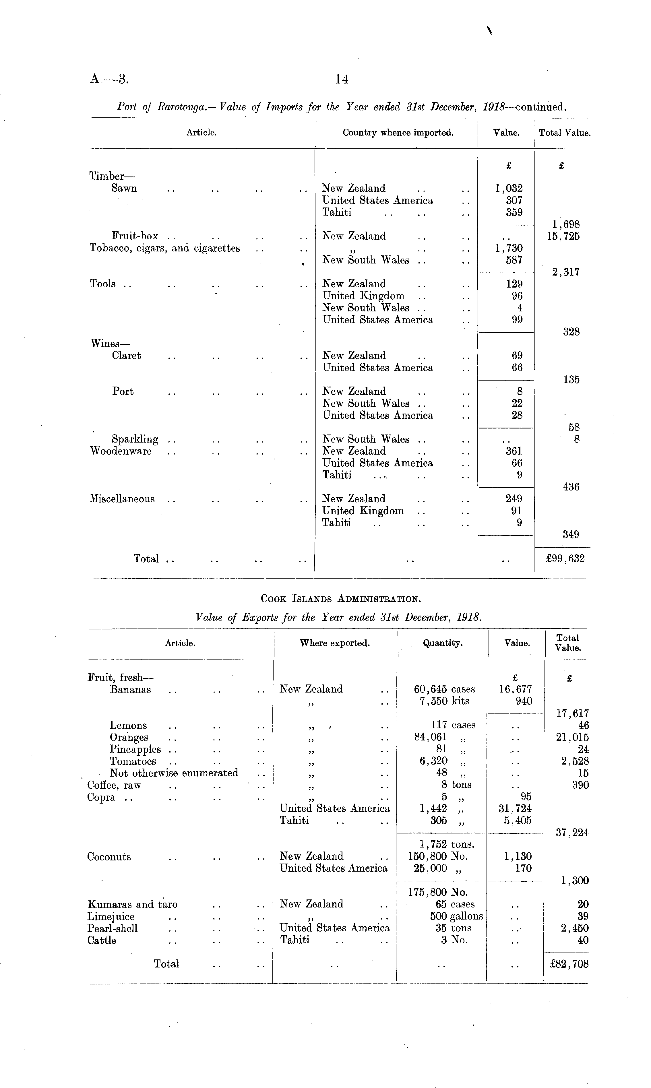 Article. Country whence imported. Value. Total Value. £ £ Timber— Sawn New Zealand United States America Tahiti 1,032 307 359 Fruit-box . . :., Tobacco, cigars, and cigarettes 1,698 15,725 New Zealand 1,730 587 New South Wales .. Tools New Zealand United Kingdom New South Wales .. United States America 129 96 4 99 2,317 Wines — Claret 328 New Zealand United States America 69 66 135 Port New Zealand New South Wales .. United States America 8 22 28 New South Wales . . New Zealand United States America Tahiti 58 8 Sparkling Woodenware 361 66 9 Miscellaneous New Zealand United Kingdom Tahiti 249 91 9 436 349 Total .. £99,632 Cook Isla: r DS Administration. Value of Exports for the Year ended 31st December, 191.8. Article. Where exported. Quantity. Value. Total Value. Fruit, fresh — Bananas New Zealand 60,645 cases 7,550 kits £ 16,677 940 £ Lemons Oranges Pineapples Tomatoes Not otherwise enumerated 117 cases 84,061 „ 81 „ 6,320 „ 48 „ 8 tons 5 „ J, 442 „ 305 „ 17,617 46 21,01.5 24 2,528 15 390 Coffee, raw « t Copra United States America Tahiti 95 31,724 5,405 Coconuts New Zealand United States America 1,752 tons. 150,800 No. 25,000 „ 37,224 1,130 170 1,300 Kumaras and taro Limejuice Pearl-shell Cattle New Zealand 175,800 No. 65 cases 500 gallons 35 tons 3 No. 20 39 2,450 40 United States America Tahiti Total £82,708