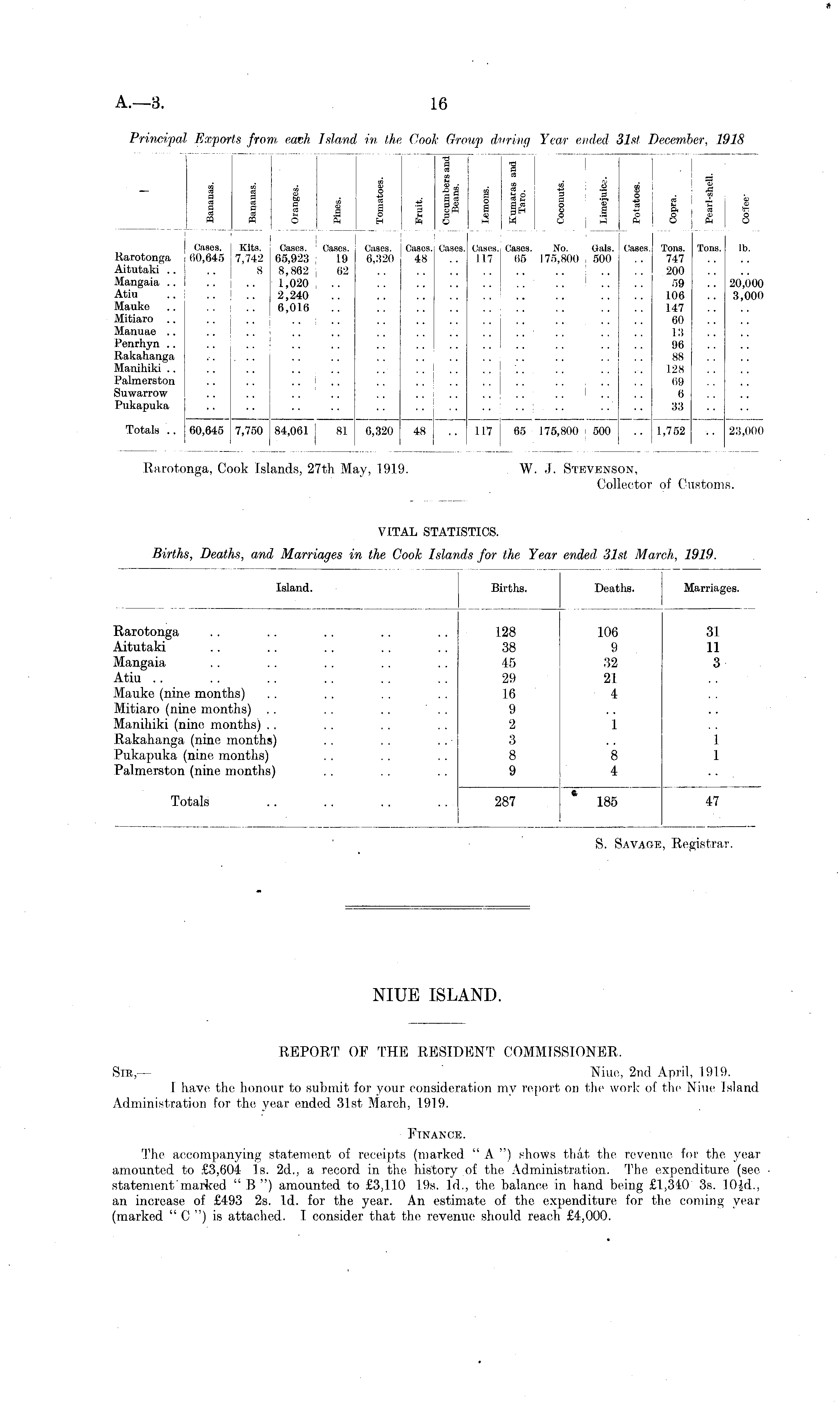 NIUE ISLAND. REPORT OF THE RESIDENT COMMISSIONER. Sir,— Nine, 2nd April, 1919. I have the honour to submit for your consideration my report on the work' of the Nine Island Administration for the year ended 31st March, 1919. Finance. The accompanying statement of receipts (marked " A ") shows that the revenue for the year amounted to £3,604 Is. 2d., a record in the history of the Administration. The expenditure (see statement'marked " B") amounted to £3,110 19s. Id., the balance in hand being £1,340 3s. 10id., an increase of £493 2s. Id. for the year. An estimate of the expenditure for the coming year (marked " C ".) is attached. I consider that the revenue; should reach £4,000.