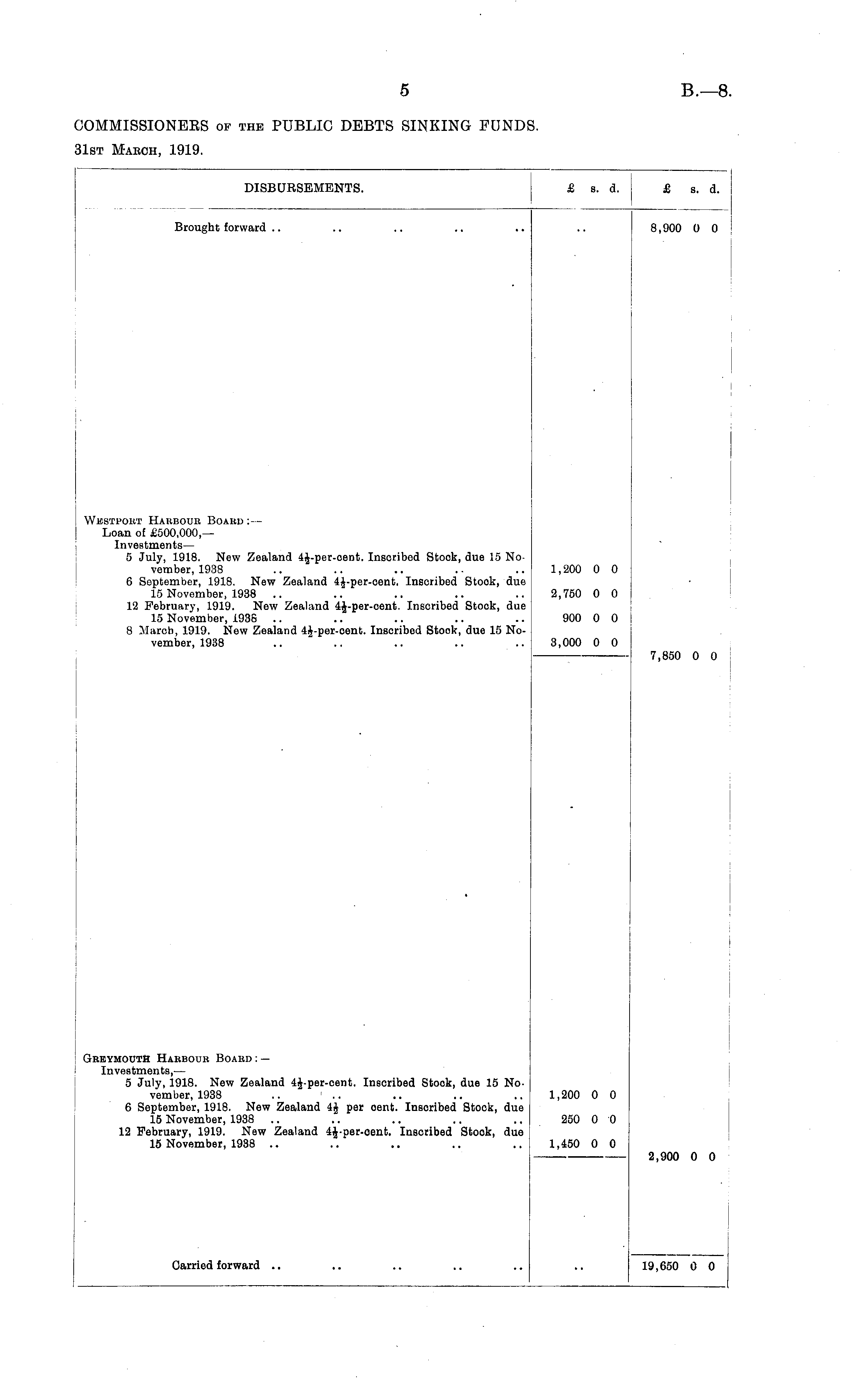 DISBURSEMENTS. £ s. d. £ s. d. Brought forward 8,900 0 0 Westport Harbour Board :— Loan of £500,000 — Investments— 5 July, 1918. New Zealand 4J-per-cent. Inscribed Stock, due 15 November, 1938 6 September, 1918. New Zealand 4J-per-cent. Inscribod Stock, duo 15 November, 1938 12 February, 1919. Now Zealand 4J-per-oent. Inscribed Stock, due 15 November, 1938 8 March, 1919. New Zealand Inscribed Stook, due 15 November, 1938 1,200 0 0 2,750 0 0 900 0 0 3,000 0 0 7,850 0 0 GreymoutH Harbour Board:— Investments, — 5 July, 1918. New Zealand 4J-per-oent. Insoribed Stook, due 15 November, 1938 .. .. 6 September, 1918. New Zealand 4J per oent. Insoribed Stock, due 15 November, 1938 12 February, 1919. New Zealand 4J-per-oent. Inscribed Stook, due 15 November, 1938 .. 1,200 0 0 250 0 0 1,450 0 0 2,900 0 0 Carried forward 19,650 0 0