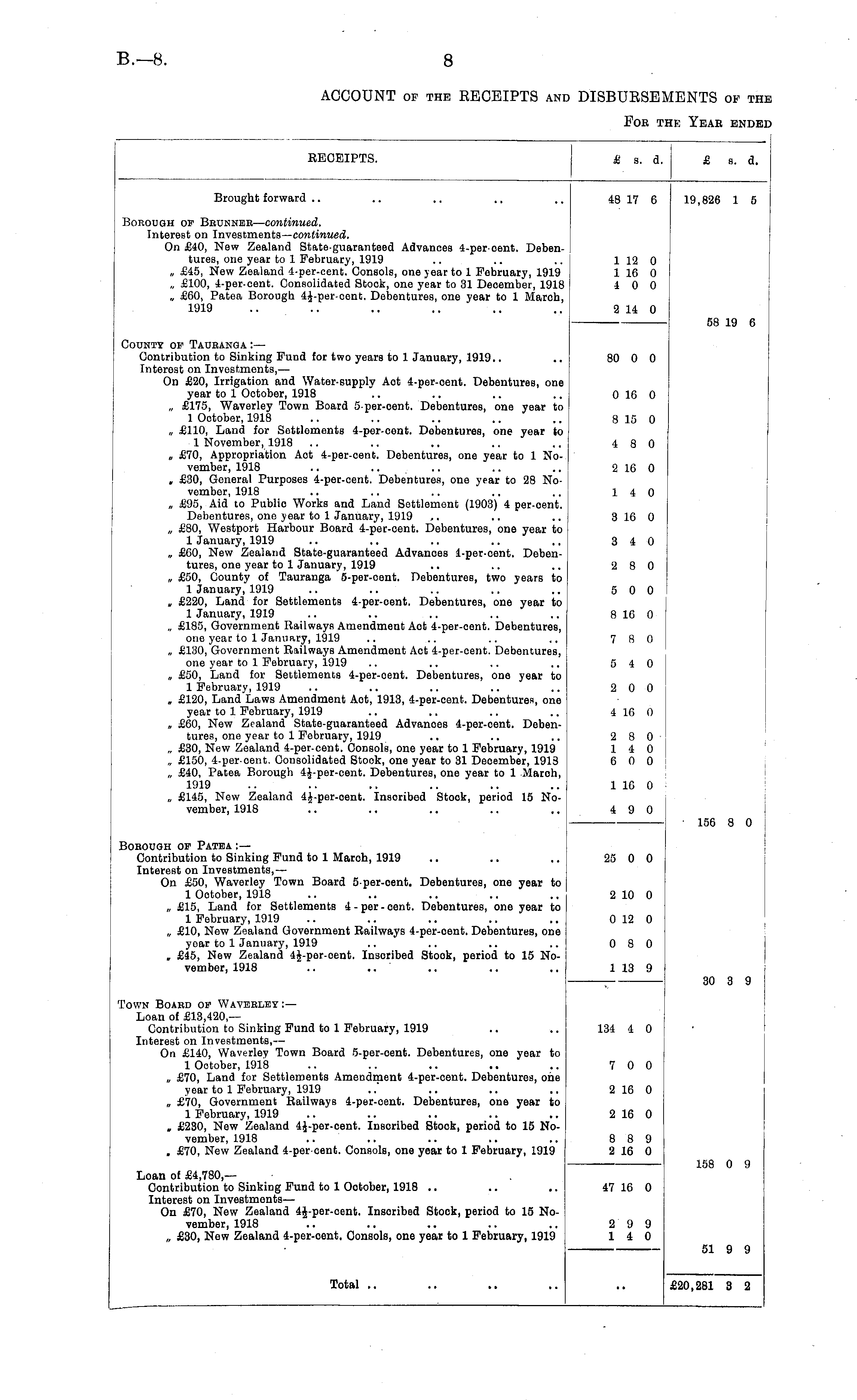 RECEIPTS. £ s. d. £ s. d. Brought forward 48 17 0 19,826 1 5 Borough of Brunner— continued. Interest on Investments— continued. On £40, New Zealand State-guaranteed Advances 4-per-cent. Debentures, one year to 1 February, 1919 „ £45, New Zealand 4-per-cent. Consols, one year to 1 February, 1919 „ £100, 4-per-cent. Consolidated Stook, one year to 31 December, 1918 „ £60, Patea Borough 4J-per-cent. Debentures, one year to 1 March, 1919 1 12 0 1 16 0 4 0 0 2 14 0 58 19 6 County of Tauranga:— Contribution to Sinking Fund for two years to 1 January, 1919.. Interost on Investments, — On £20, Irrigation and Water-supply Aot 4-per-oent. Debentures, one year to 1 October, 1918 „ £175, Waverley Town Board 5-per-oent. Debentures, one year to 1 October, 1918 „ £110, Land for Settlements 4-per-cent. Debentures, one year to 1 November, 1918 .. „ £70, Appropriation Aot 4-per-cent. Debentures, one year to 1 November, 1918 , £30, General Purposes 4-per-cent. Debentures, ono year to 28 November, 1918 „ £95, Aid to Publio Works and Land Settlement (1903) 4 per-cent. Debentures, ono yoar to 1 January, 1919 „ £80, Westport Harbour Board 4-per-oent. Debentures, one year to 1 January, 1919 „ £60, New Zealand State-guaranteed Advances l-per-cont. Debentures, one year to 1 January, 1919 „ £50, County of Tauranga 5-per-oent. Debentures, two years to 1 January, 1919 „ £220, Land for Settlements 4-per-cent. Debentures, one year to 1 January, 1919 „ £185, Government Railways Amendment Aot 4-per-oent. Debentures, one year to 1 January, 1919 „ £130, Government Railways Amendment Aot 4-per-cent. Debentures, one year to 1 February, 1919 „ £50, Land for Settlements 4-per-oent. Debentures, one year to 1 February, 1919 „ £120, Land Laws Amendment Aot, 1913, 4-per-cent. Debentures, one year to 1 February, 1919 „ £60, New Zealand State-guaranteed Advances 4-per-oent. Debentures, one year to 1 February, 1919 „ £30, Now Zealand 4-per-cont. Consols, one year to 1 February, 1919 „ £150, 4-por-oent. Consolidated Stock, one year to 31 December, 1913 „ £40, Patea Borough 4J-per-cent. Debentures, one year to 1 Maroh, 1919 „ £145, New Zealand 4£-per-oent. Inscribed Stock, period 15 November, 1918 80 0 0 0 16 0 8 15 0 4 8 0 2 16 0 14 0 3 16 0 3 4 0 2 8 0 5 0 0 8 16 0 7 8 0 5 4 0 2 0 0 4 16 0 2 8 0 14 0 6 0 0 1 16 0 4 9 0 156 8 0 Borough of Patea:— Contribution to Sinking Fund to 1 Maroh, 1919 Interest on Investments, — On £50, Waverley Town Board 5-per-oent. Debentures, one year to 1 Ootober, 1918 „ £15, Land for Settlements 4-per-cent. Debentures, one year to 1 February, 1919 „ £10, Now Zealand Government Railways 4-per-oont. Debentures, ono yoar to 1 January, 1919 .. .. .. .. „ £45, New Zealand 4J-per-cent. Insoribed Stook, period to 15 November, 1918 .. .. 25 0 0 2 10 0 0 12 0 0 8 0 1 13 9 Town Board of Waverley :— Loan of £13,420 — Contribution to Sinking Fund to 1 February, 1919 Interest on Investments, — On £140, Waverley Town Board 5-per-oent. Debentures, one year to 1 Ootober, 1918 „ £70, Land for Settlements Amendment 4-per-cent. Debentures, one year to 1 February, 1919 „ £70, Government Railways 4-per-cent. Debentures, one year to 1 February, 1919 „ £230, New Zealand 4J-per-cent. Inscribed Stock, period to 15 November, 1918 , £70, New Zealand 4-per cent. Consols, one year to 1 February, 1919 30 3 9 134 4 0 7 0 0 2 16 0 2 16 0 8 8 9 2 16 0 Loan of £4,780 — Contribution to Sinking Fund to 1 October, 1918 Interest on Investments — On £70, New Zealand 4J-per-oent. Insoribed Stock, period to 15 November, 1918 „ £30, Now Zealand 4-per-oent. Consols, one year to 1 February, 1919 158 0 9 47 16 0 2 9 9 14 0 51 9 9 Total .. £20,281 3 2